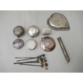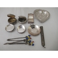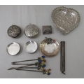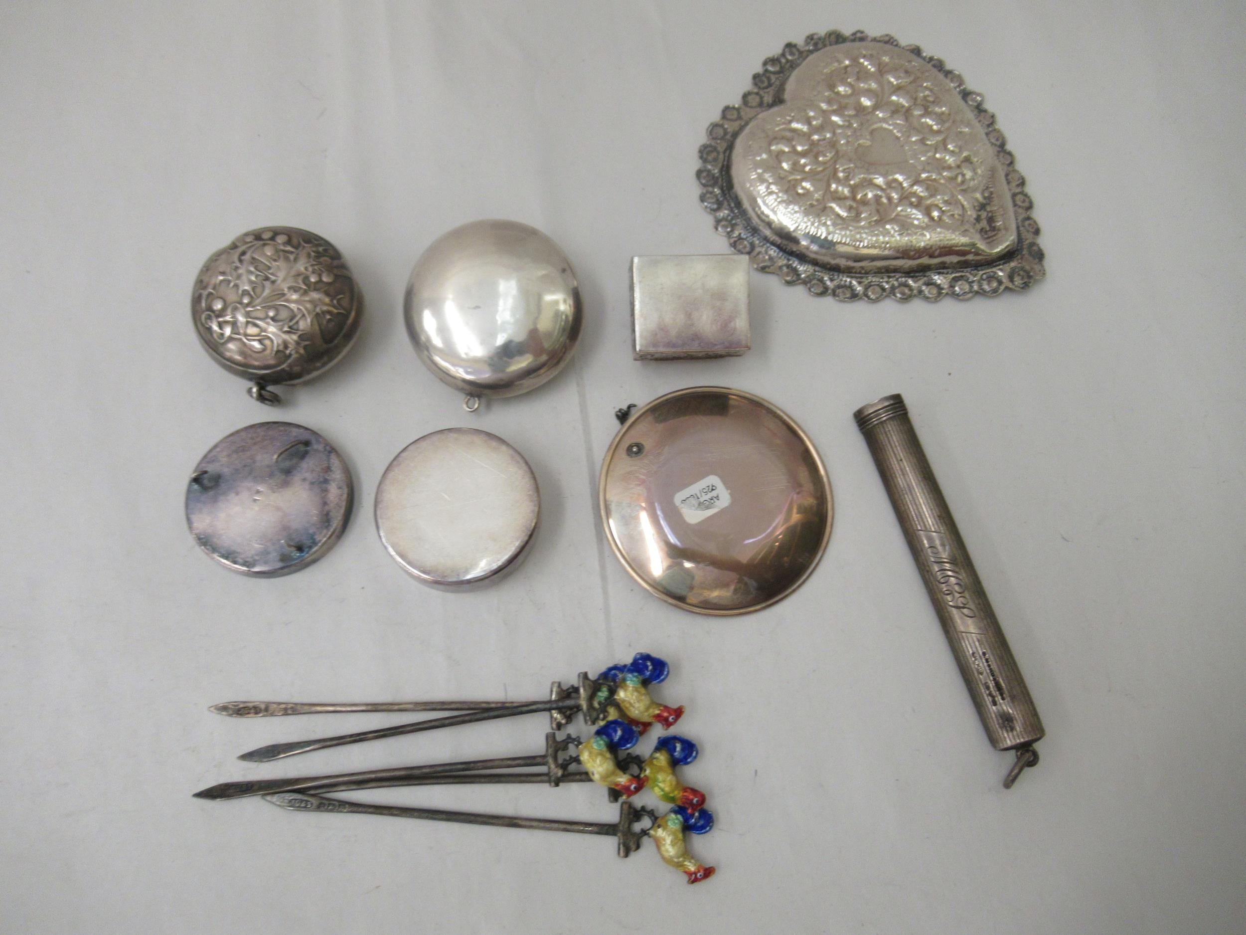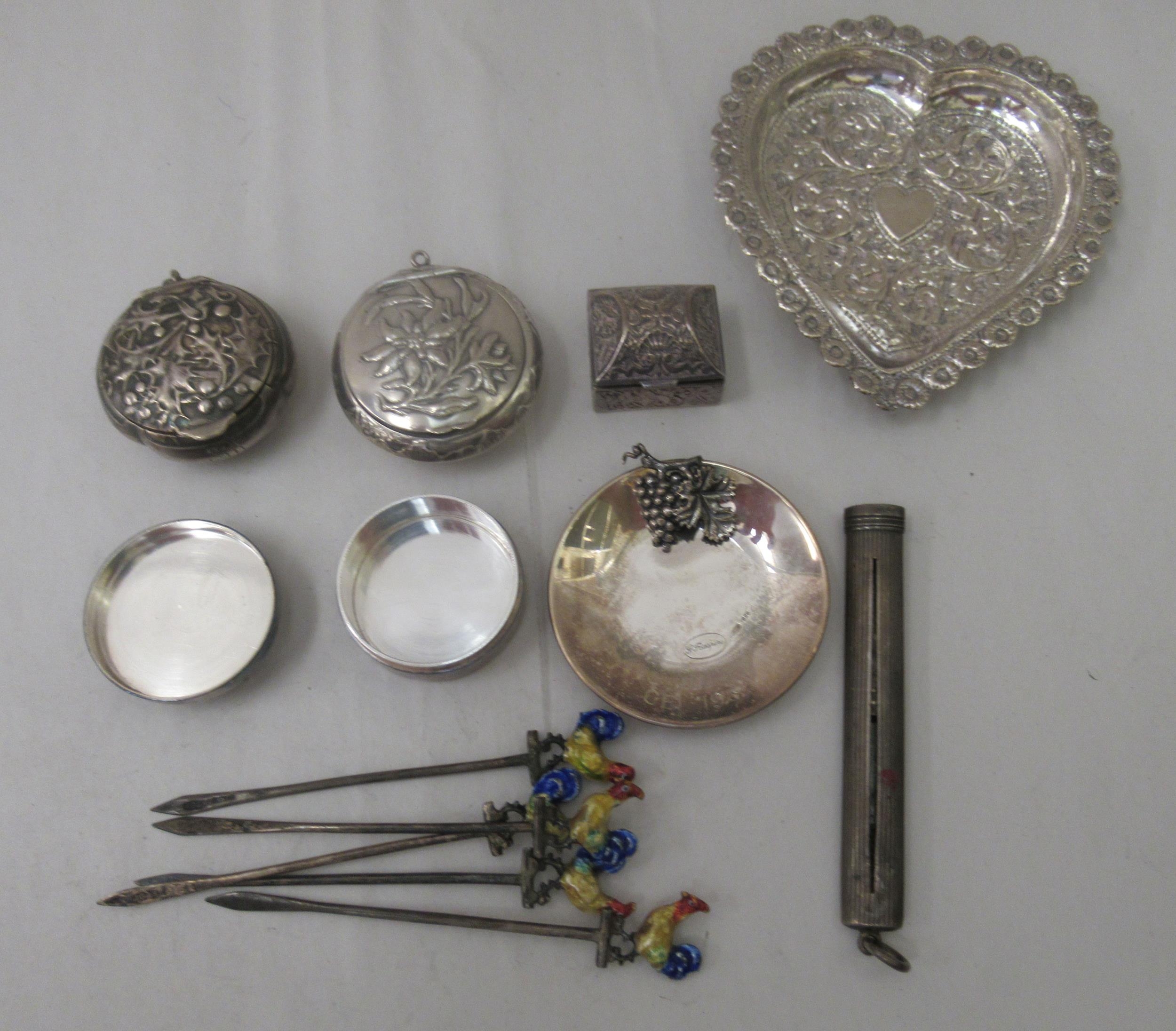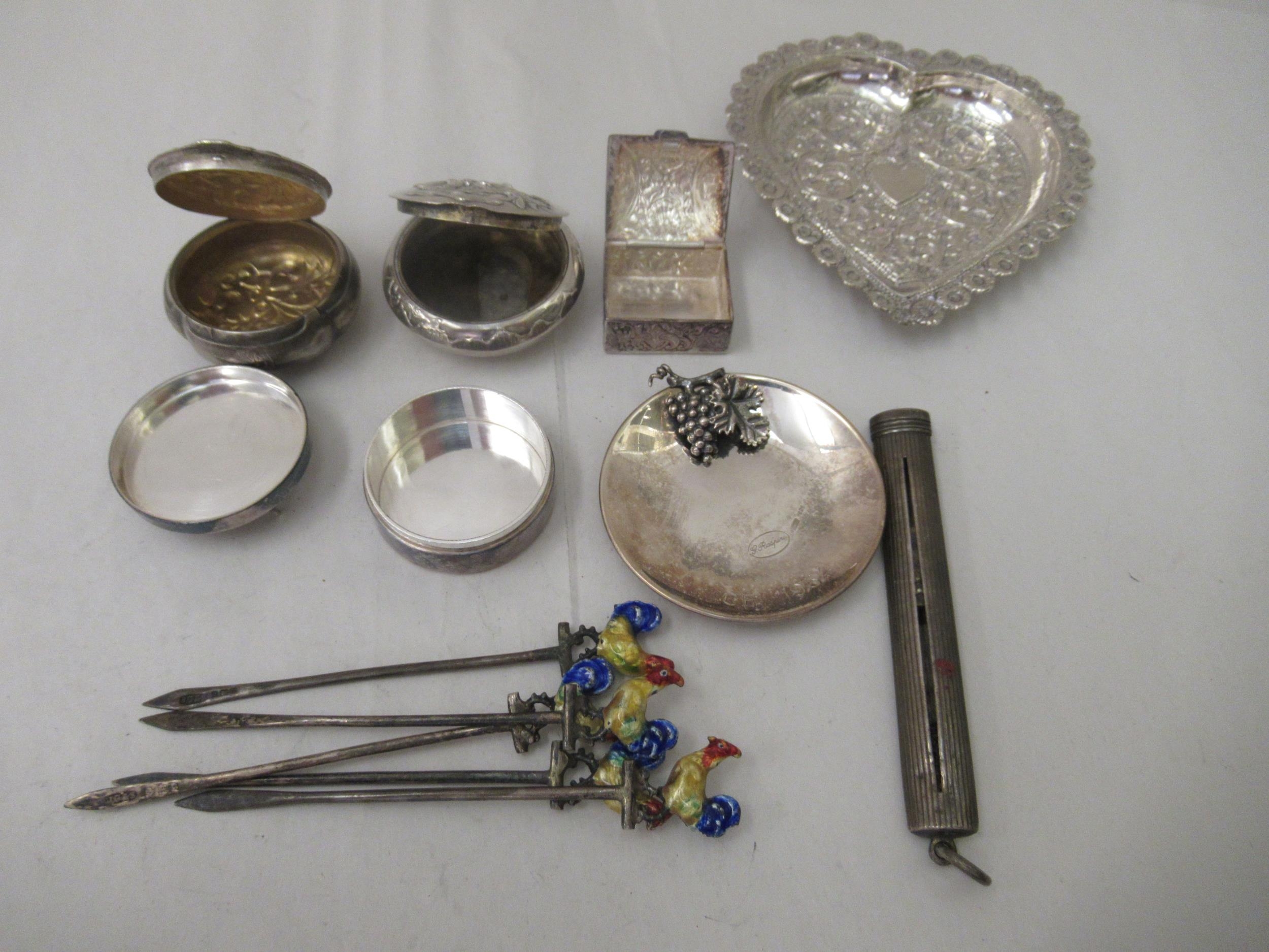 Silver and white metal collectables: to include a set of five silver cocktail sticks, surmounted by enamelled chickens Birmingham 1932