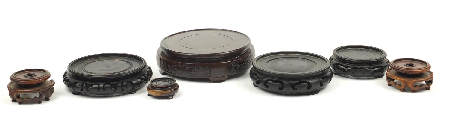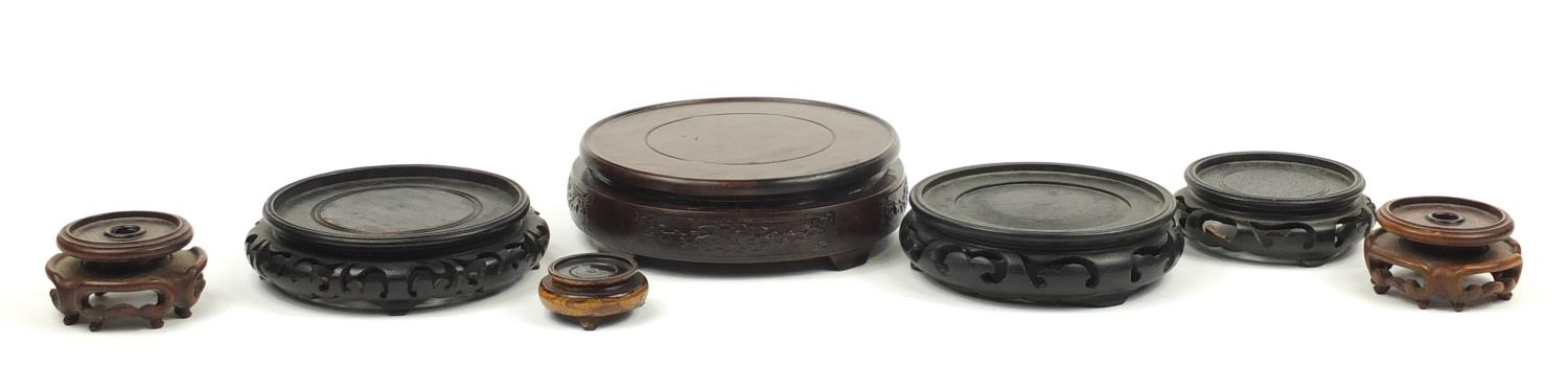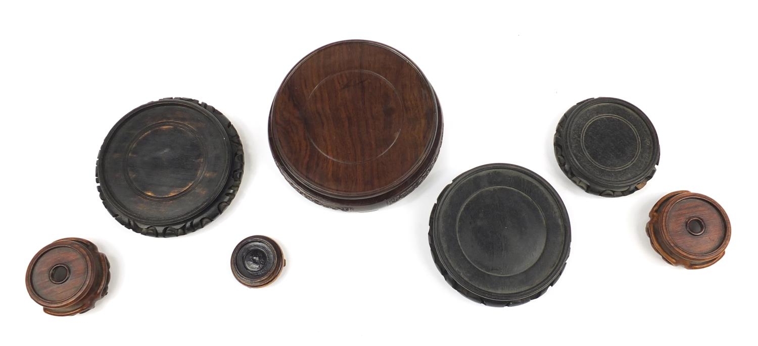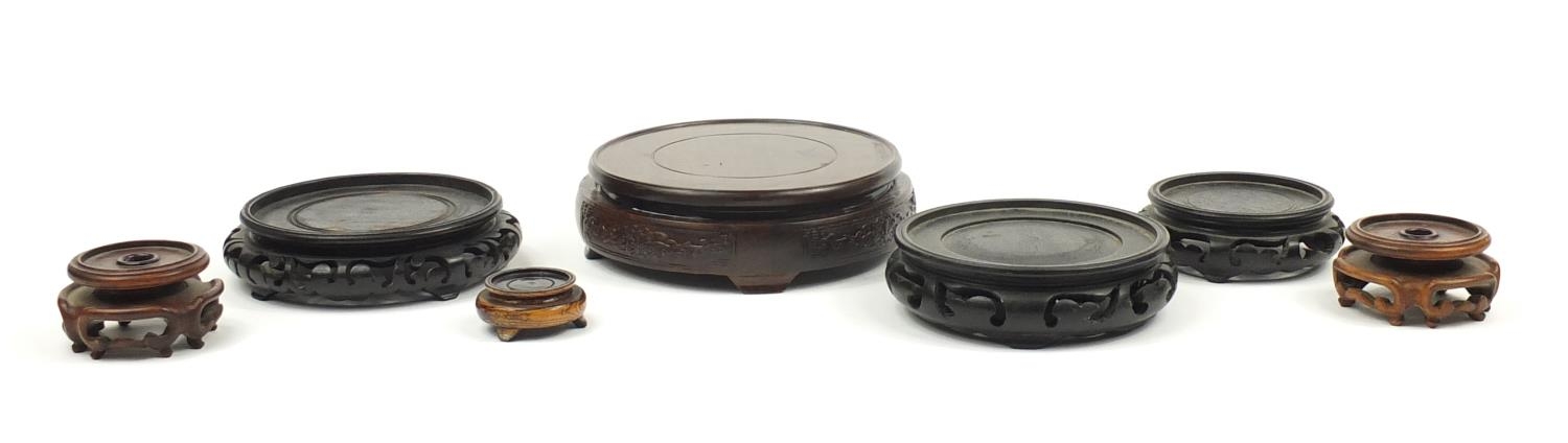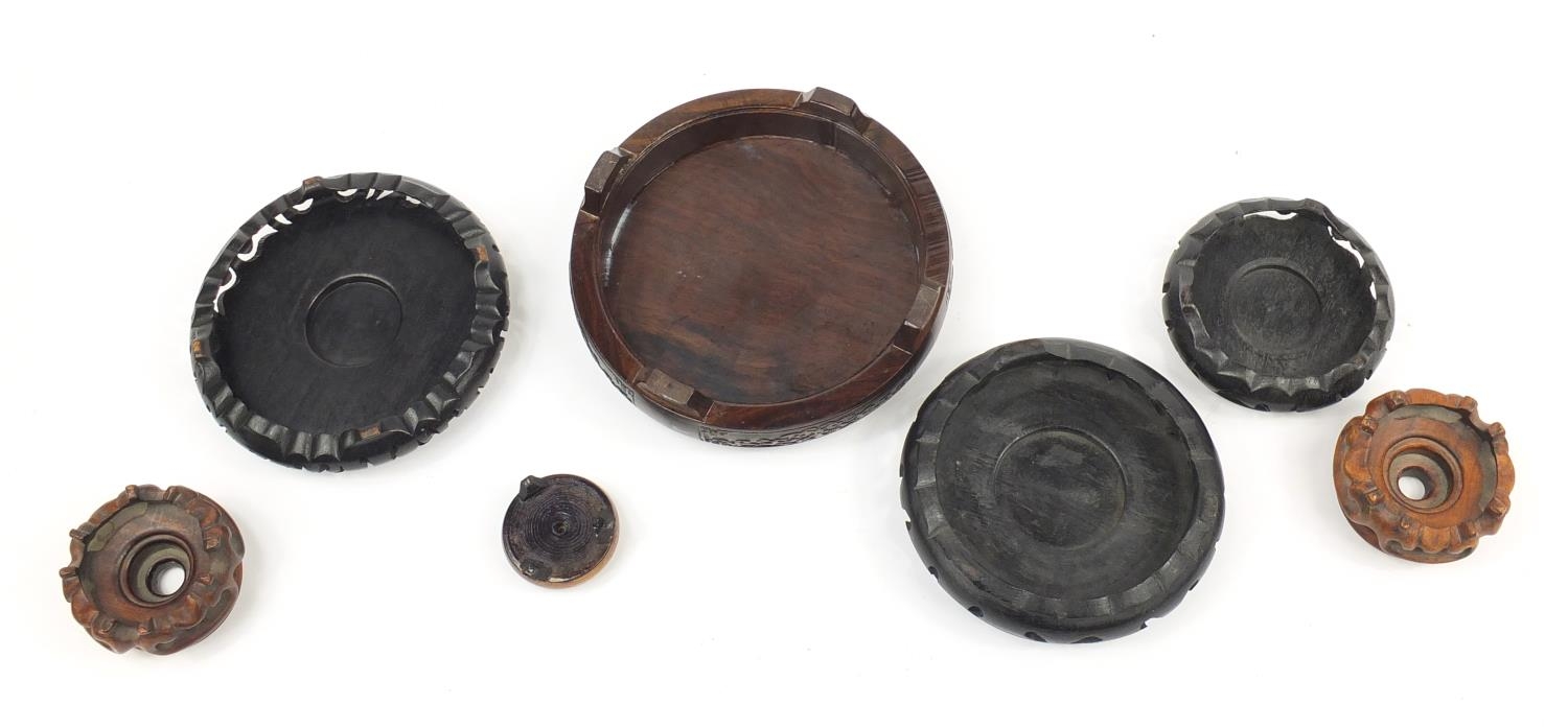 Seven Chinese carved hardwood stands including two pairs, the largest 16cm in diameter