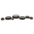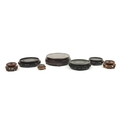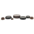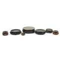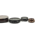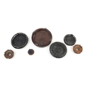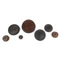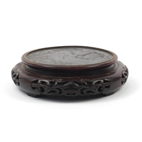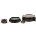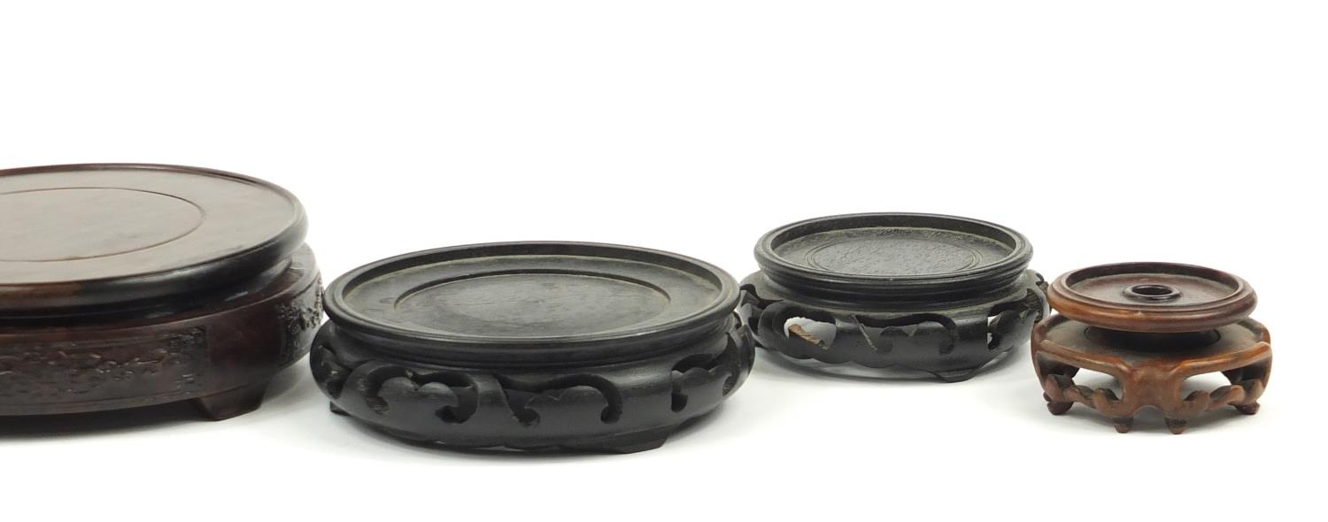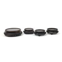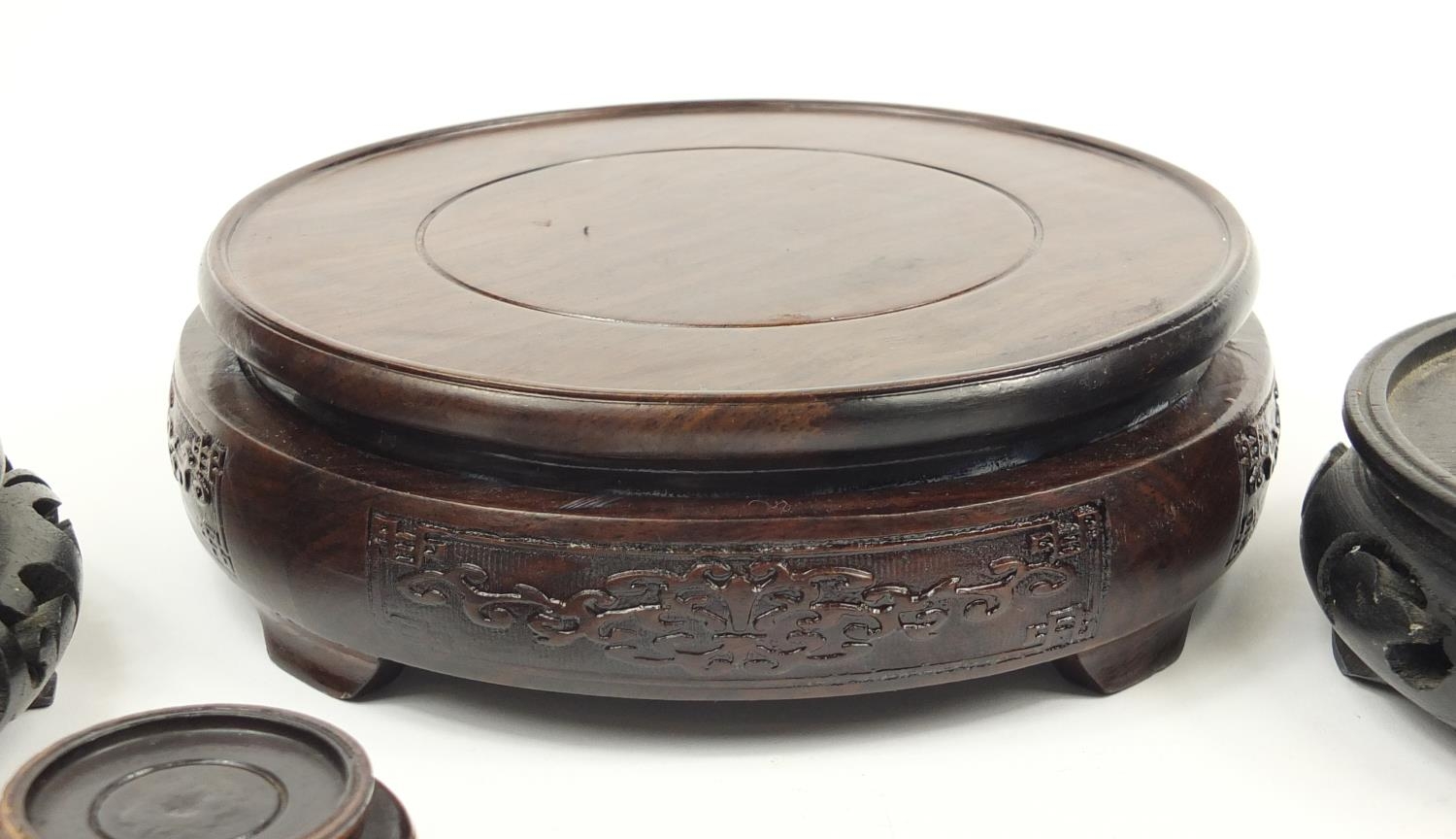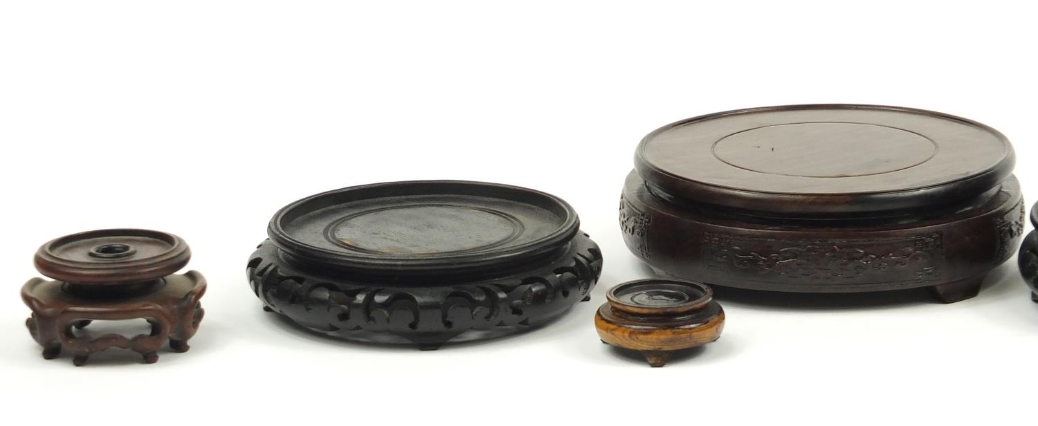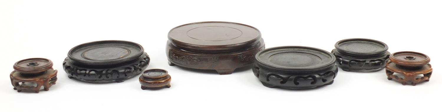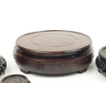 Seven Chinese carved hardwood stands including two pairs, the largest 16cm in diameter