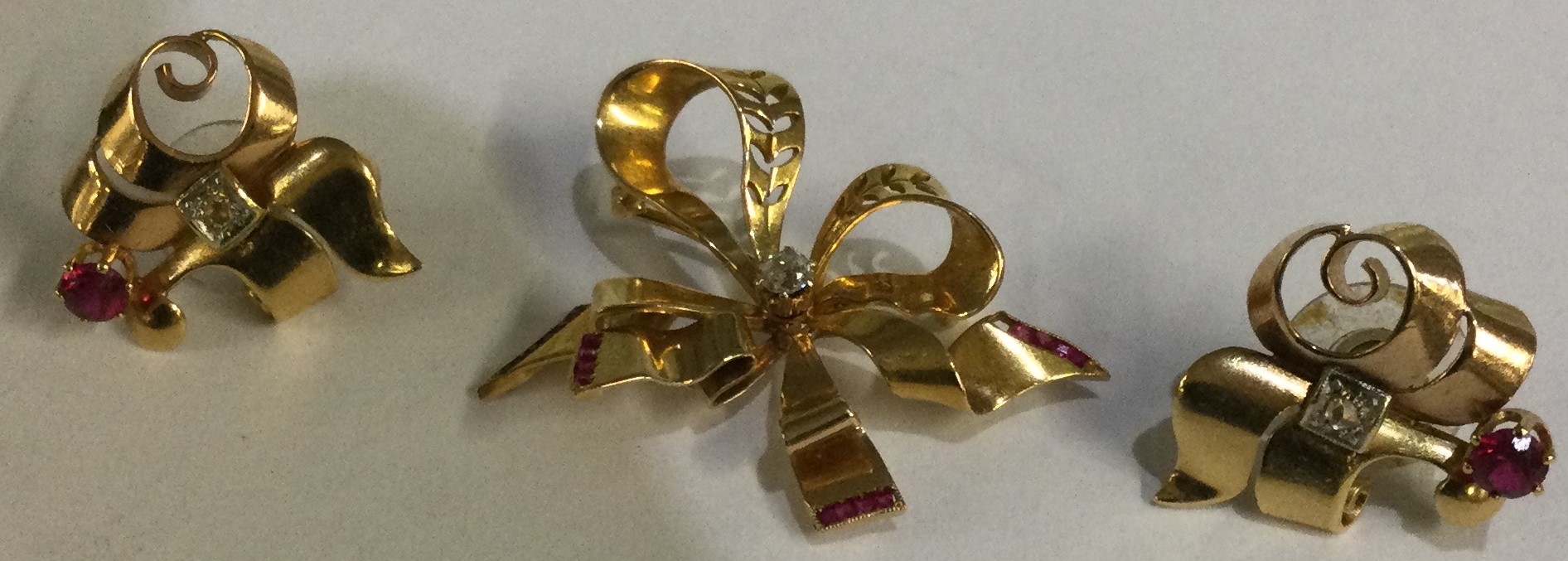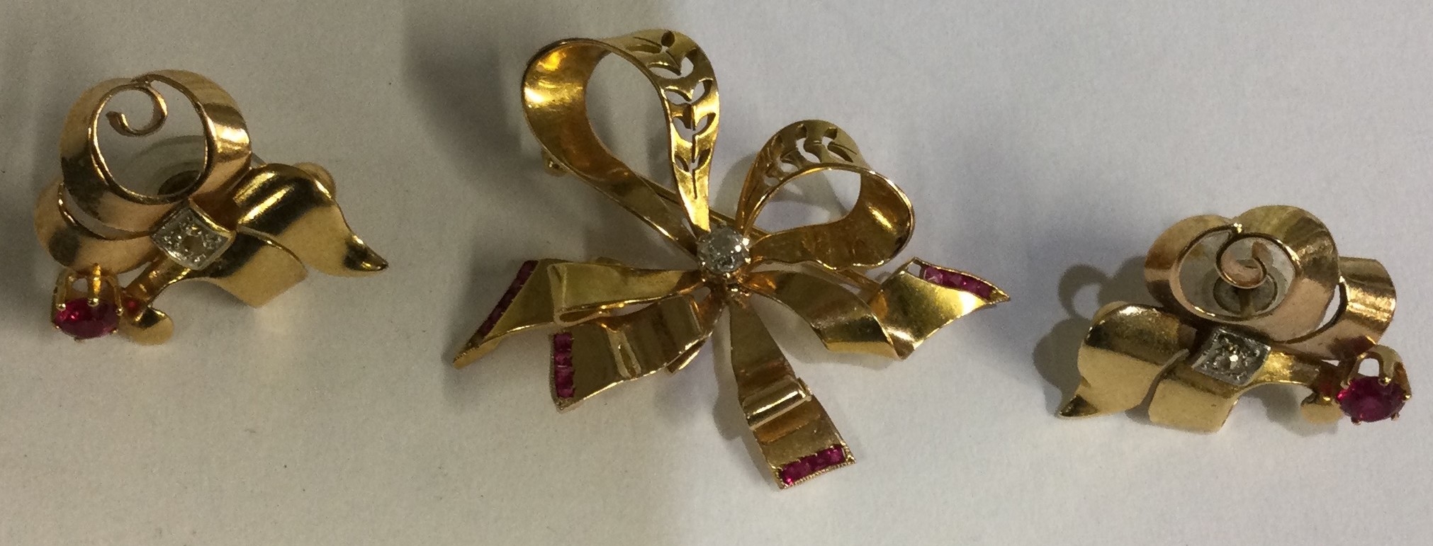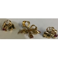 An attractive 18 carat gold French ruby and diamond brooch together with matching earrings. Approx. 12 grams. Est. £450 - £550.