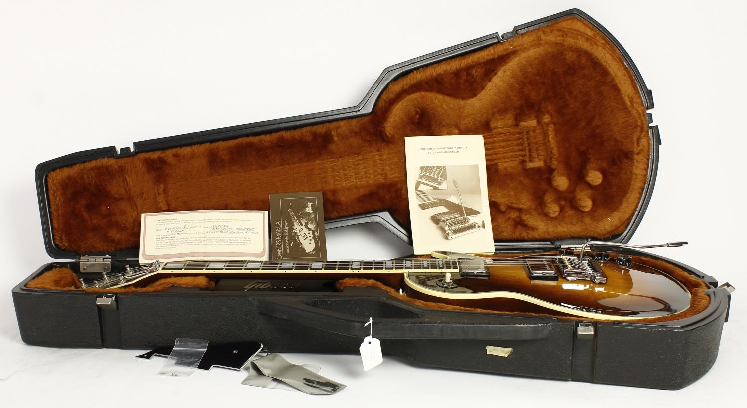 1984 Gibson Les Paul Custom Kahler electric guitar; Body: tobacco sunburst finish, a few light marks but generally very good; Neck: good; Fretboard: ebony; Frets: good; Electrics: working; Hardware: generally very good, Patent Applied For stickers still intact to pickup rings, pickguard currently removed but included, minor tarnishing to smaller metal parts; Case: original Gibson Protector case with original papers and tools; Weight: 5.25kg; Overall condition: very good