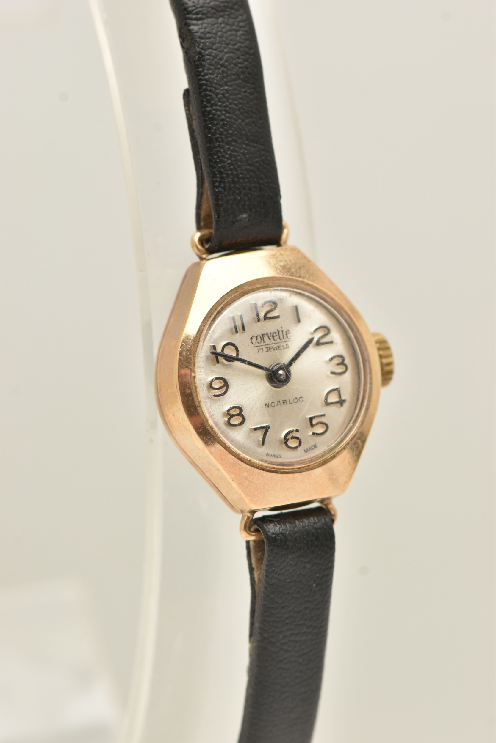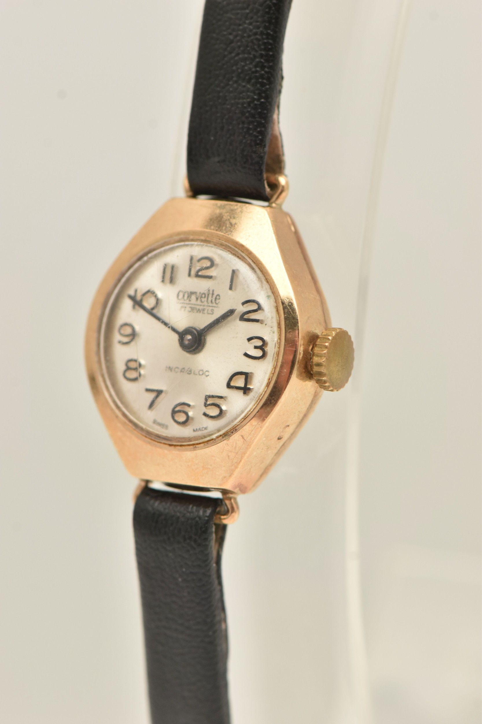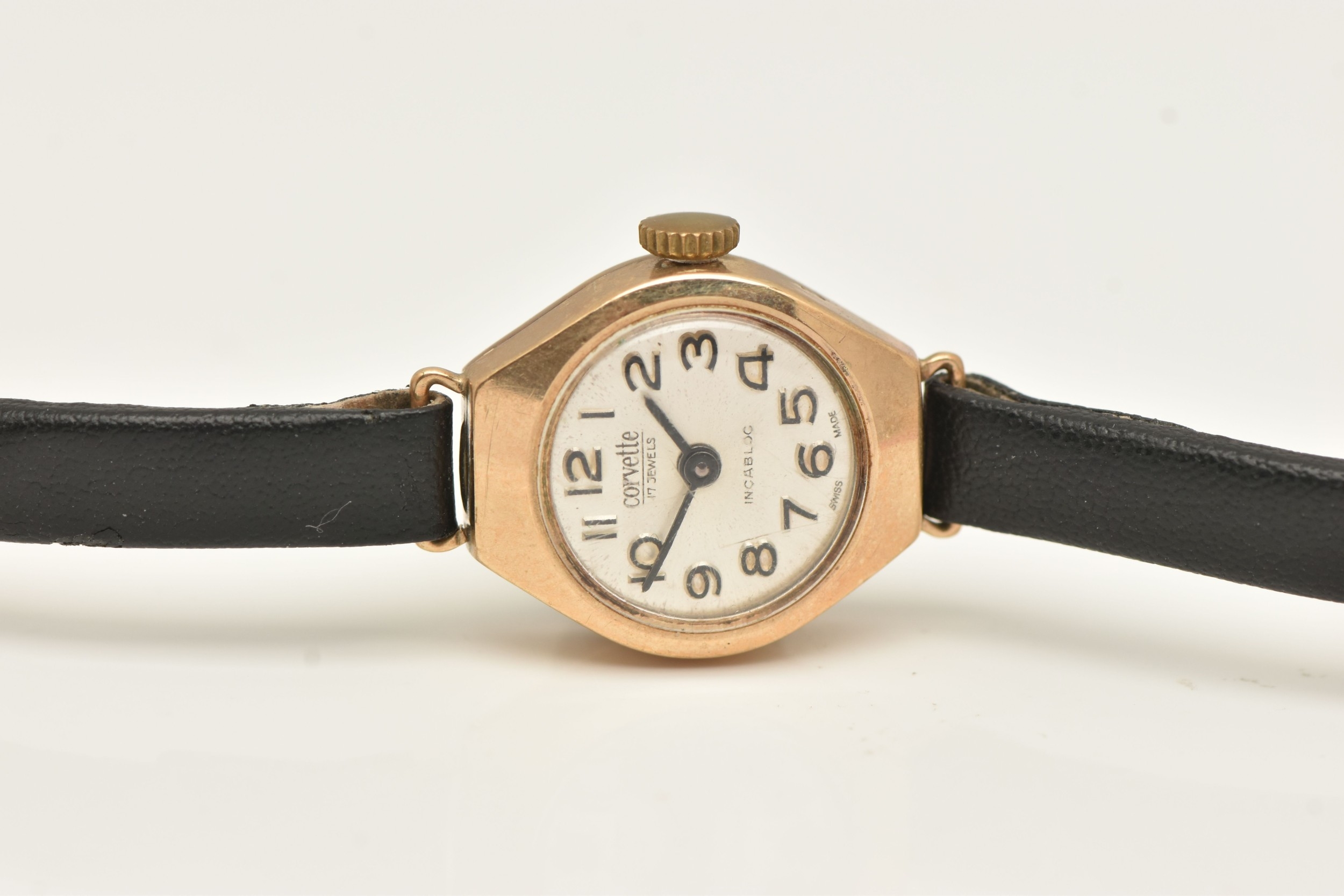 A 9CT YELLOW GOLD LADIES WRISTWATCH, hand wound movement, round dial signed 'Corvette', yellow gold case, approximate case width 16mm, inside case back hallmarked 9ct Birmingham, approximate gross weight 1.3 grams, (condition report: watch winds but not running, we cannot guarantee the working condition of the watch)