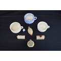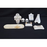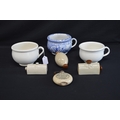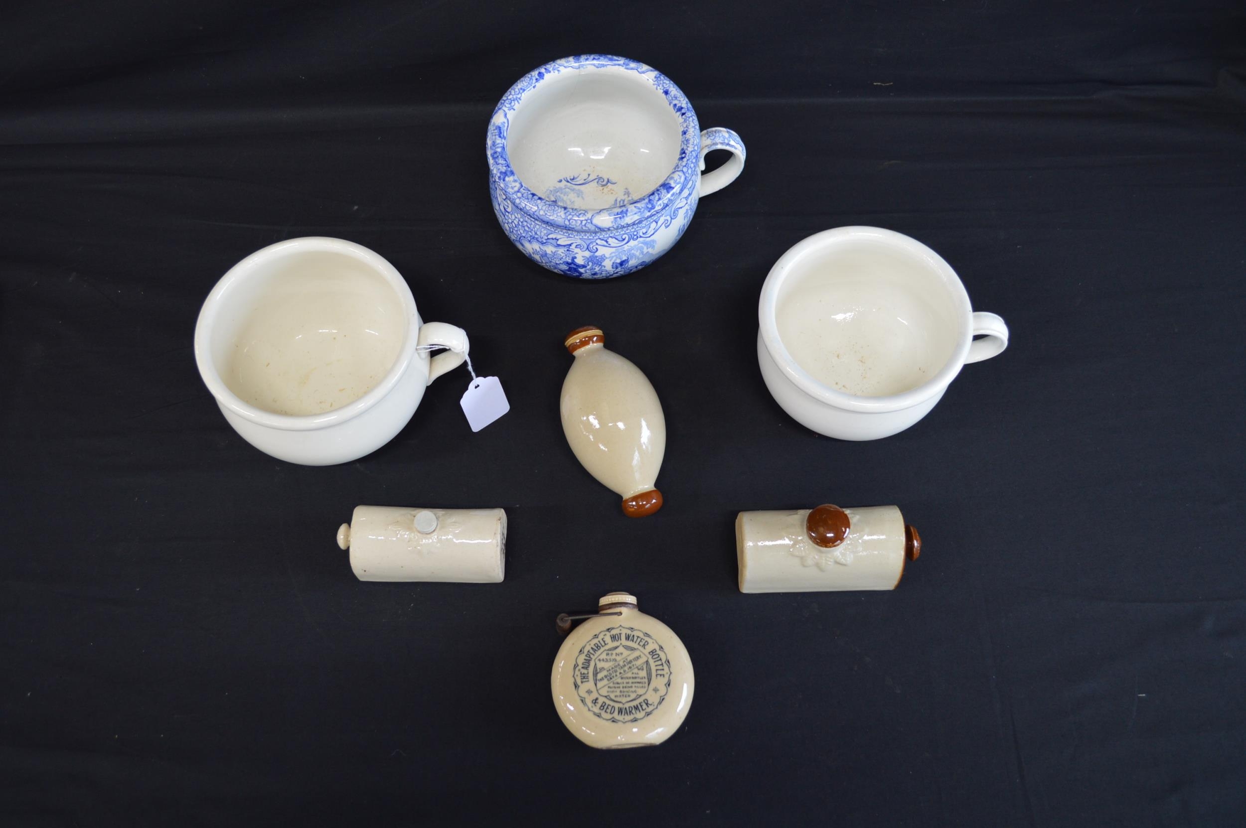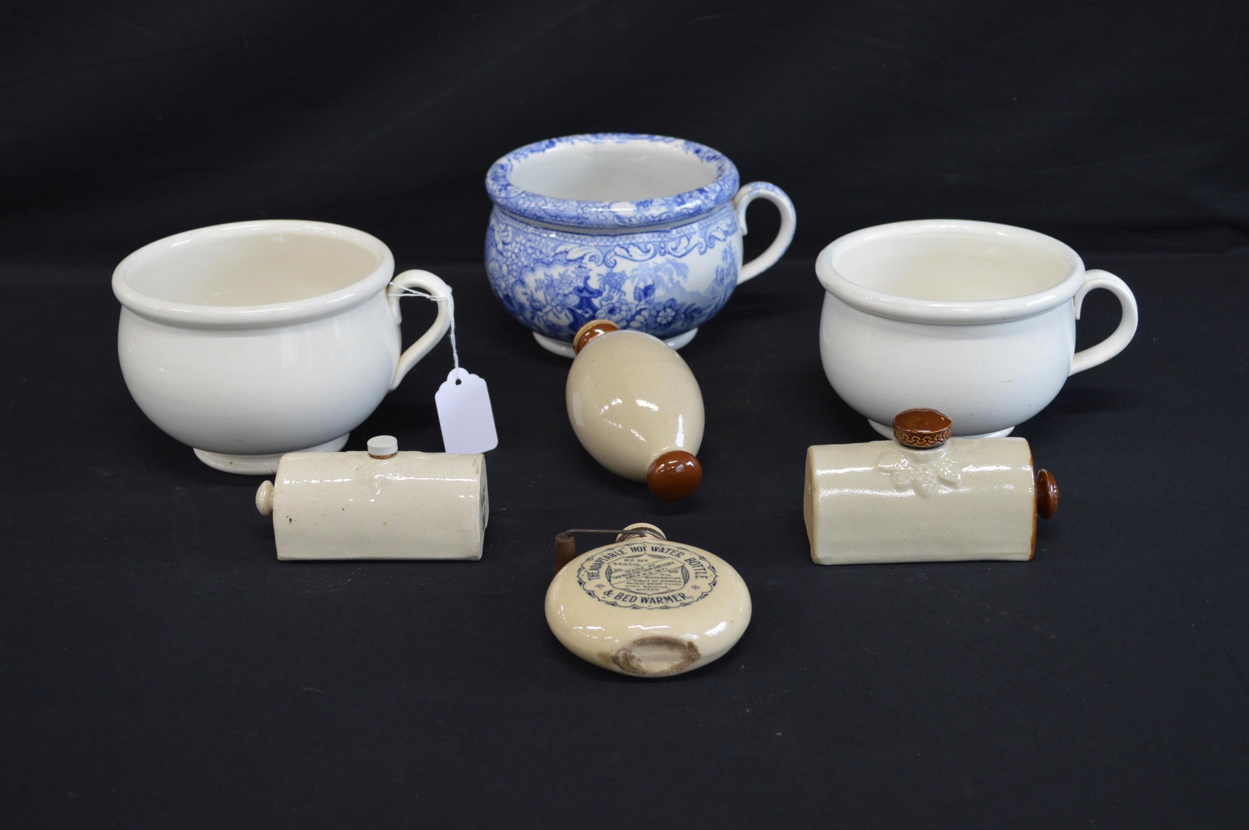 Group of three small chamber pots together with miniature Old Fulham Pottery Adaptable bed warmer - 9cm wide and three other miniature hot water bottles