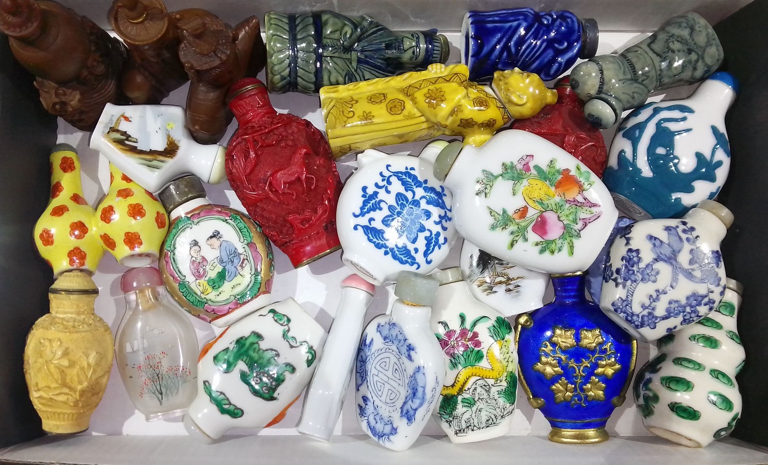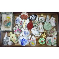 A collection of approx. 26 Chinese snuff bottles, mainly porcelain, also including cinnabar lacquer, metal and rock crystal.