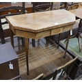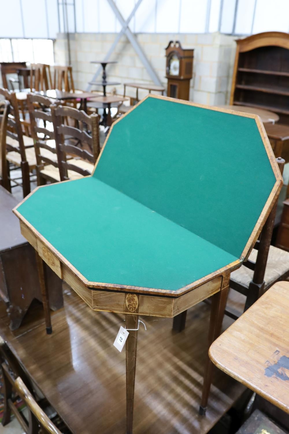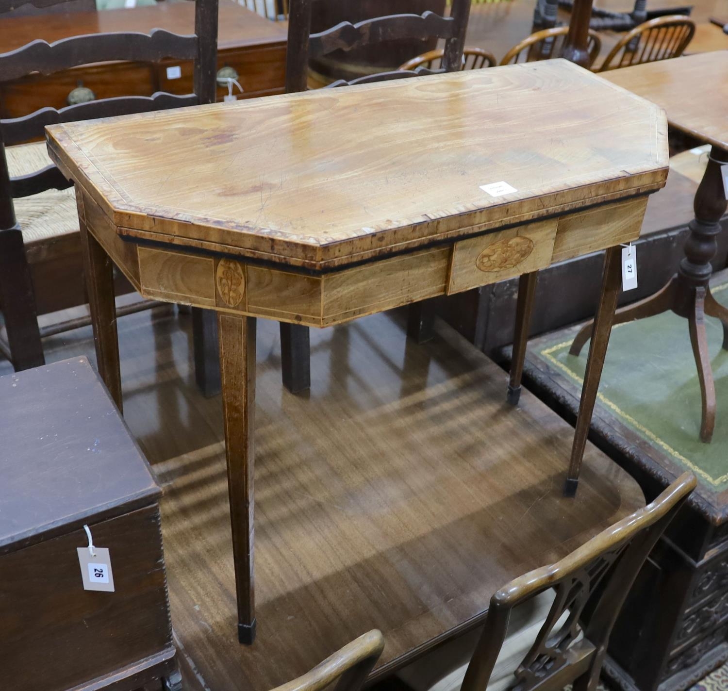 A George III banded and inlaid mahogany folding card table, width 91cm, depth 44cm, height 75cm