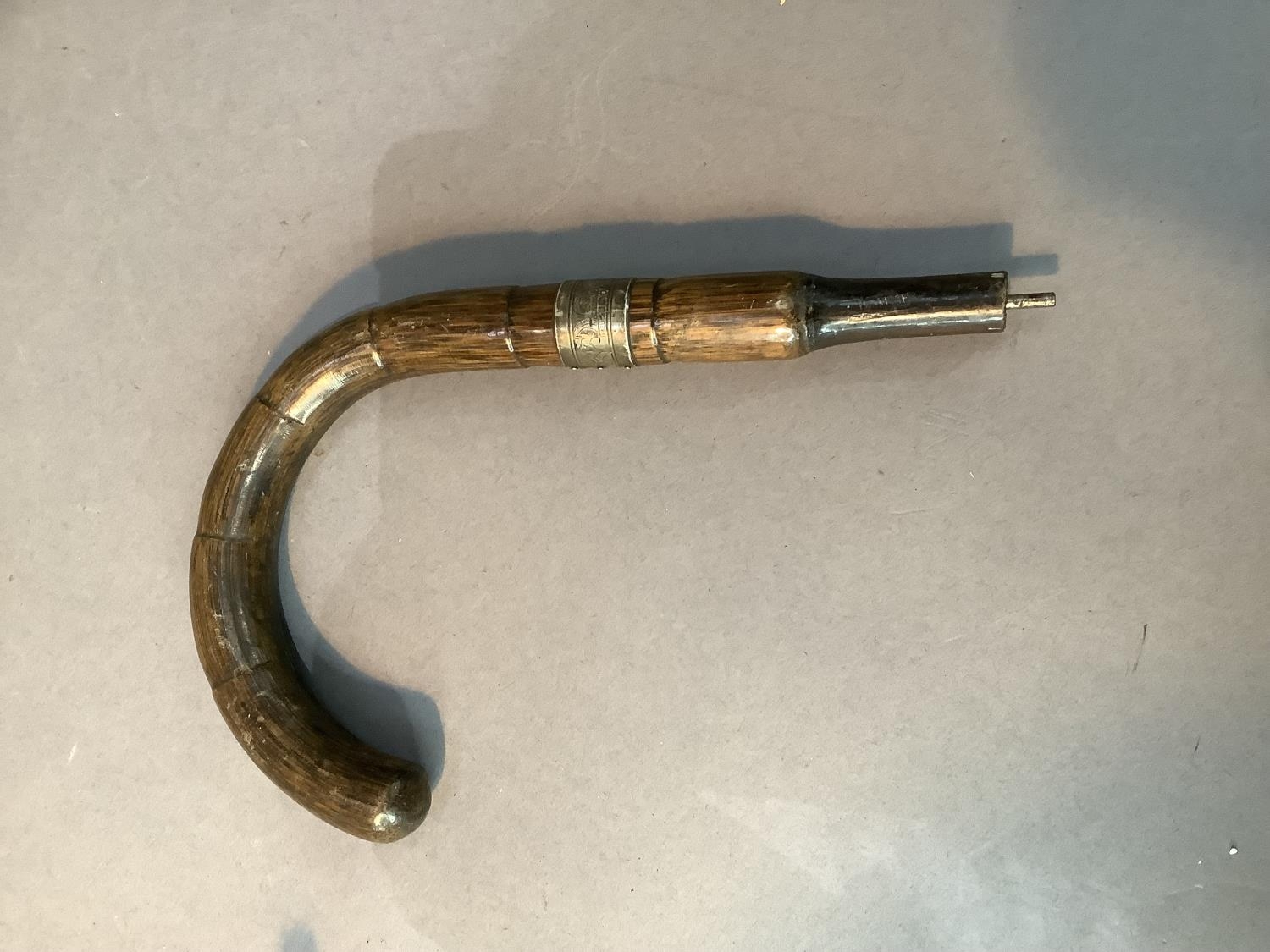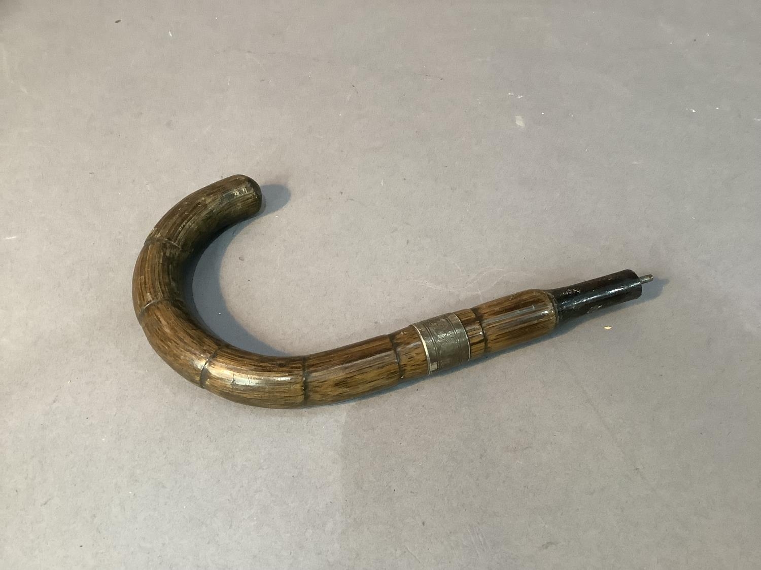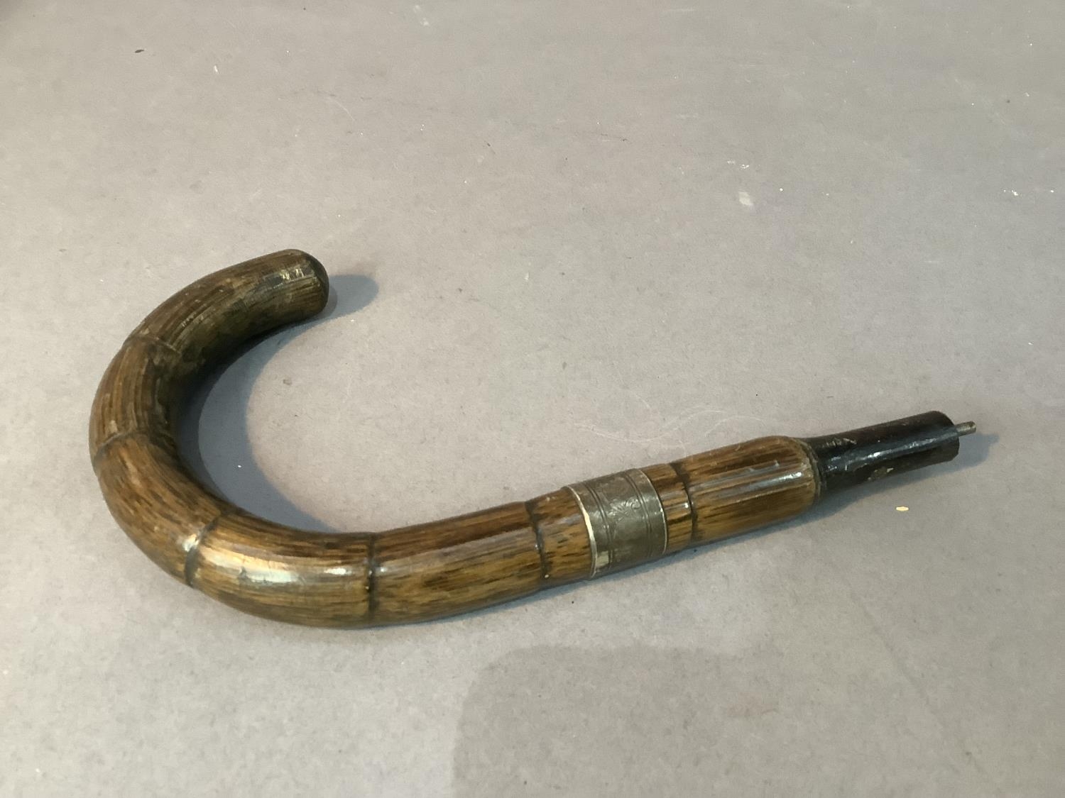 A malacca cane umbrella handle with engraved silver band