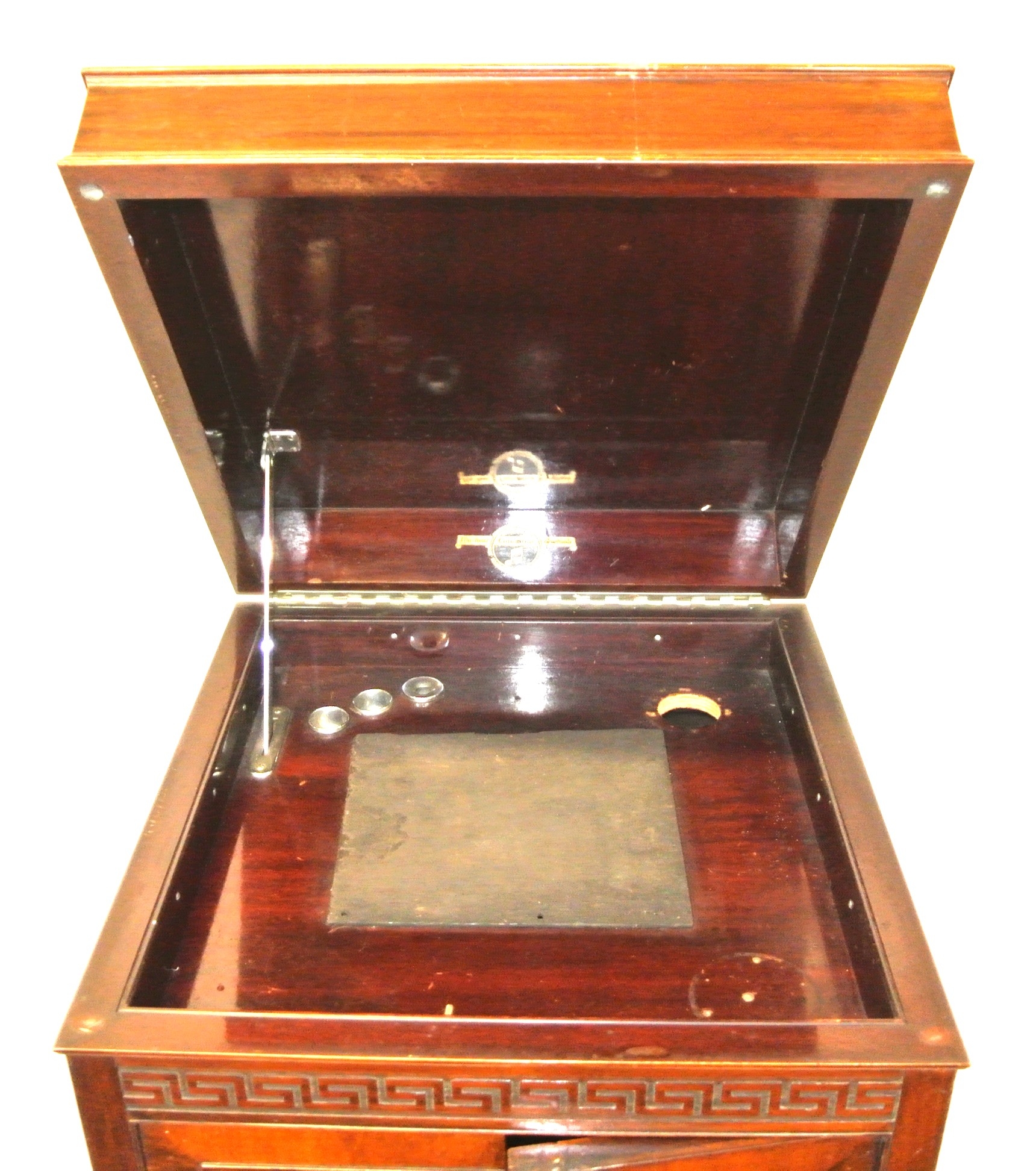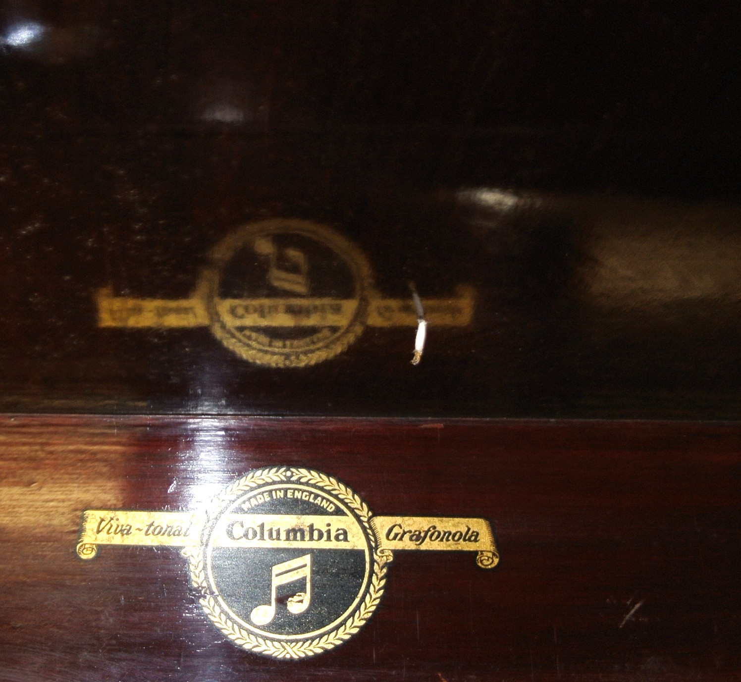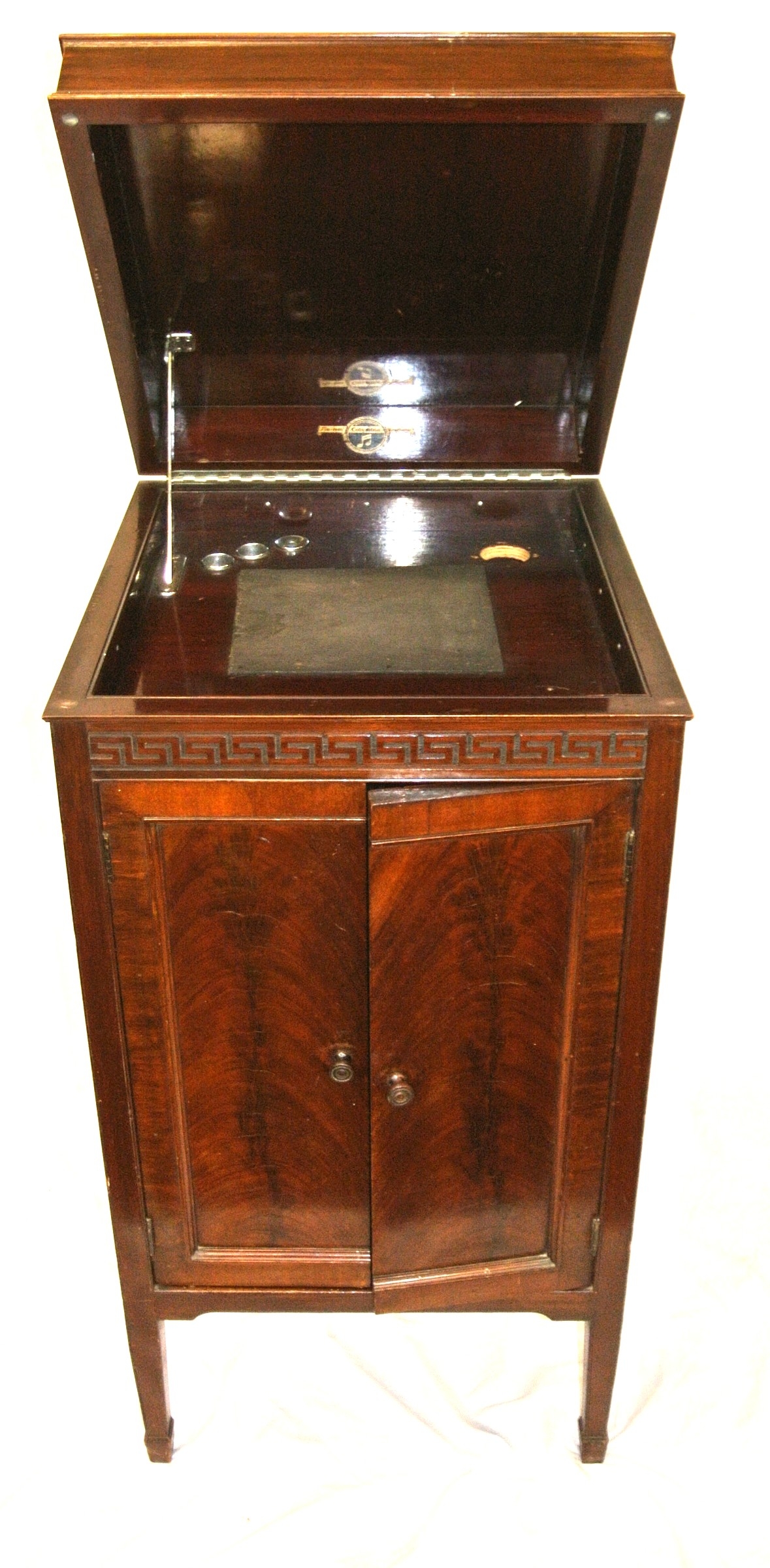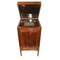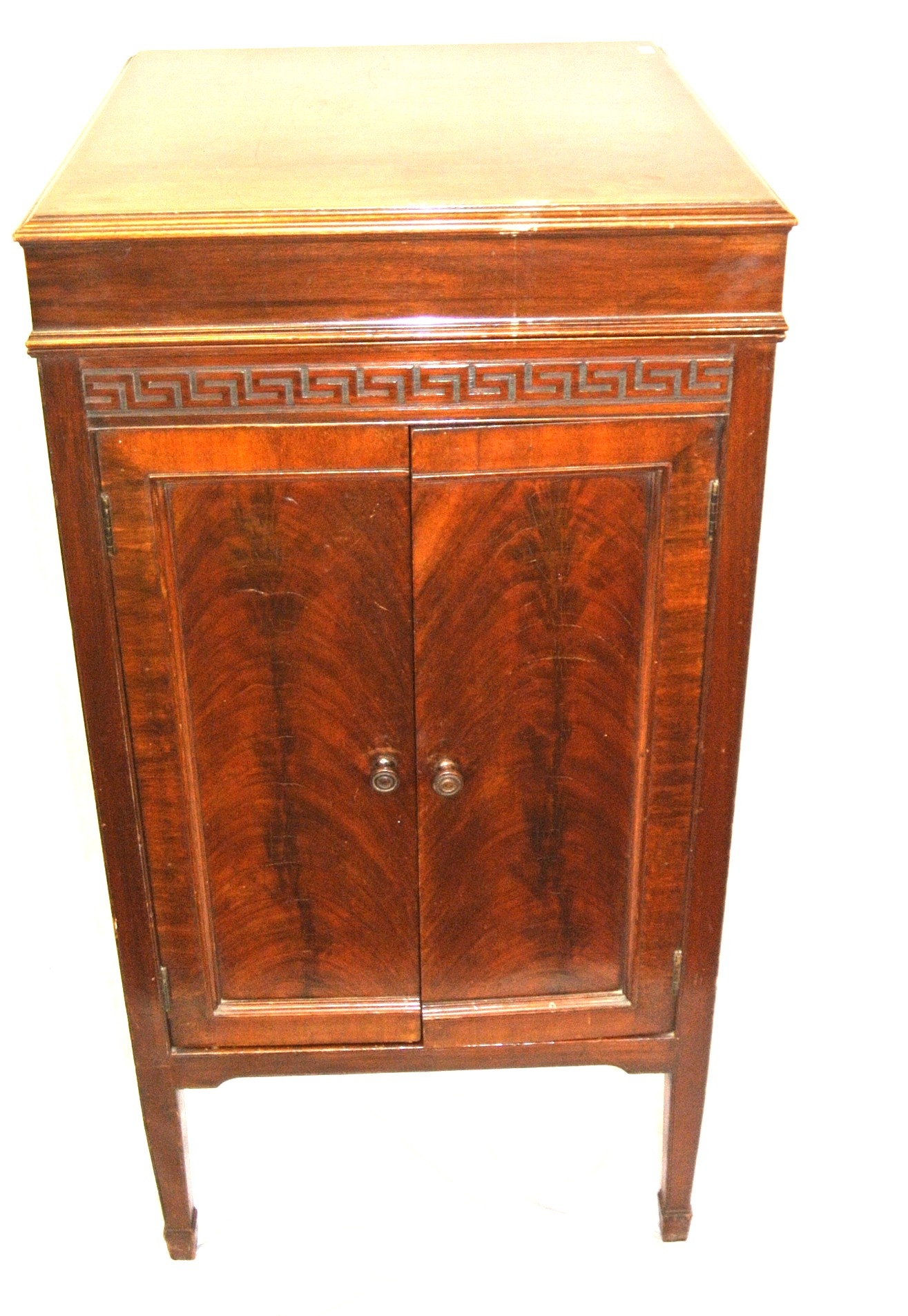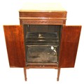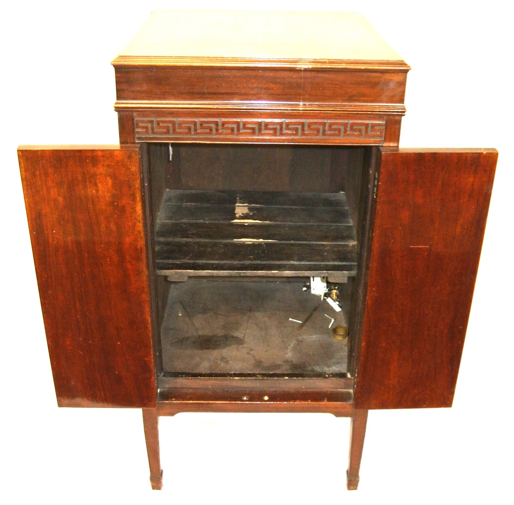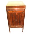 Converted Columbia Grafonola Music cabinet with lift-up lid, shelved press, on square tapering legs