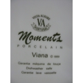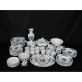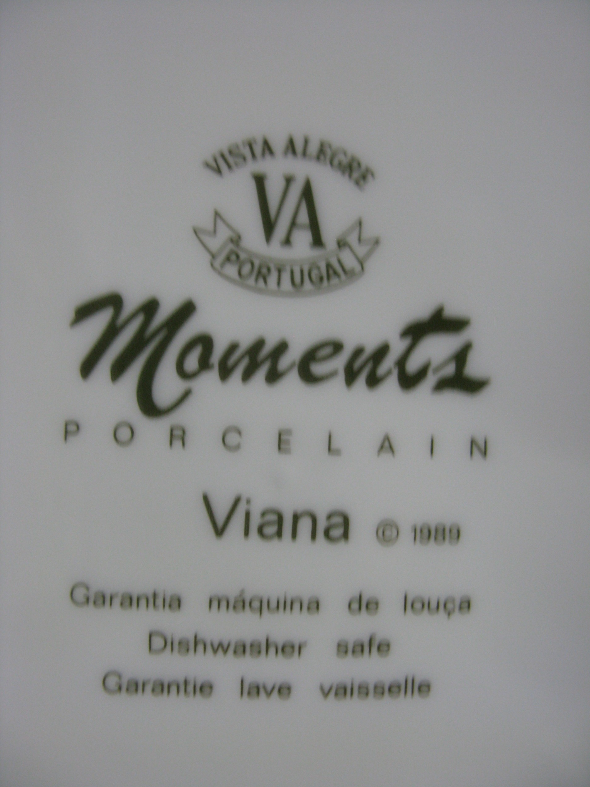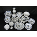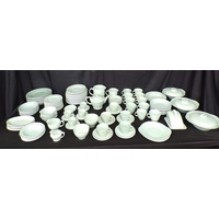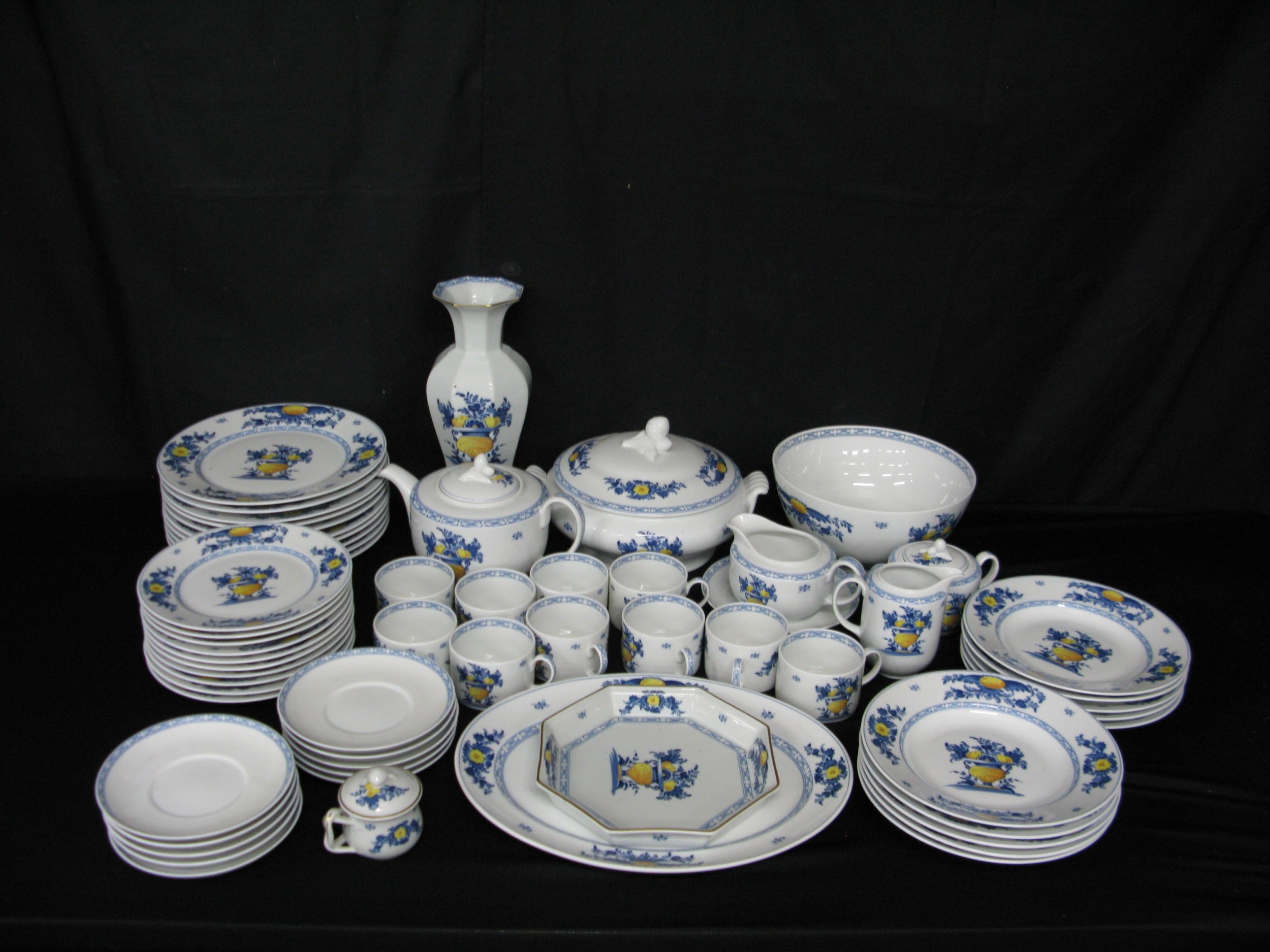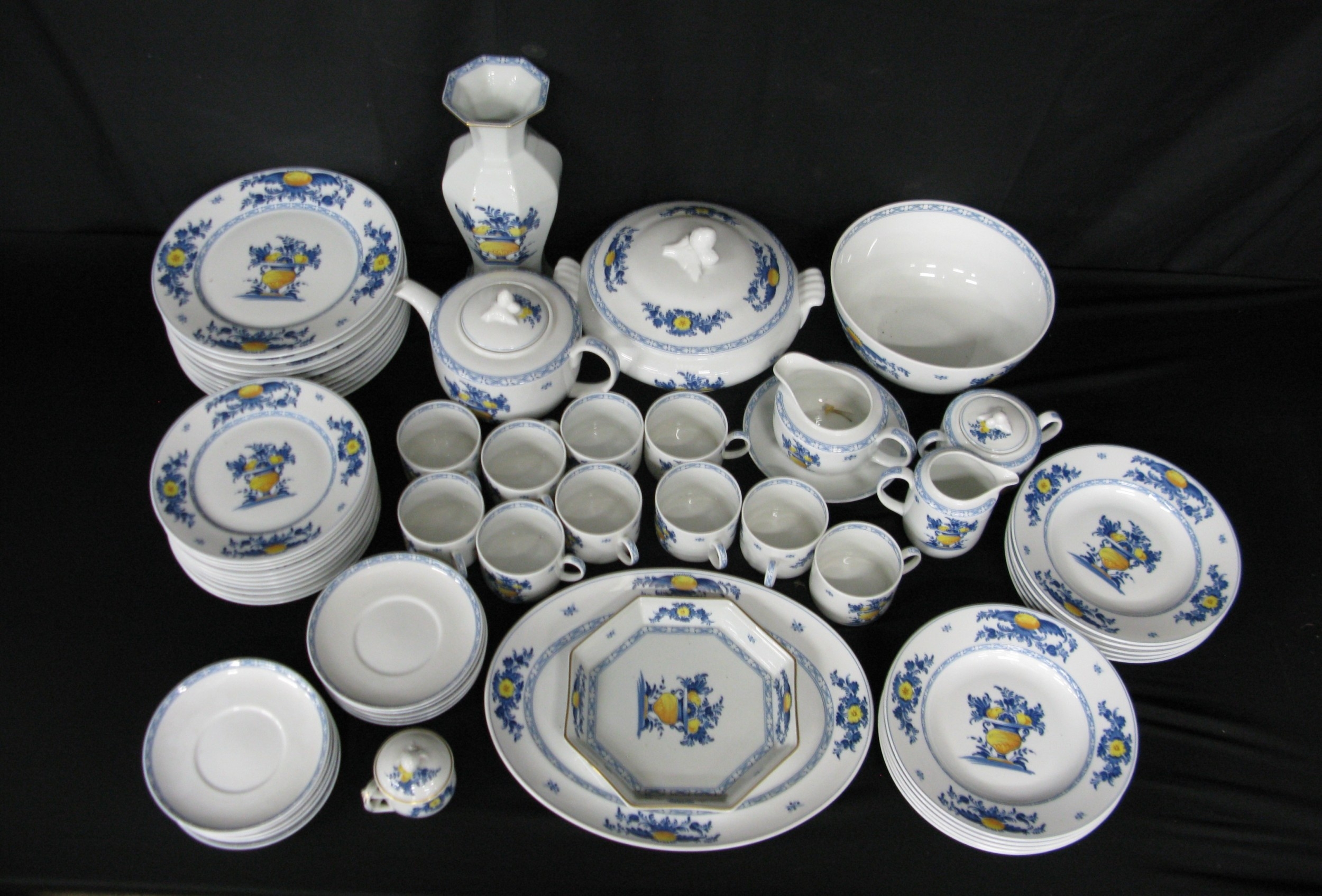 Portuguese Vista Alegre porcelain part tea and dinner ware to comprise: eight tea cups, ten 16.5cm saucers, milk jug, lidded sugar bowl, teapot, ten 21.5cm plates, ten 23cm bowls, ten 26.5cm plates, a 30cm lidded tureen, one 21cm octagonal plate, 24.5cm serving bowl, 36cm meat plate, 18cm gravy/sauce jug & saucer, a lidded pot du creme and one 29.5cm tall vase