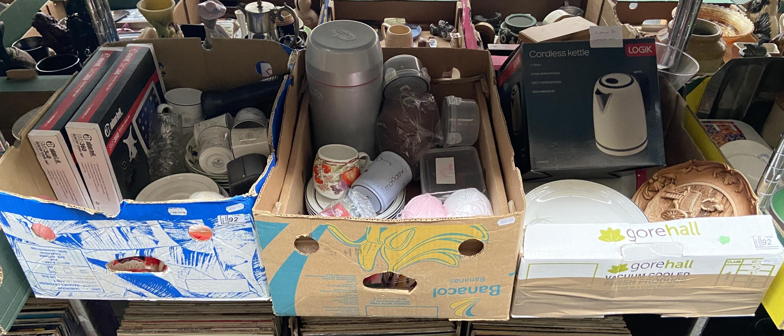 3 Boxes containing wool and kitchenalia including a new Logik kettle