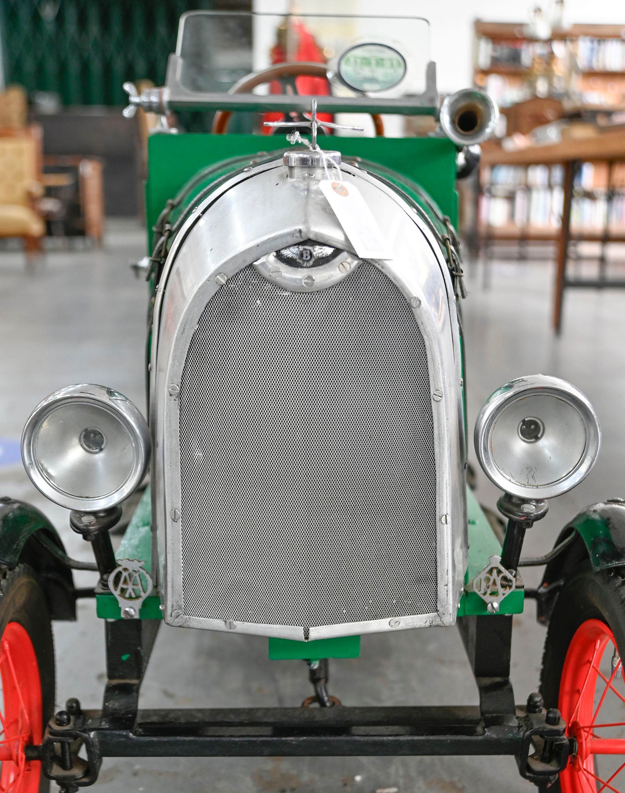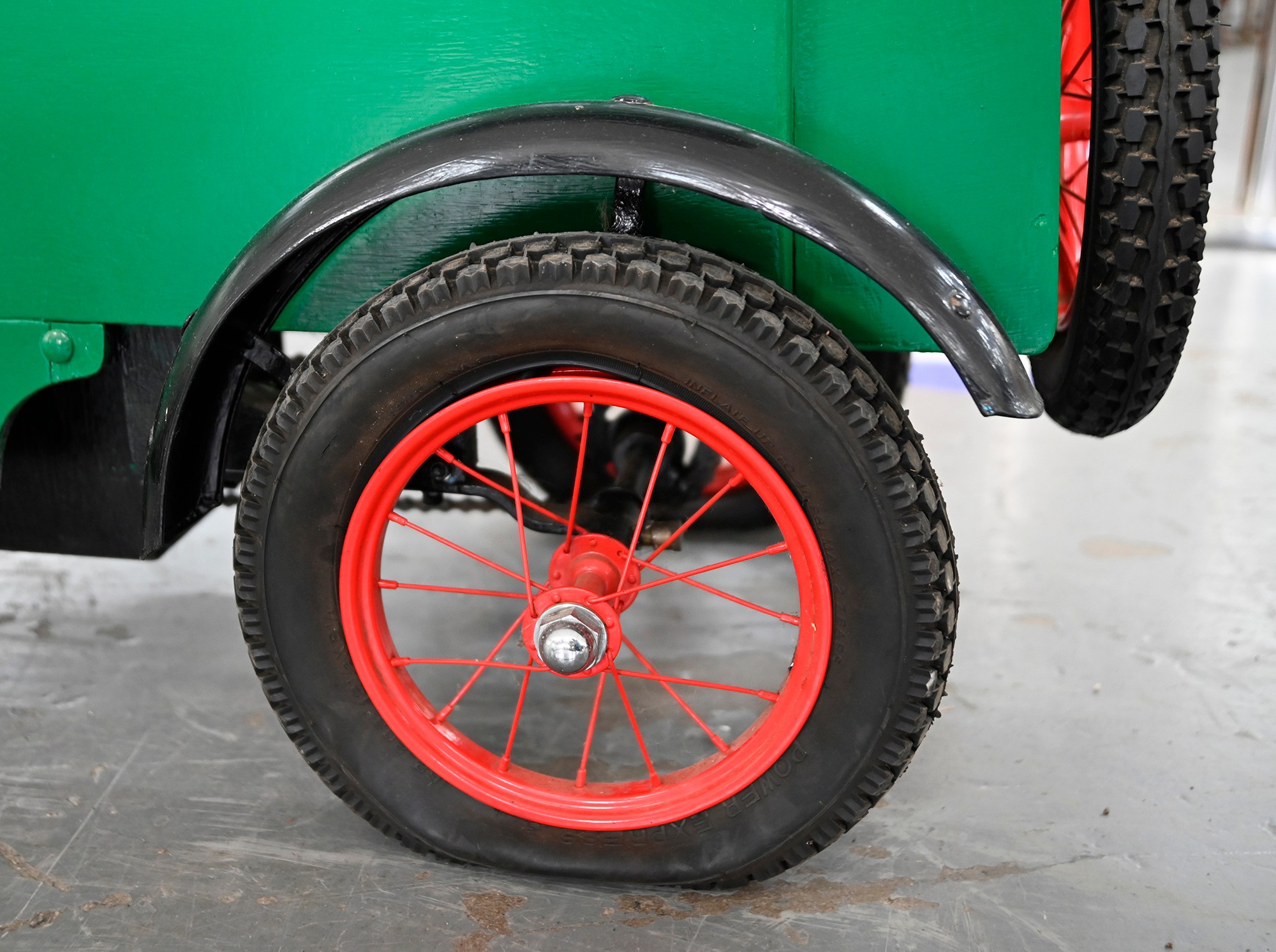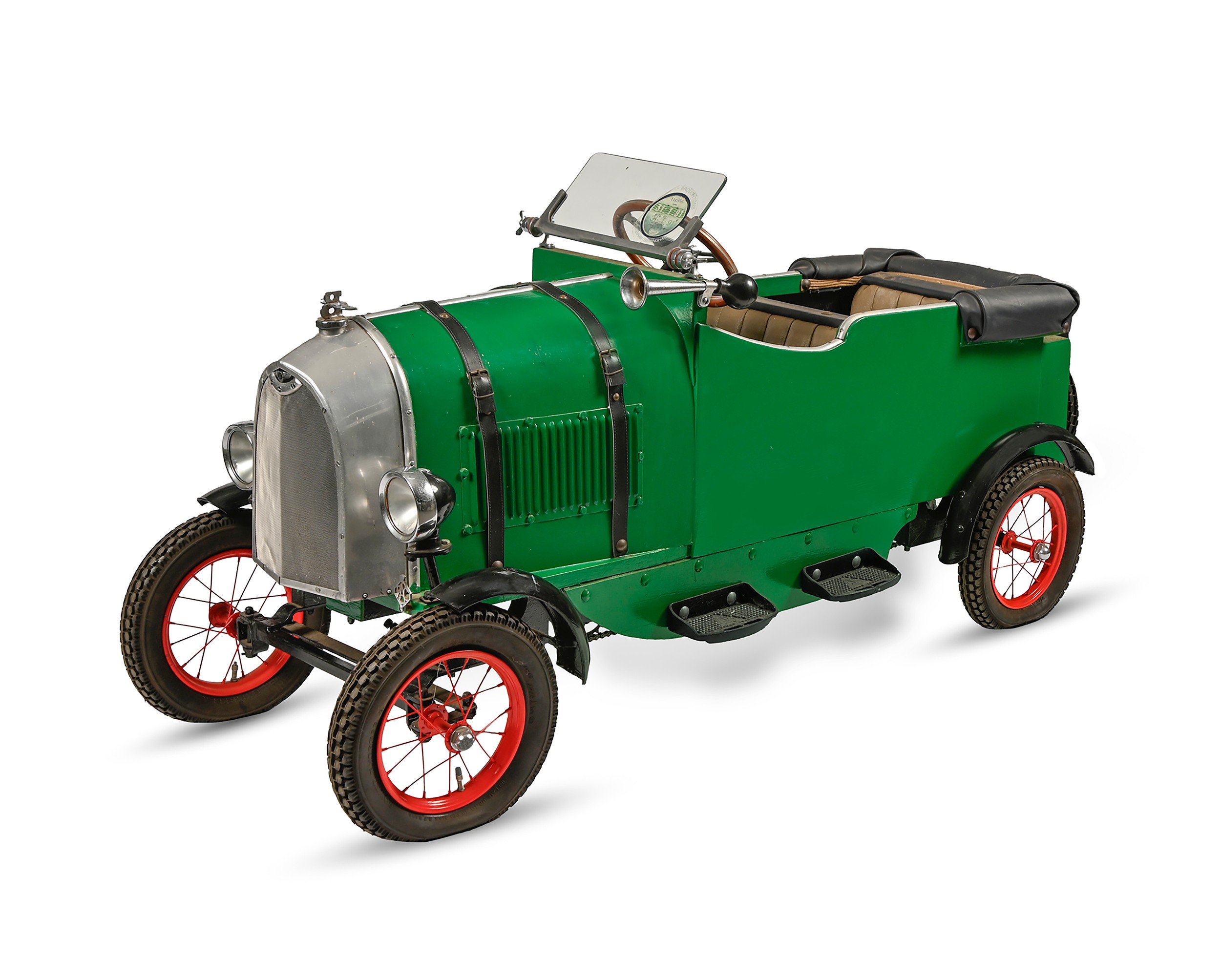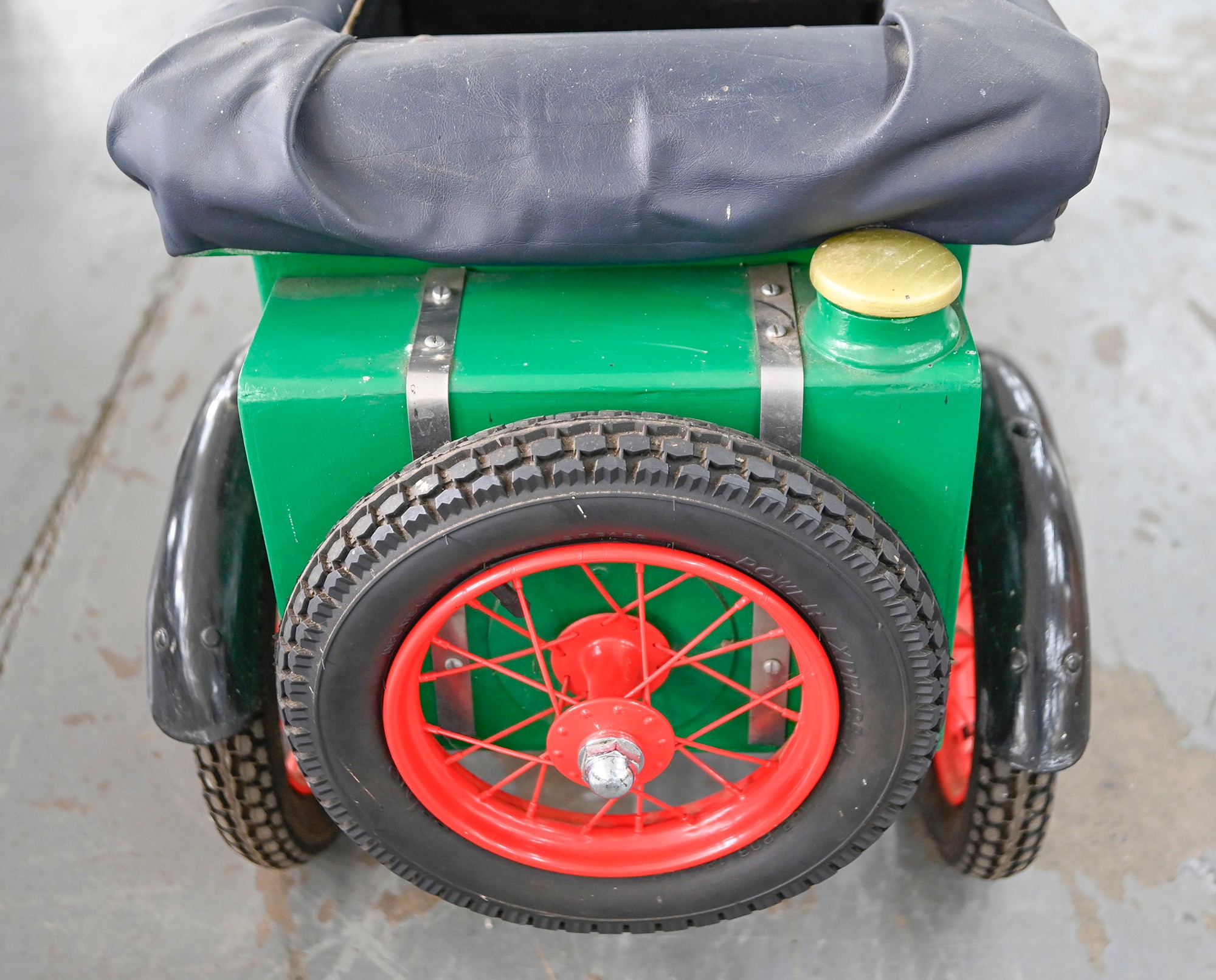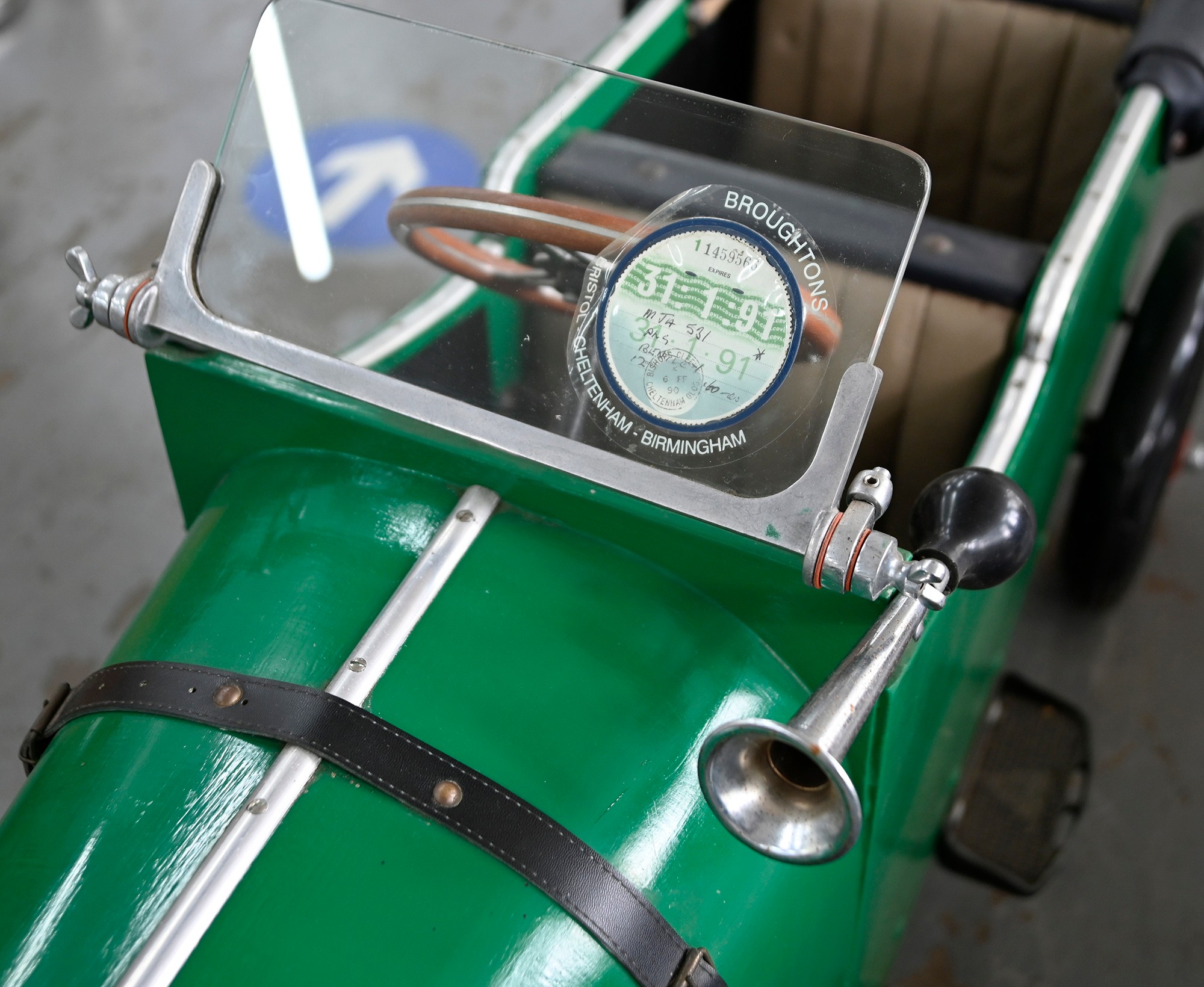 A painted wood and aluminium child's 'Bentley' pedal car, with two seats, bicycle chain, drive, electric lights, AA and RAC badges, winged B mascot, horn and spare tyre, 158cm l