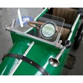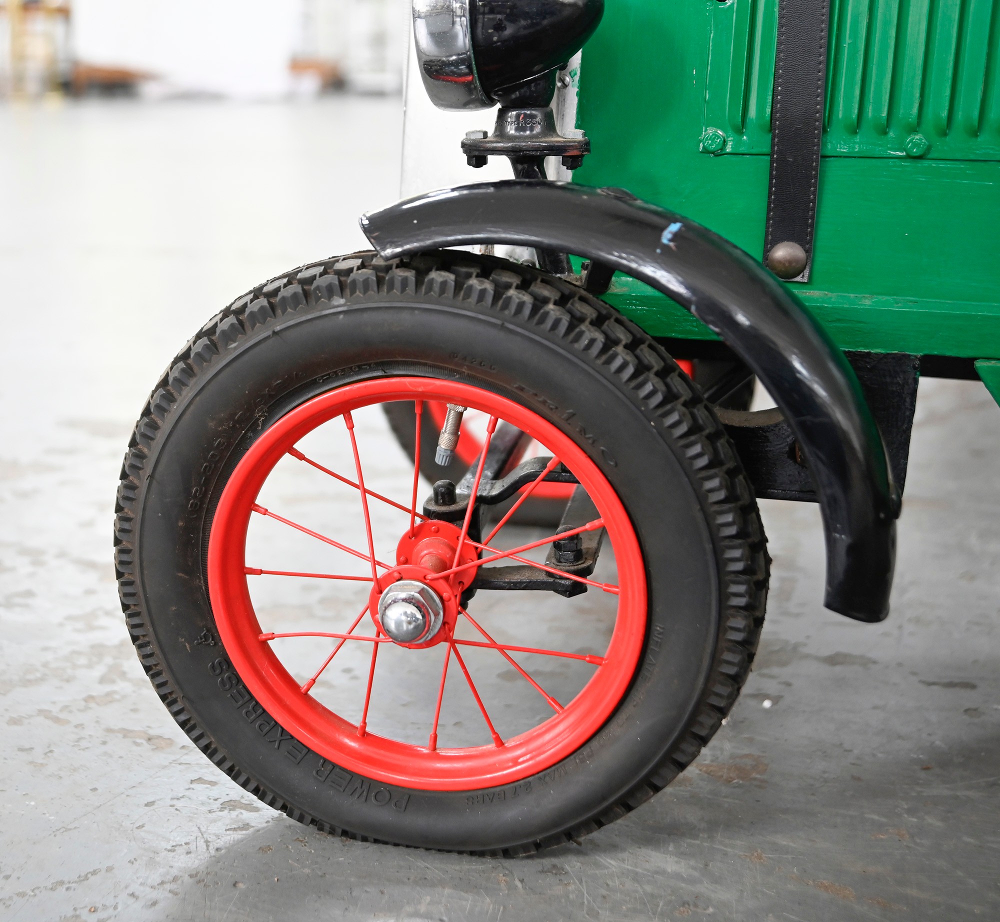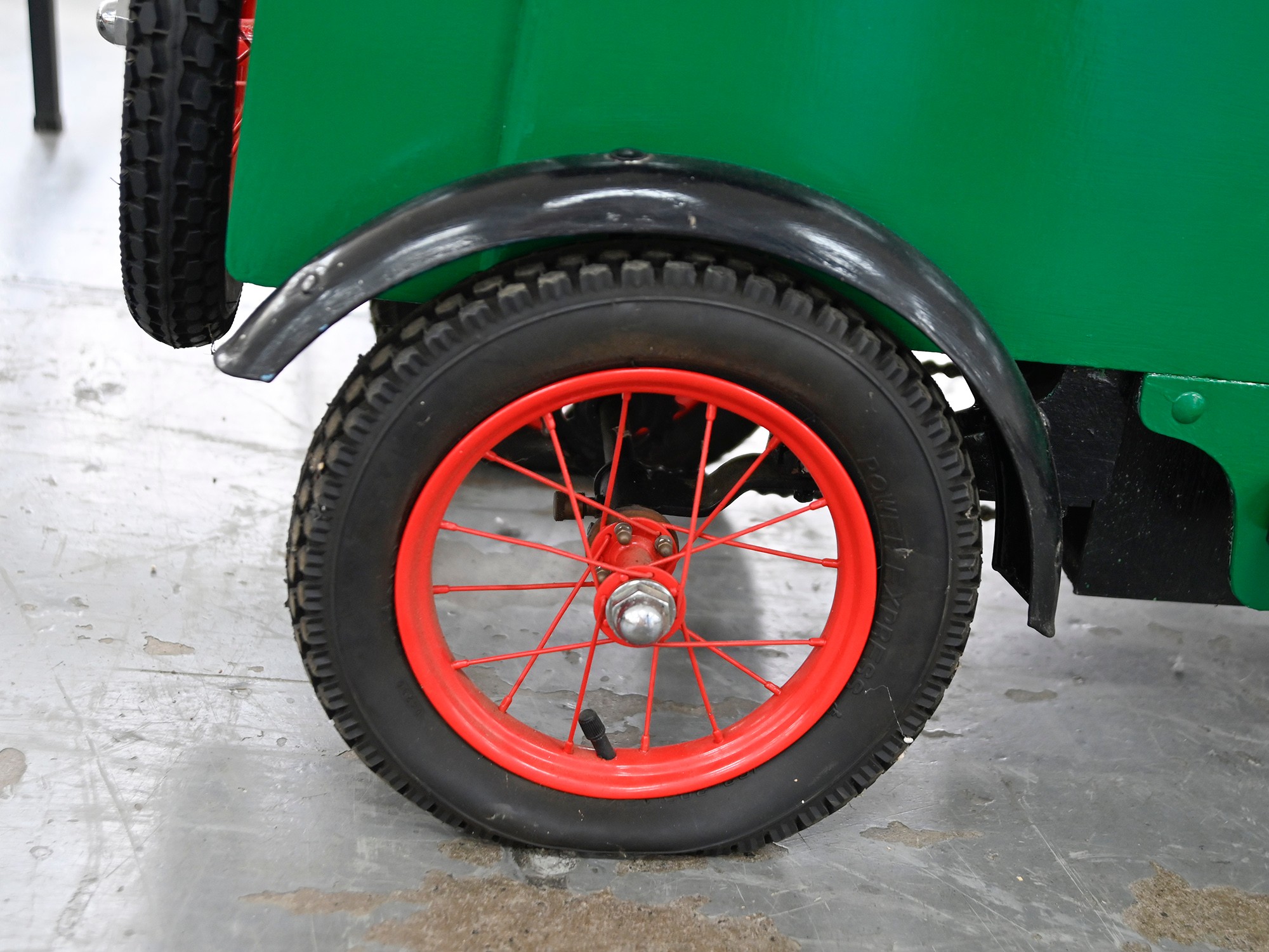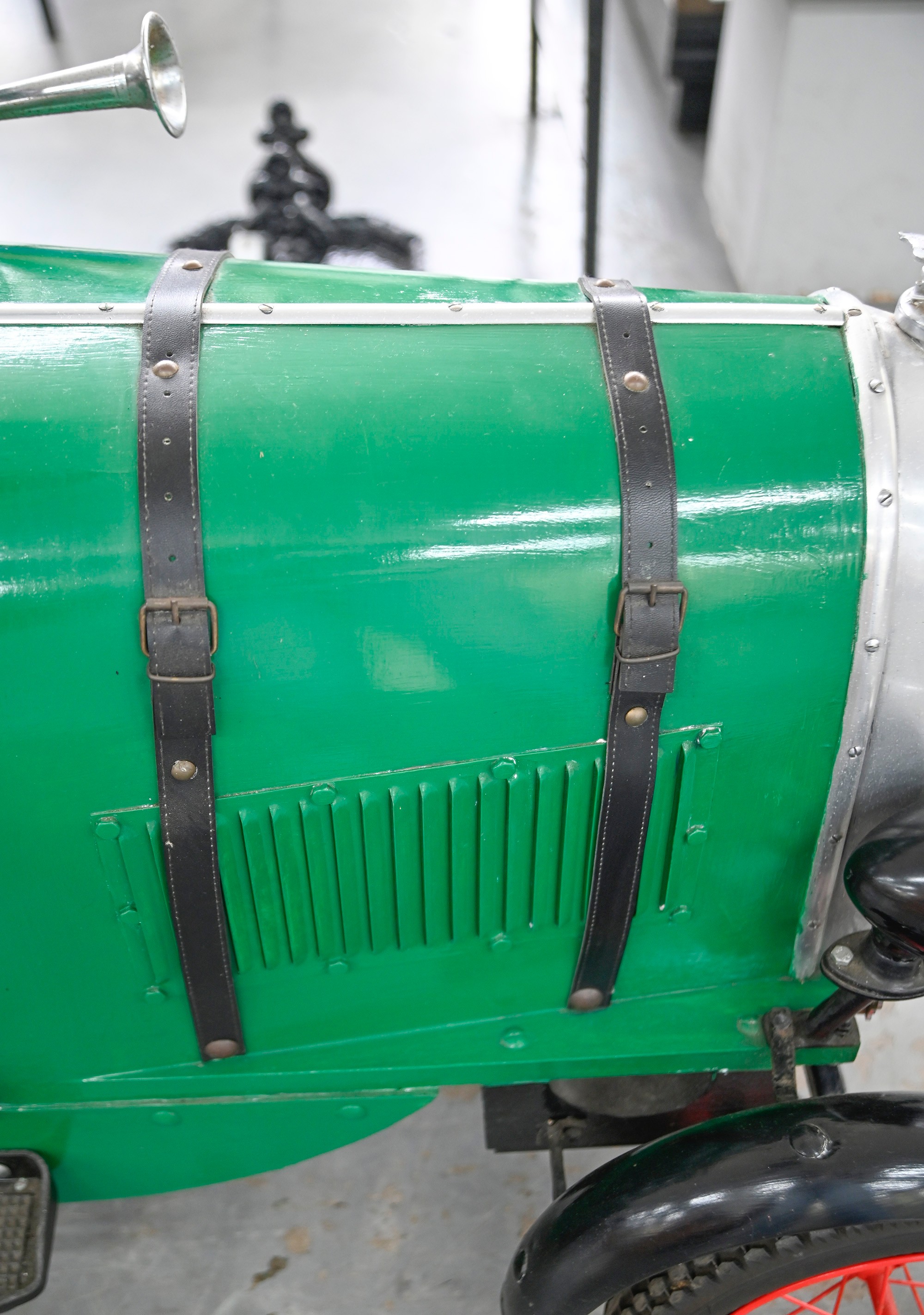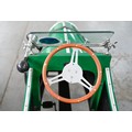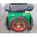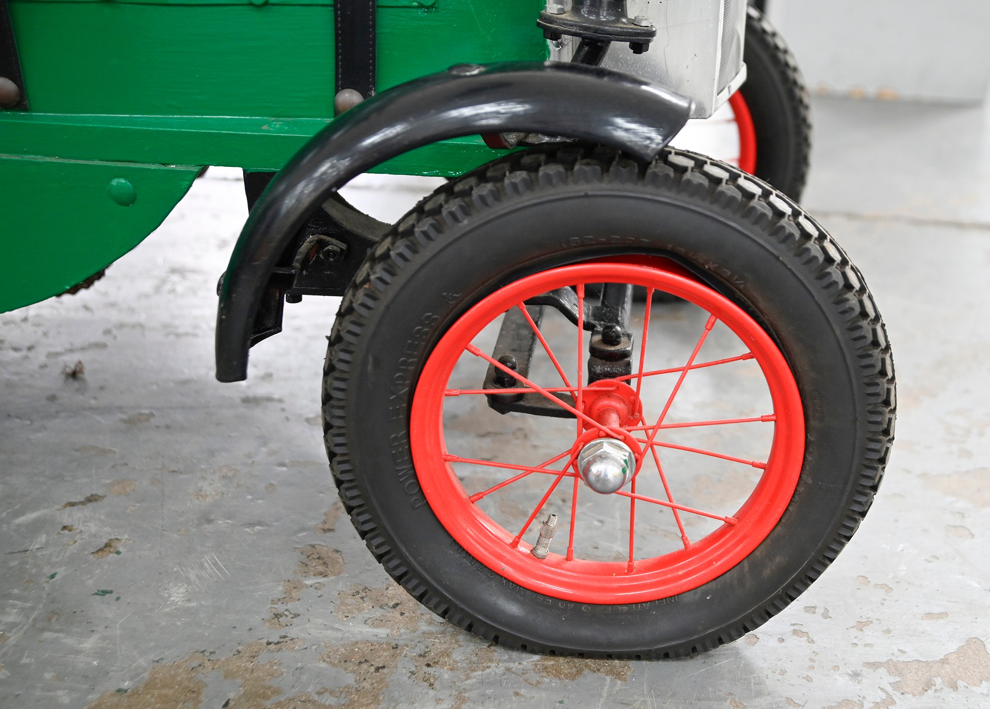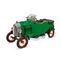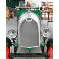 A painted wood and aluminium child's 'Bentley' pedal car, with two seats, bicycle chain, drive, electric lights, AA and RAC badges, winged B mascot, horn and spare tyre, 158cm l