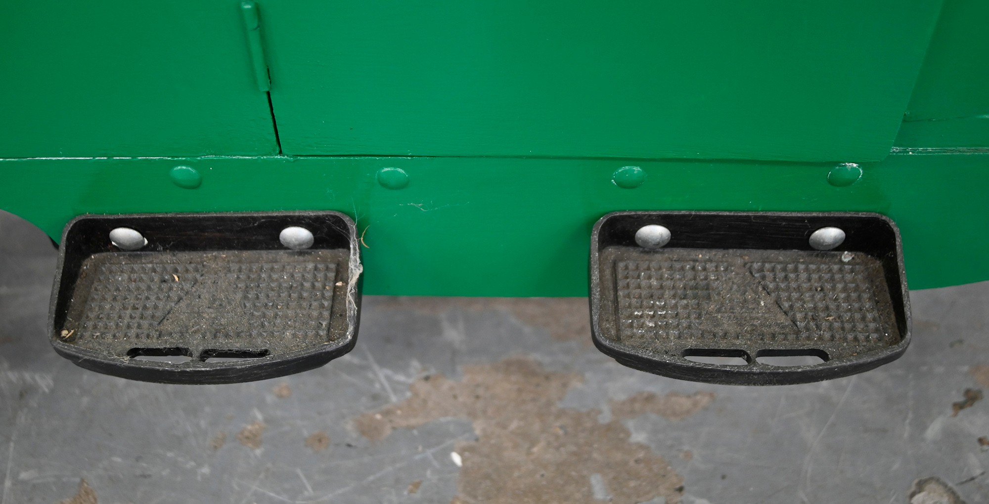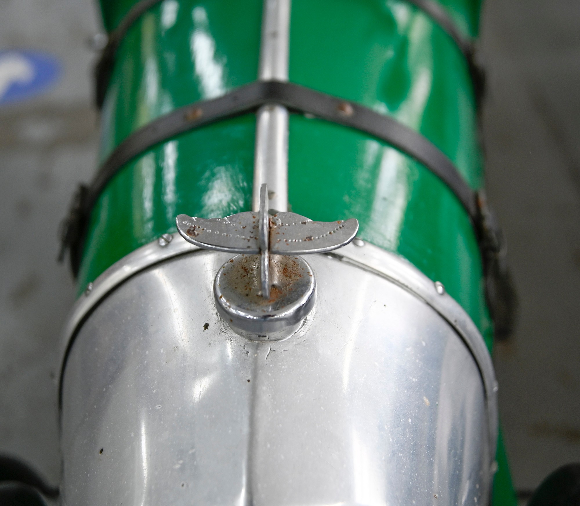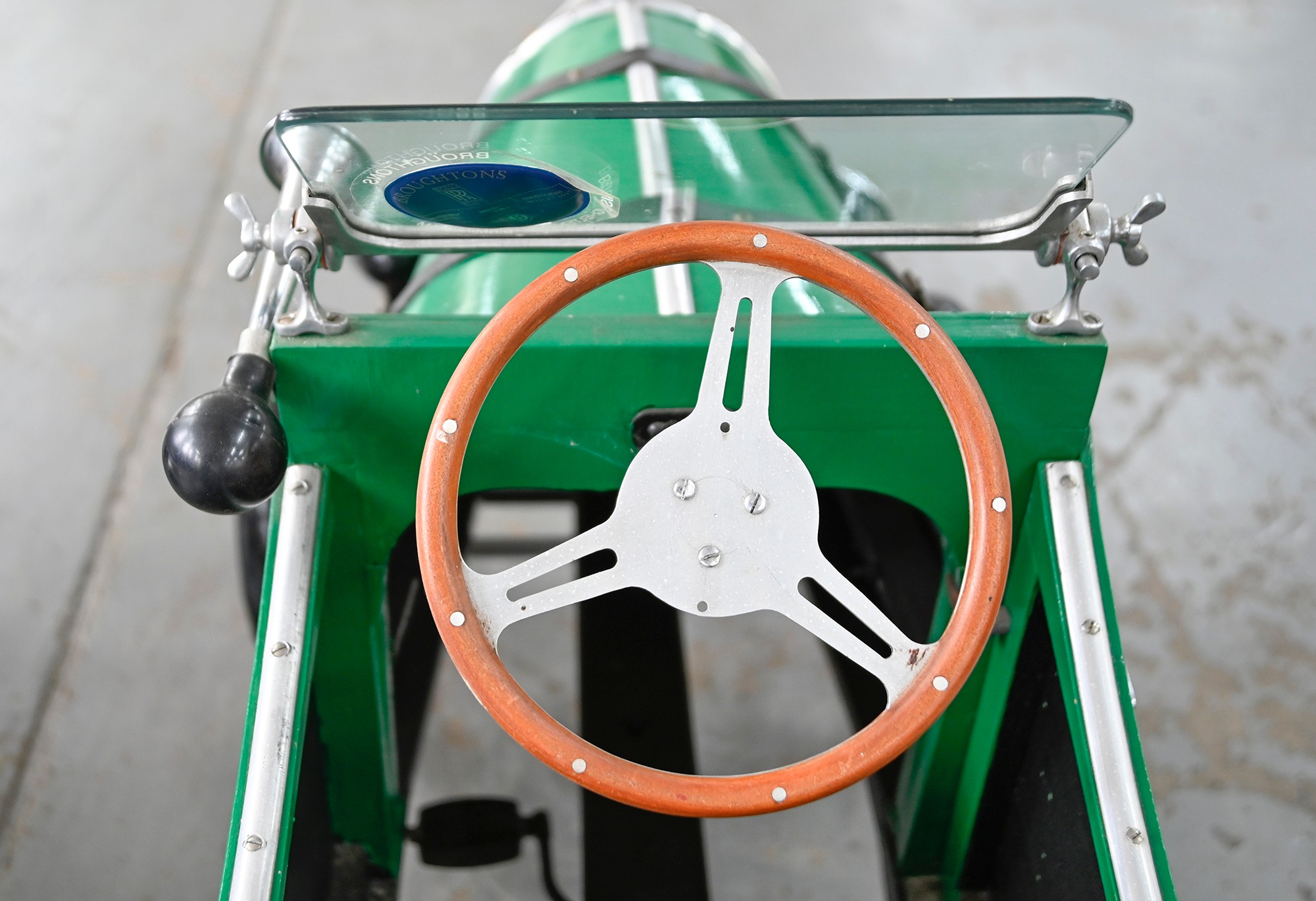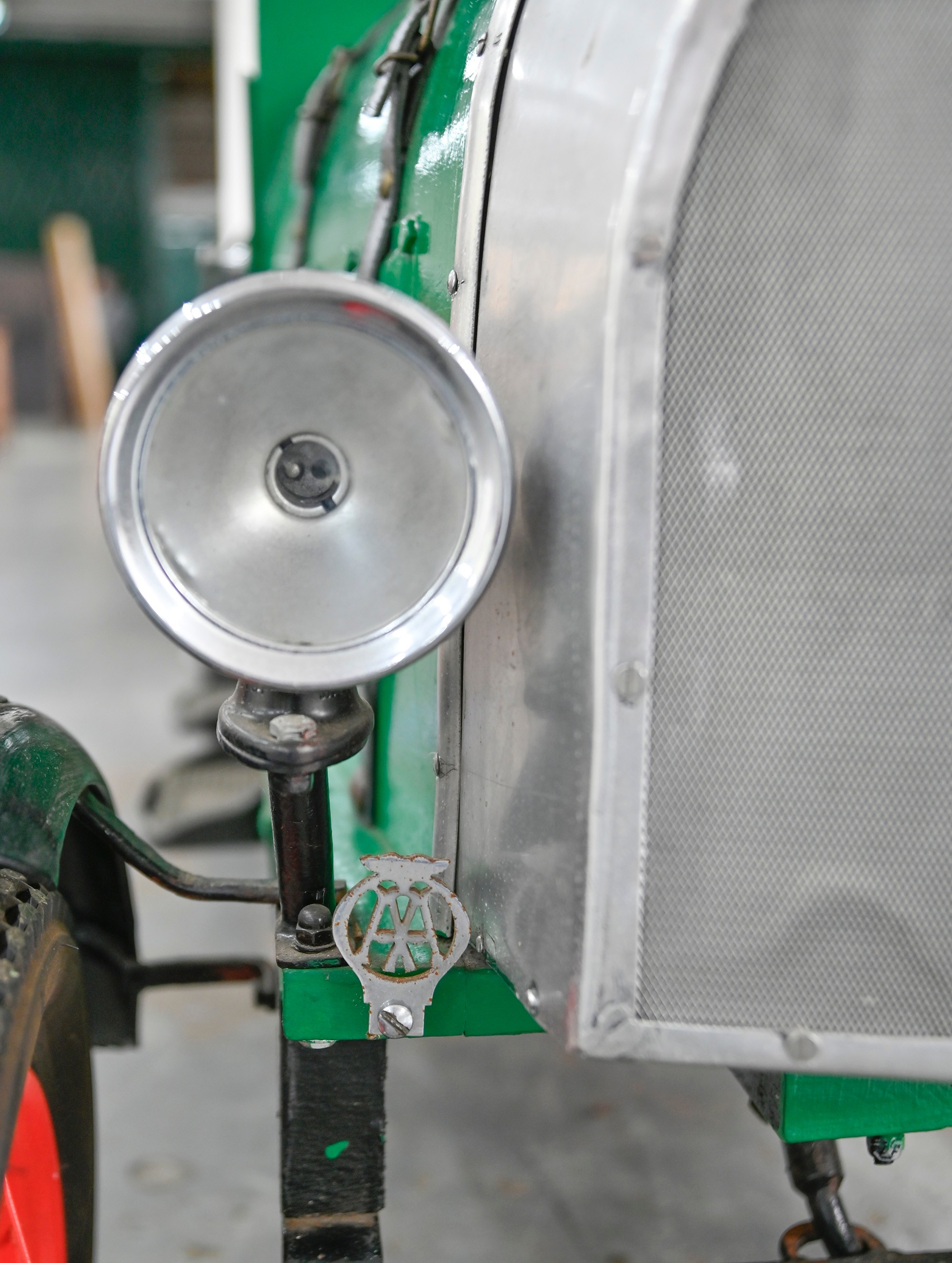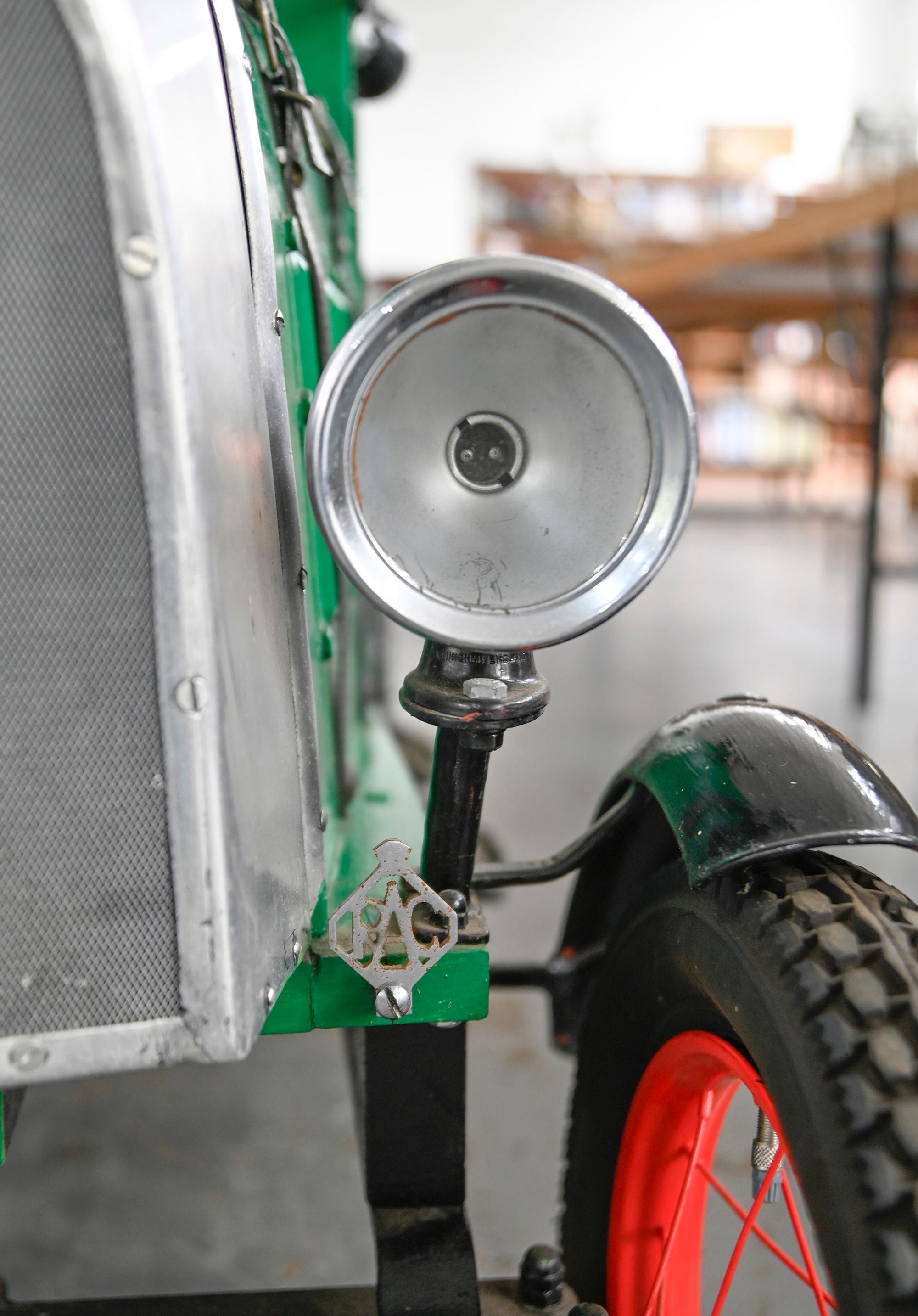 A painted wood and aluminium child's 'Bentley' pedal car, with two seats, bicycle chain, drive, electric lights, AA and RAC badges, winged B mascot, horn and spare tyre, 158cm l