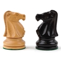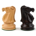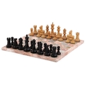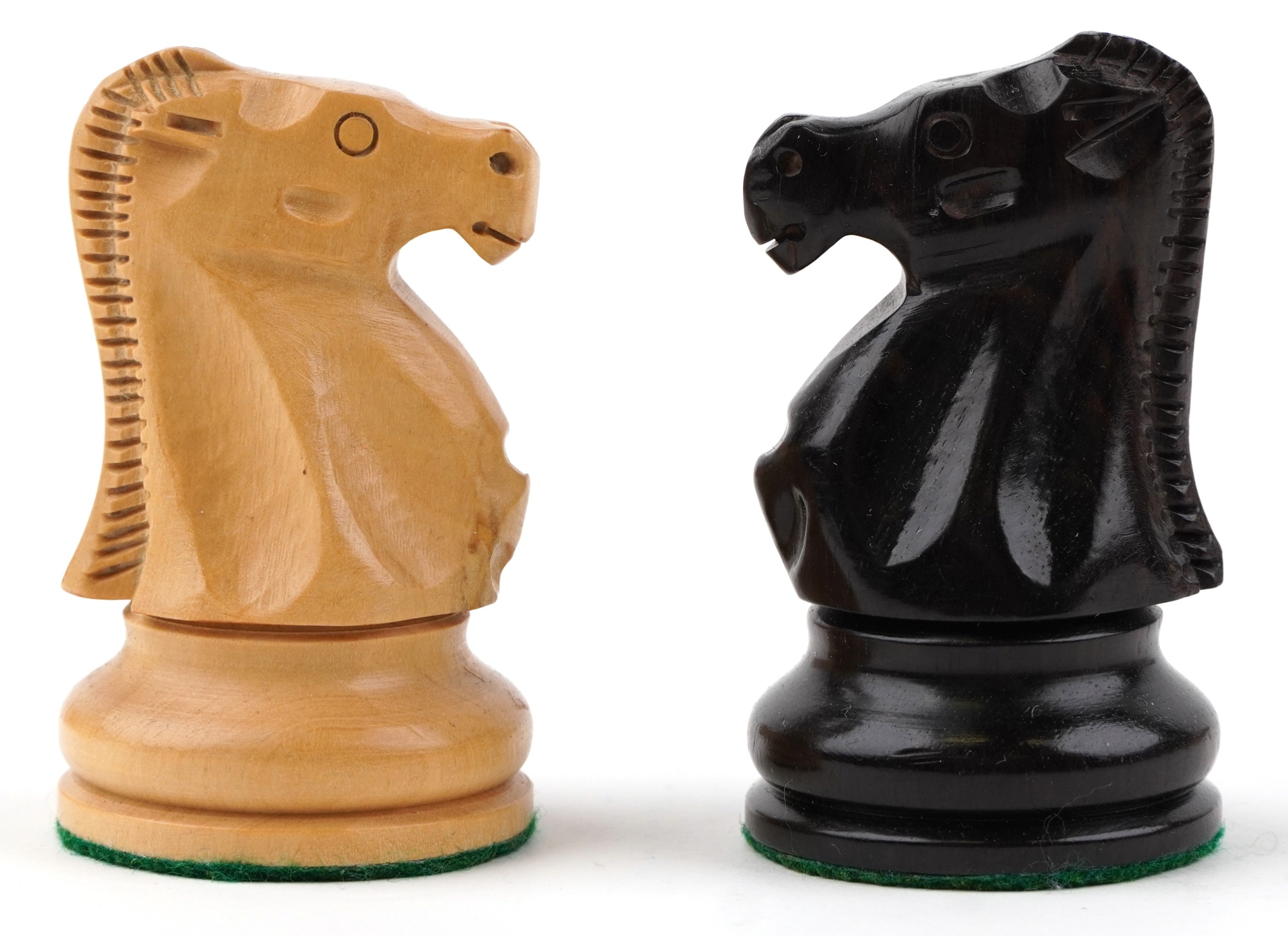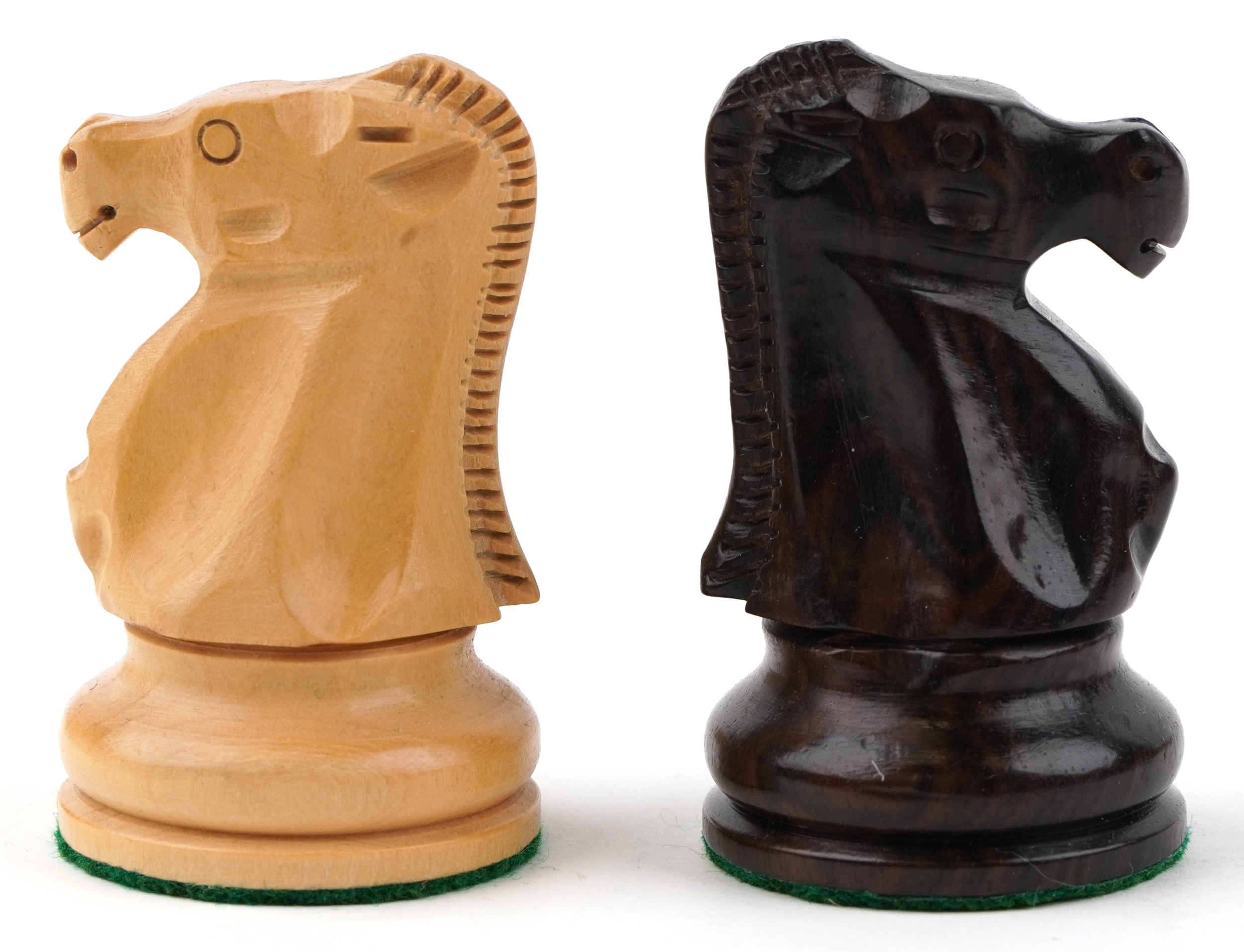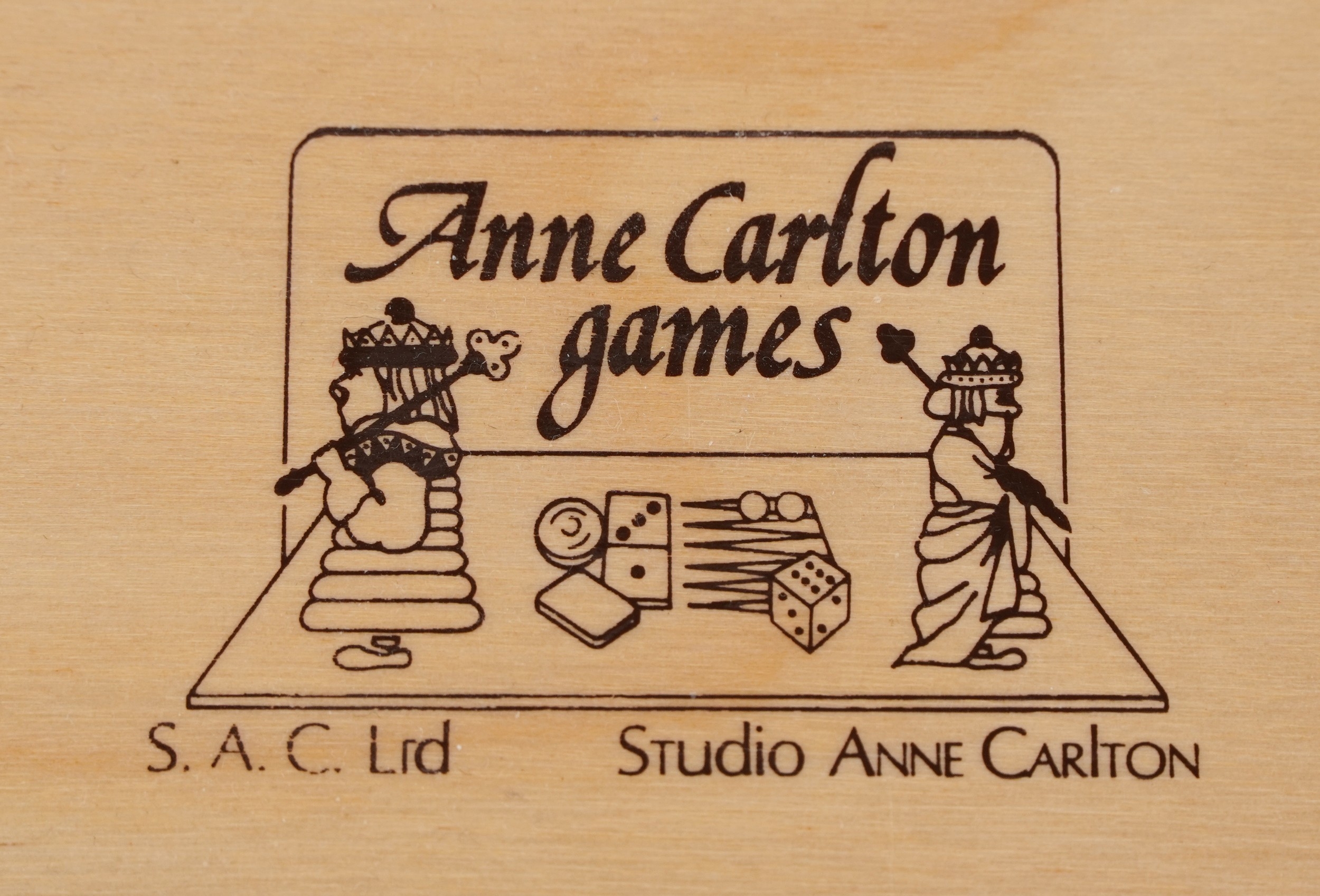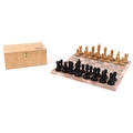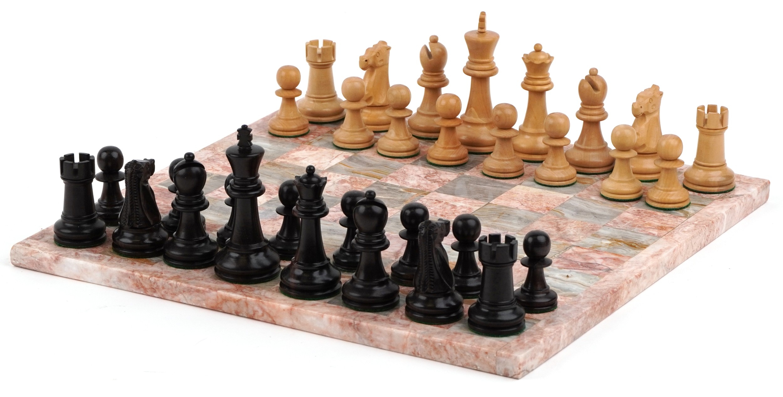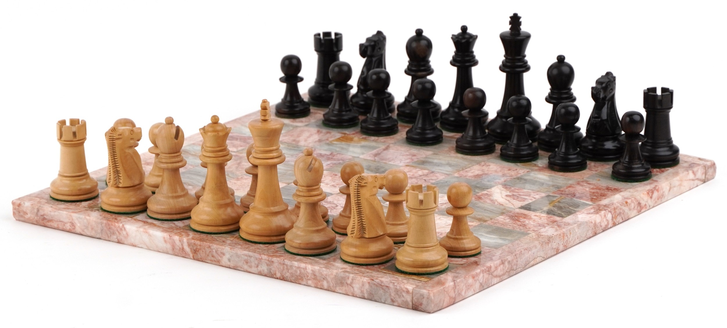 A 20th century Anne Carlton Games turned boxwood and ebony Staunton chess set, the king 9.5cm high, with box and a green and rouge marble chequered board, 36cm wide.
