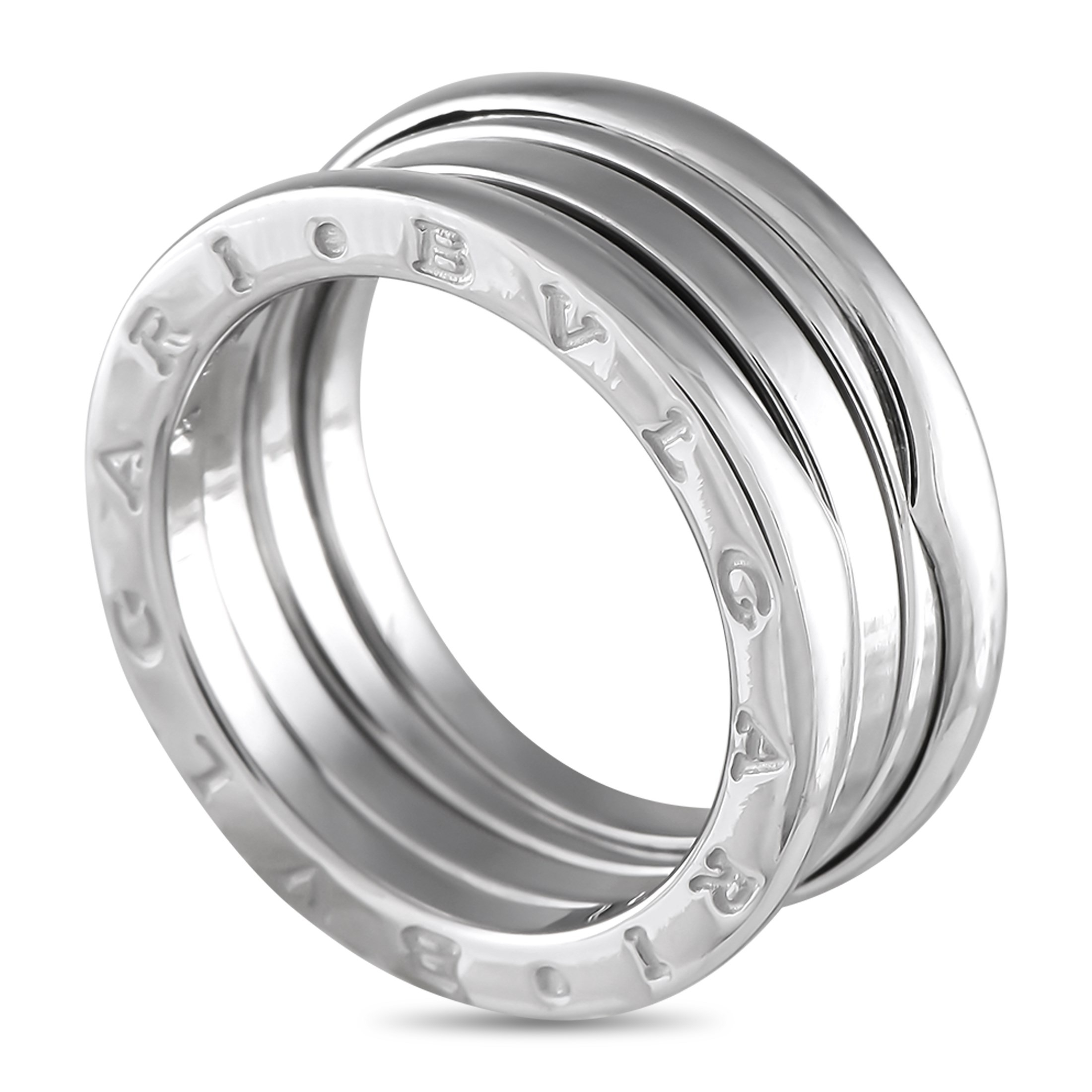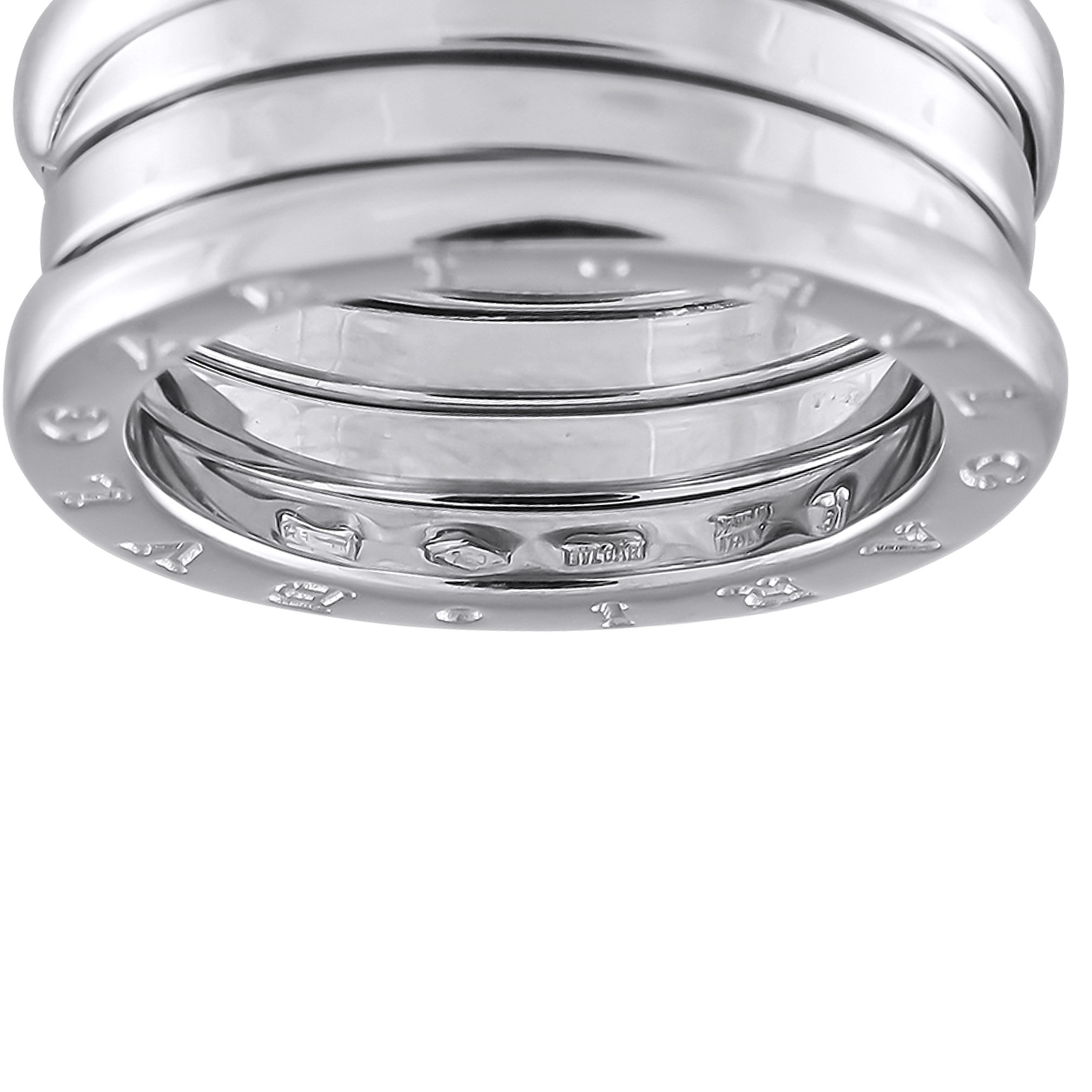 A Bvlgari B.zero1 18K White Gold Ring. The collections signature spiral detail at the center of the design. 10mm wide band and 3mm top height. Good Condition and includes a gift box. Ring size: 5.5 (UK size K or K½). Total weight: 9.9 Grams. *This item is held at Cadmore USA Office in Pennsylvania, USA and will be shipped from there. Buyers will be responsible for direct shipping payments.*