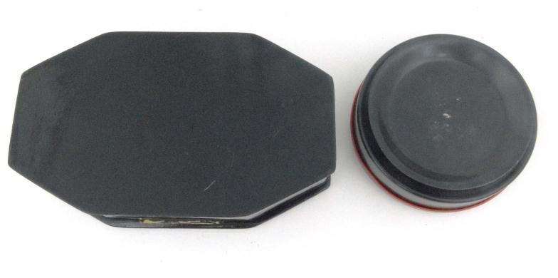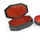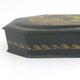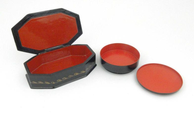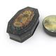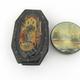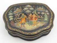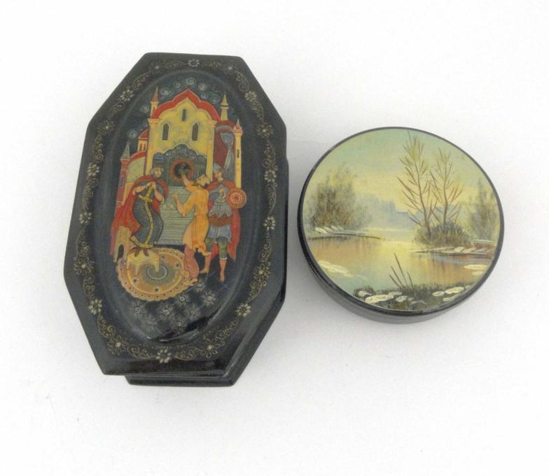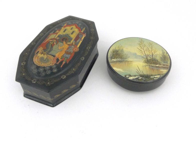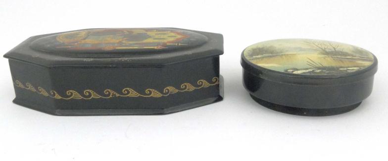 Two Russian black lacquered boxes - one painted with figures, the other a landscape scene, the larger 15cm in length