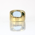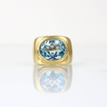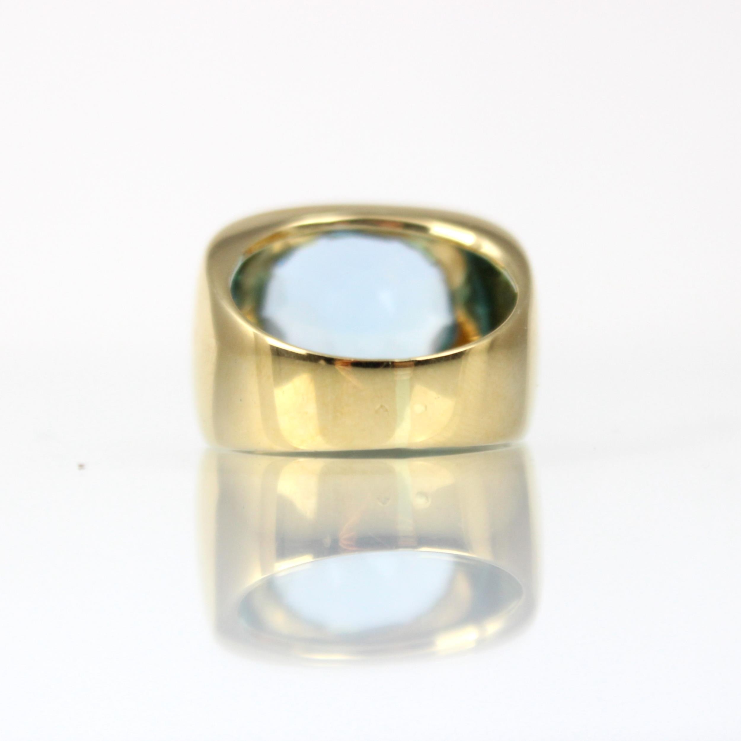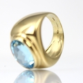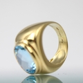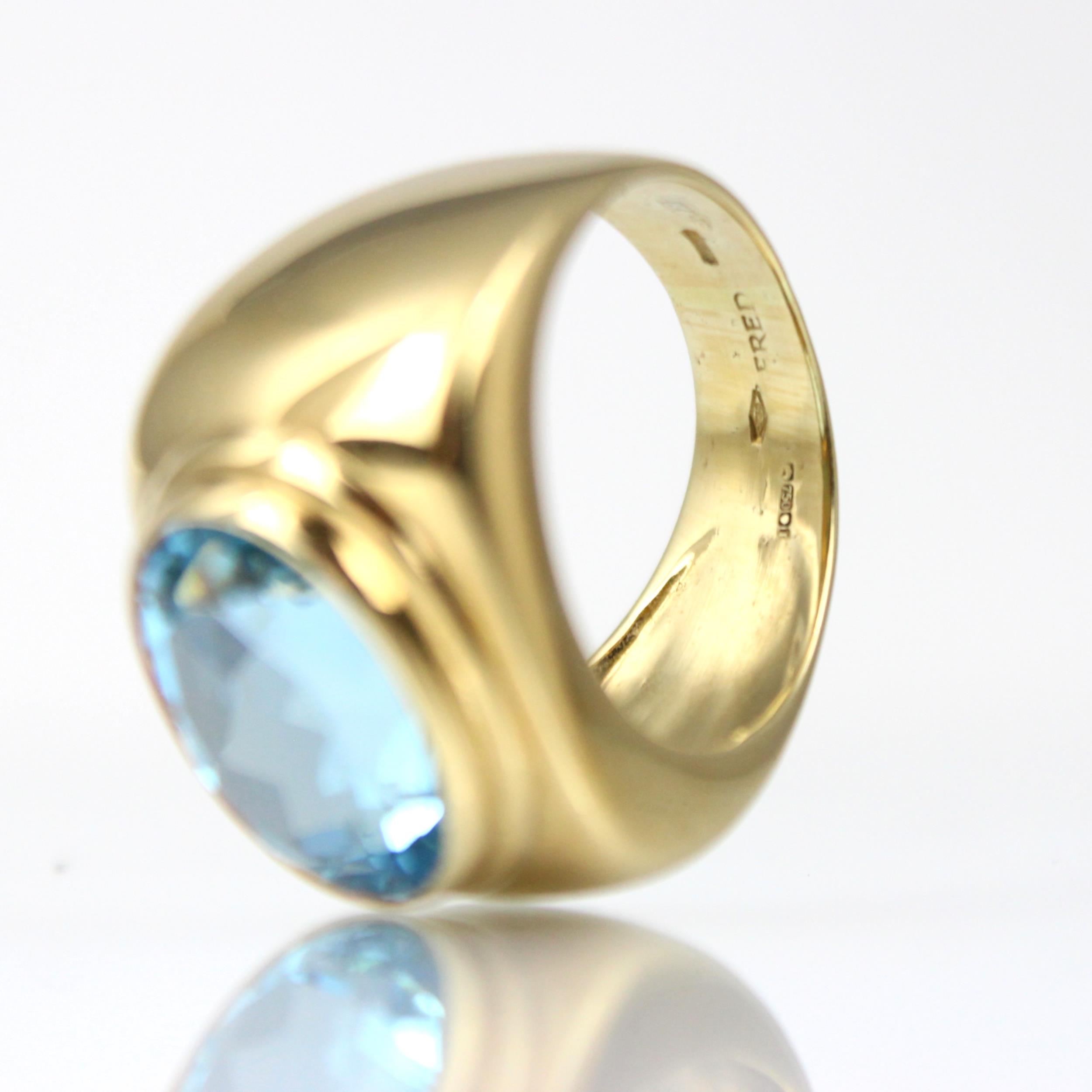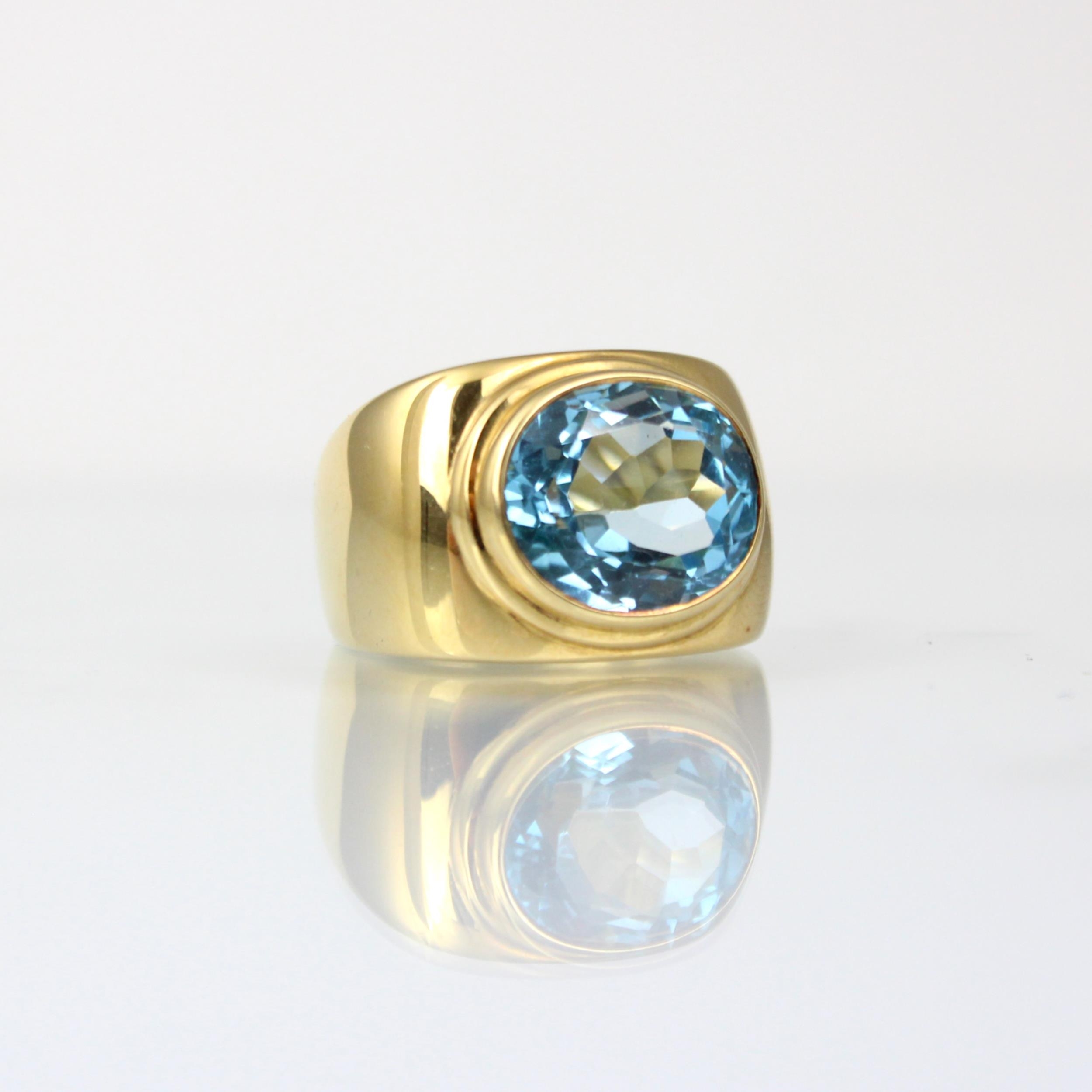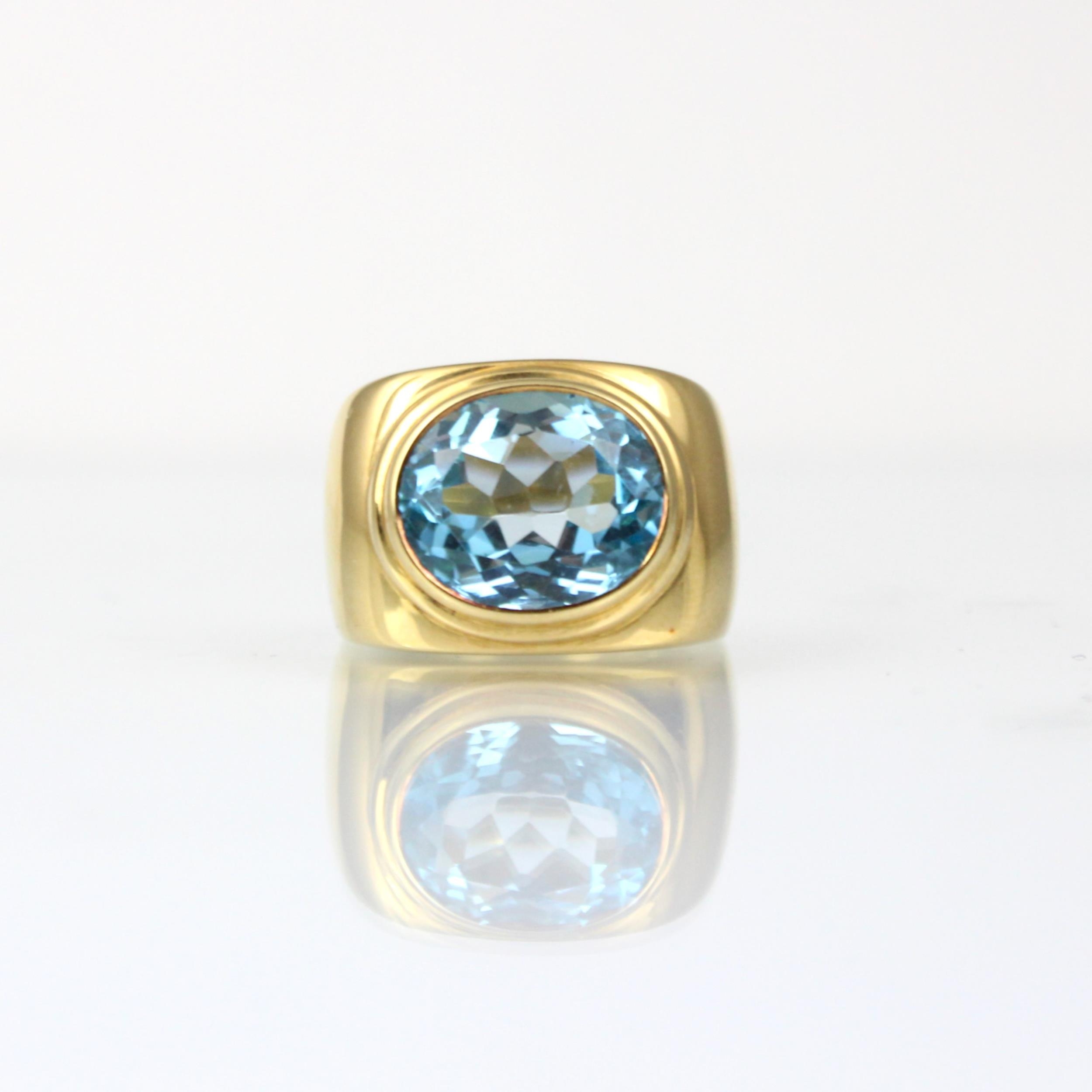A 'Fred' Paris 18ct yellow gold untested blue topaz dress ring, the oval mixed cut blue stone within an 18ct yellow gold raised stepped head leading to signet ring style mount with plain plain polished shank, stamped 'FRED' 'B&S' (Bentley and Skinner) with rubbed French import marks to exterior of band, total untested topaz weight estimated 8.50ct, ring size M, 13gms