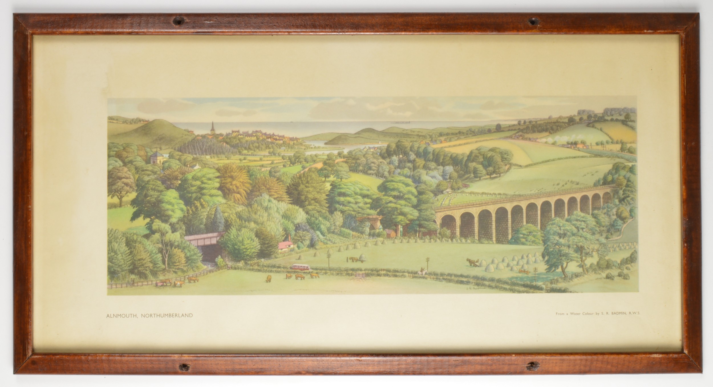 Carriage print, ALNMOUTH NORTHUMBERLAND, SR Badwin. Framed glazed, replacement frame, original style, 21 x 11 inches. Shipping band - C.
