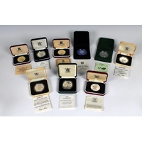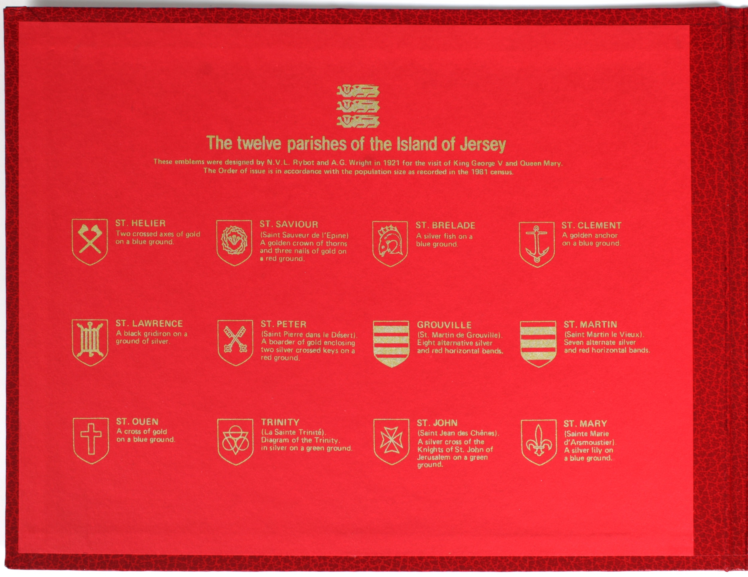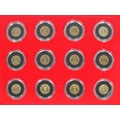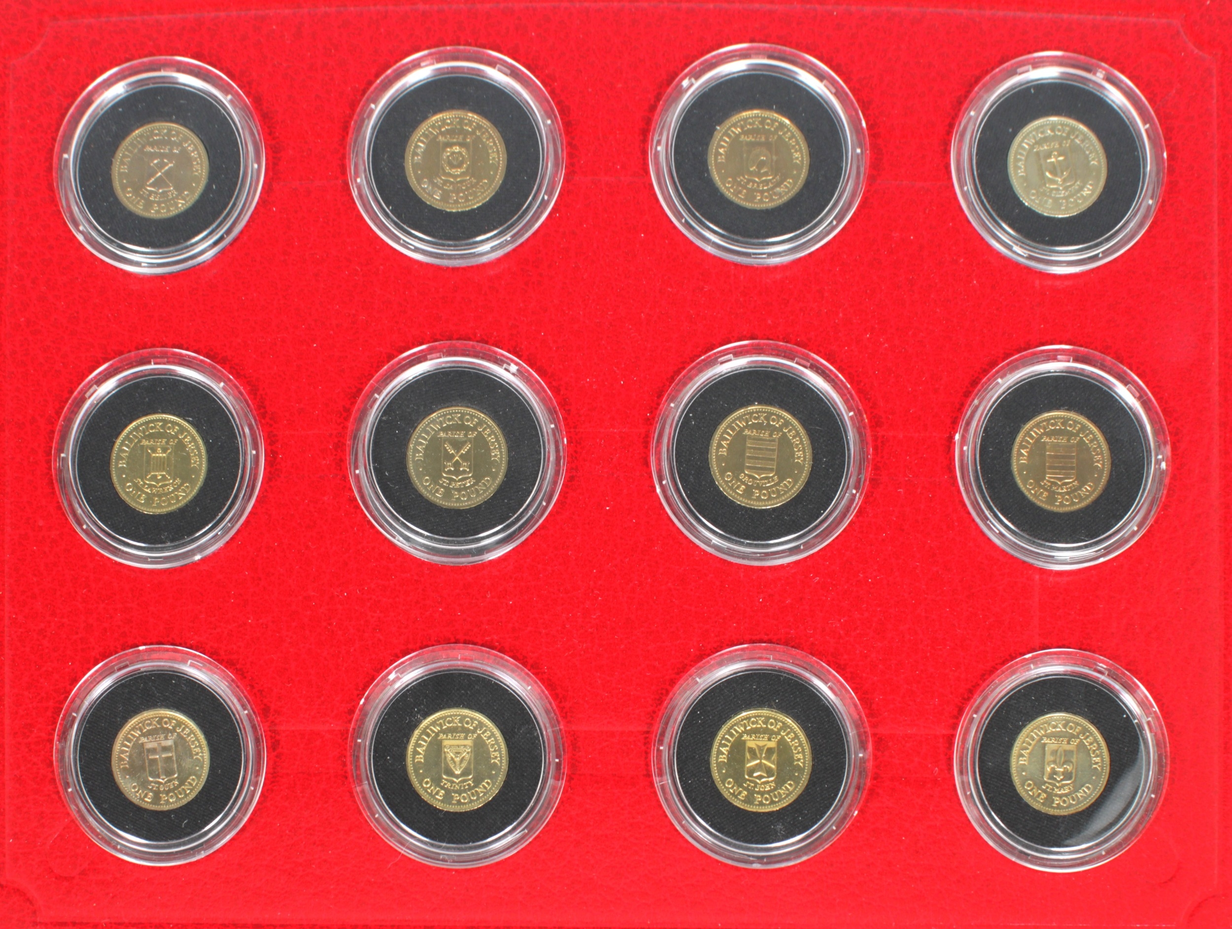 A set of twelve parishes of Jersey 1 proof coins each in a perspex capsule, contained within a red presentation folder.