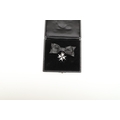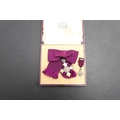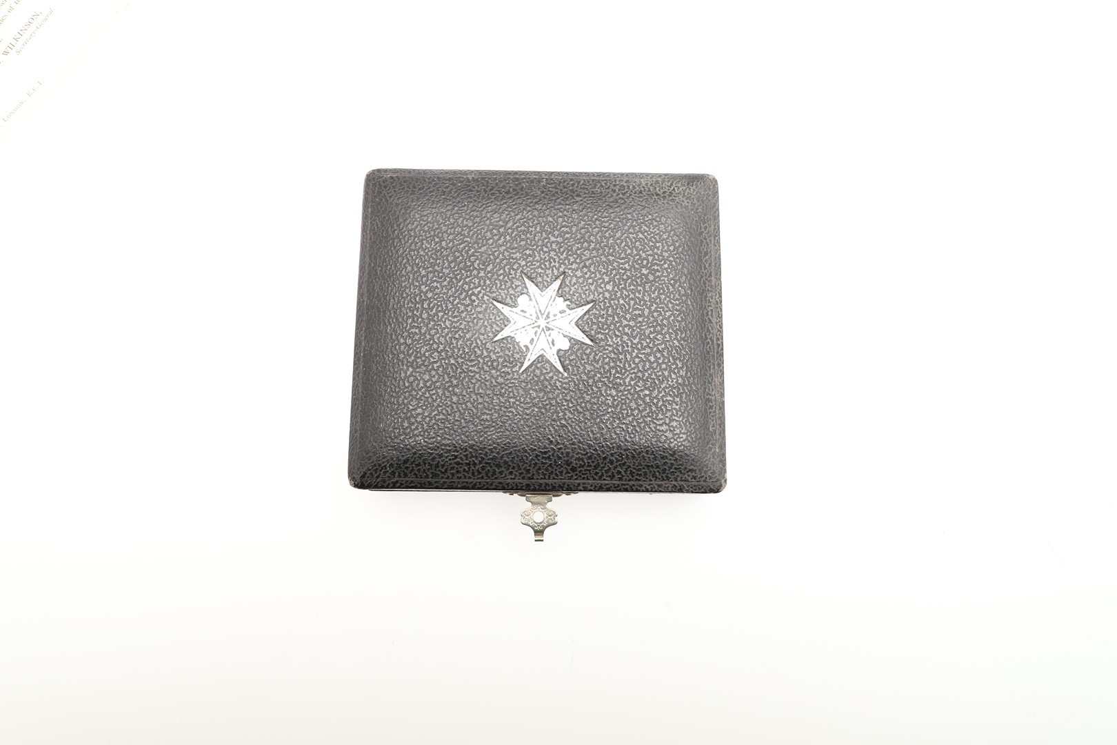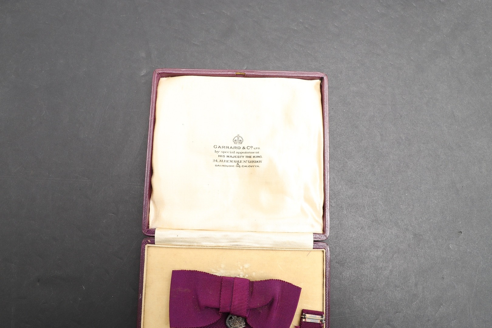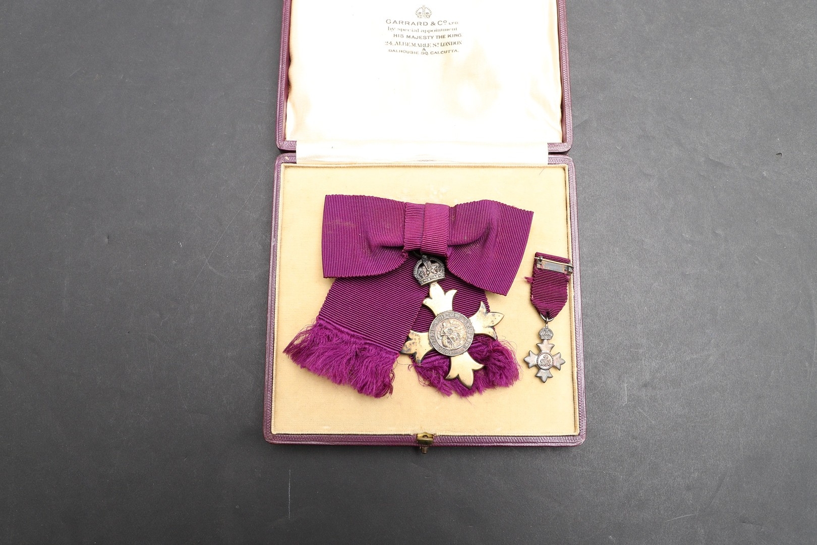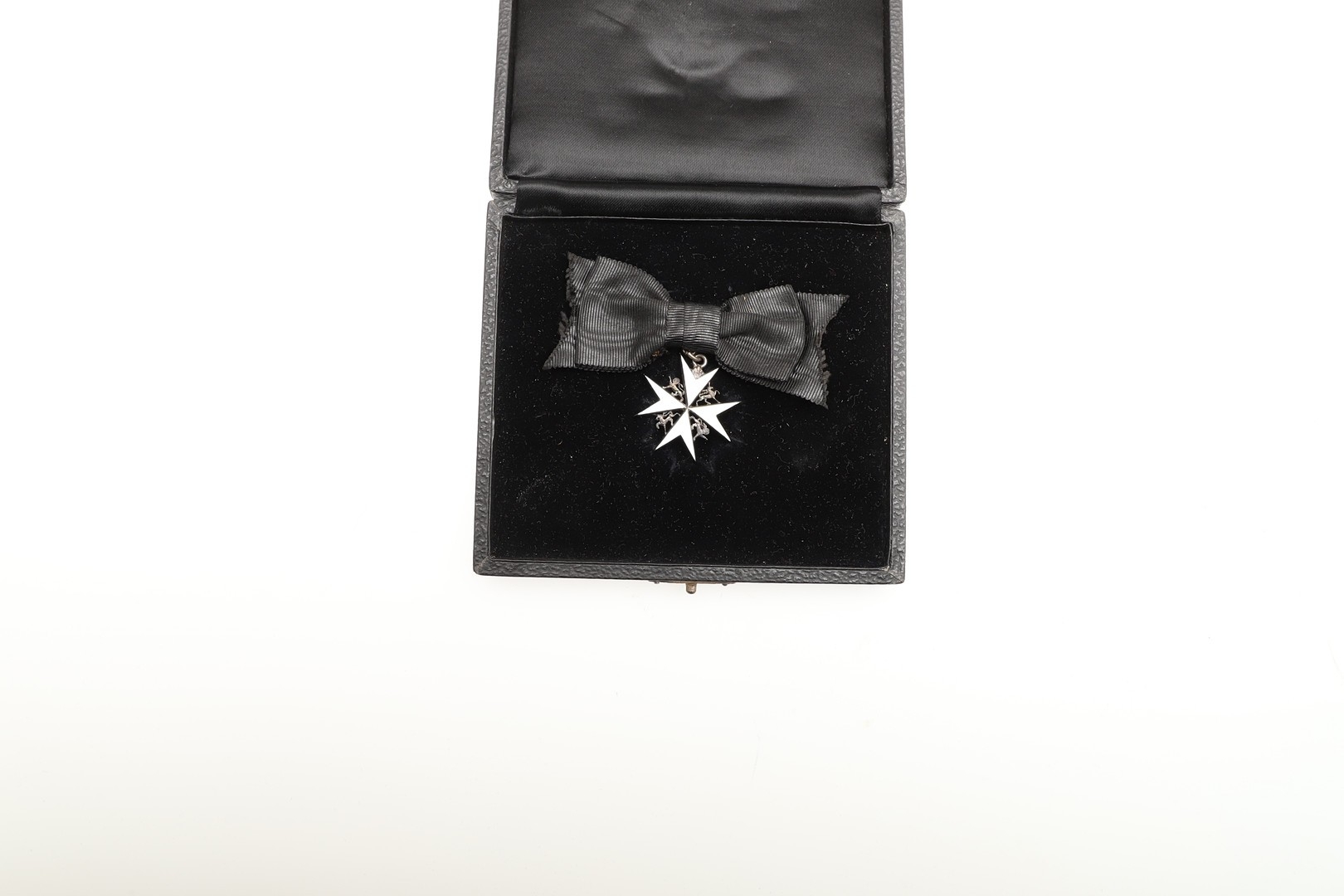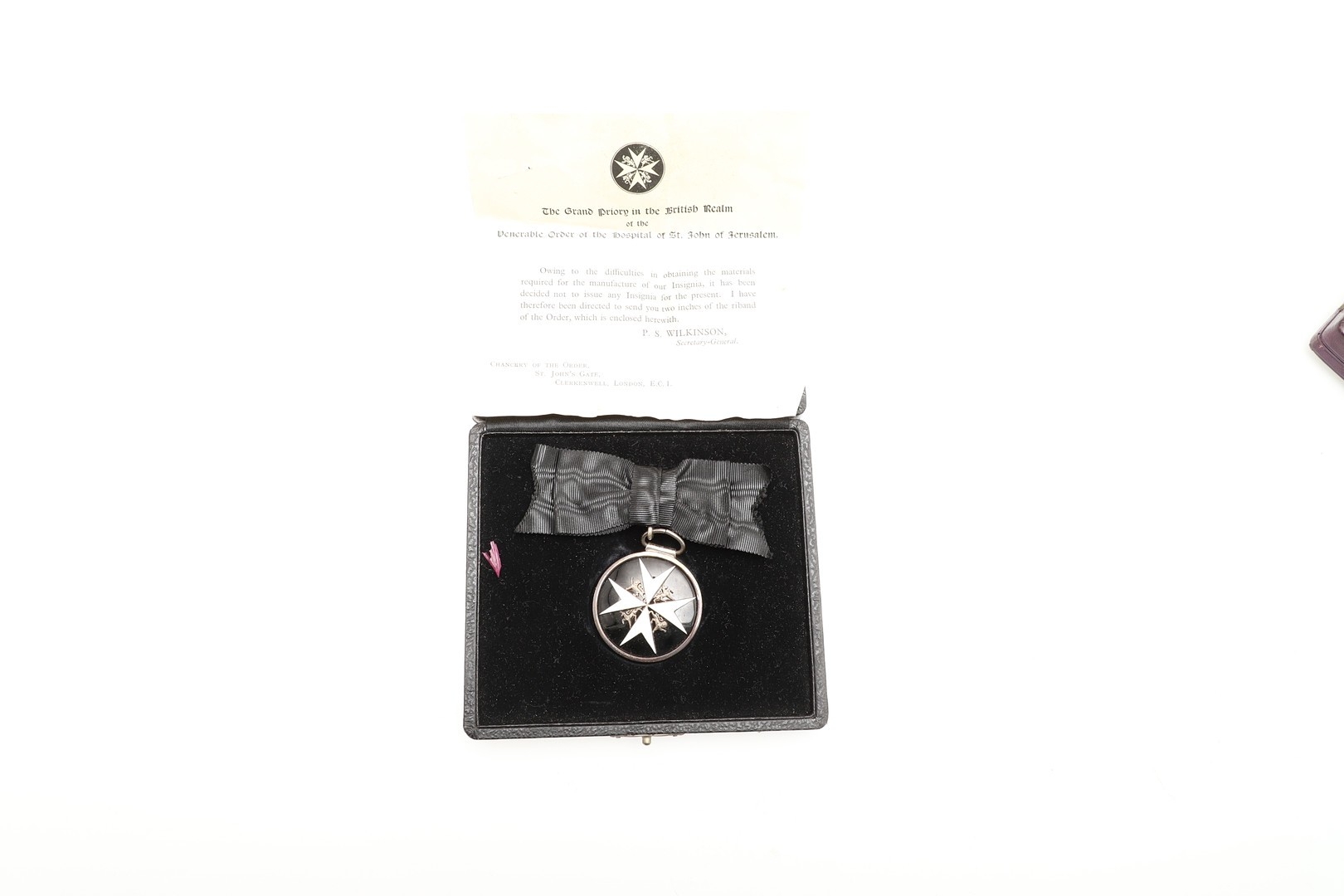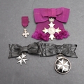 AN OBE ON CIVILIAN LADIES BOW AND TWO ORDER OF ST JOHN AWARDS. An Order of the British Empire, George V, on civil ribbon ladies bow . Engraved to the reverse EMG 29th October 1918. Hallmarked for London 1917. In Garrard case of issue. With miniature. And an Order of St John award with white enamelled star, on black ribbon brooch, in case of issue, and another similar circular award.