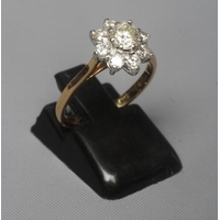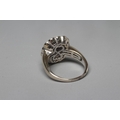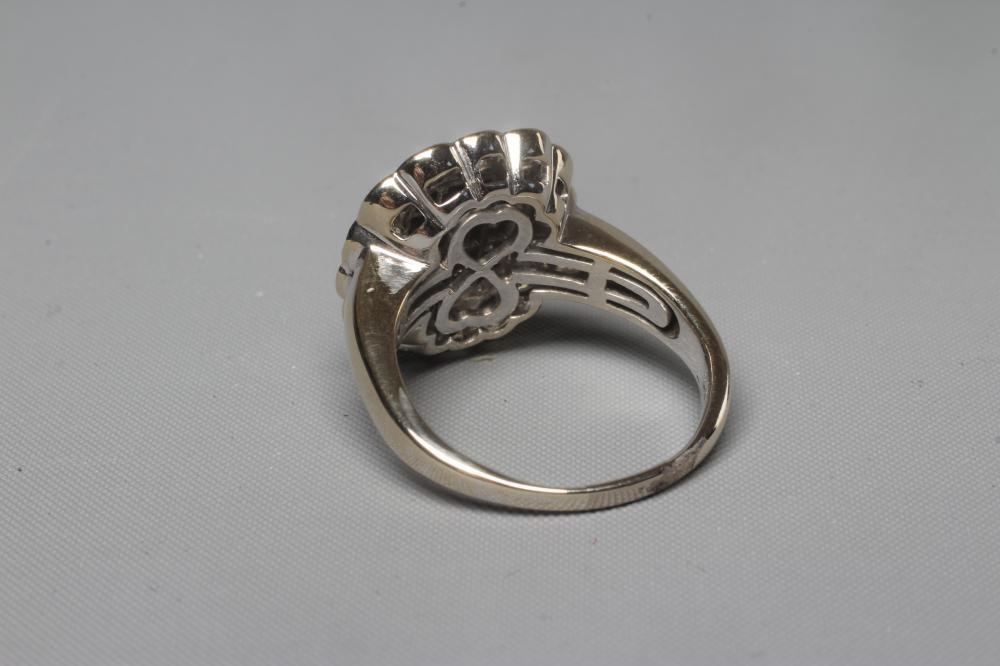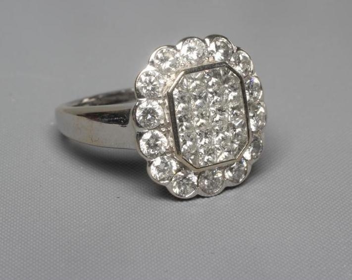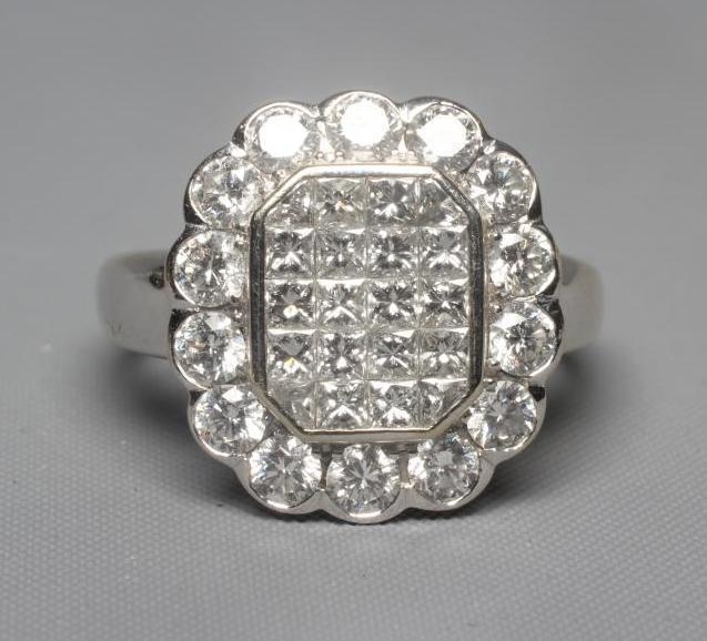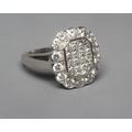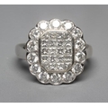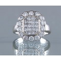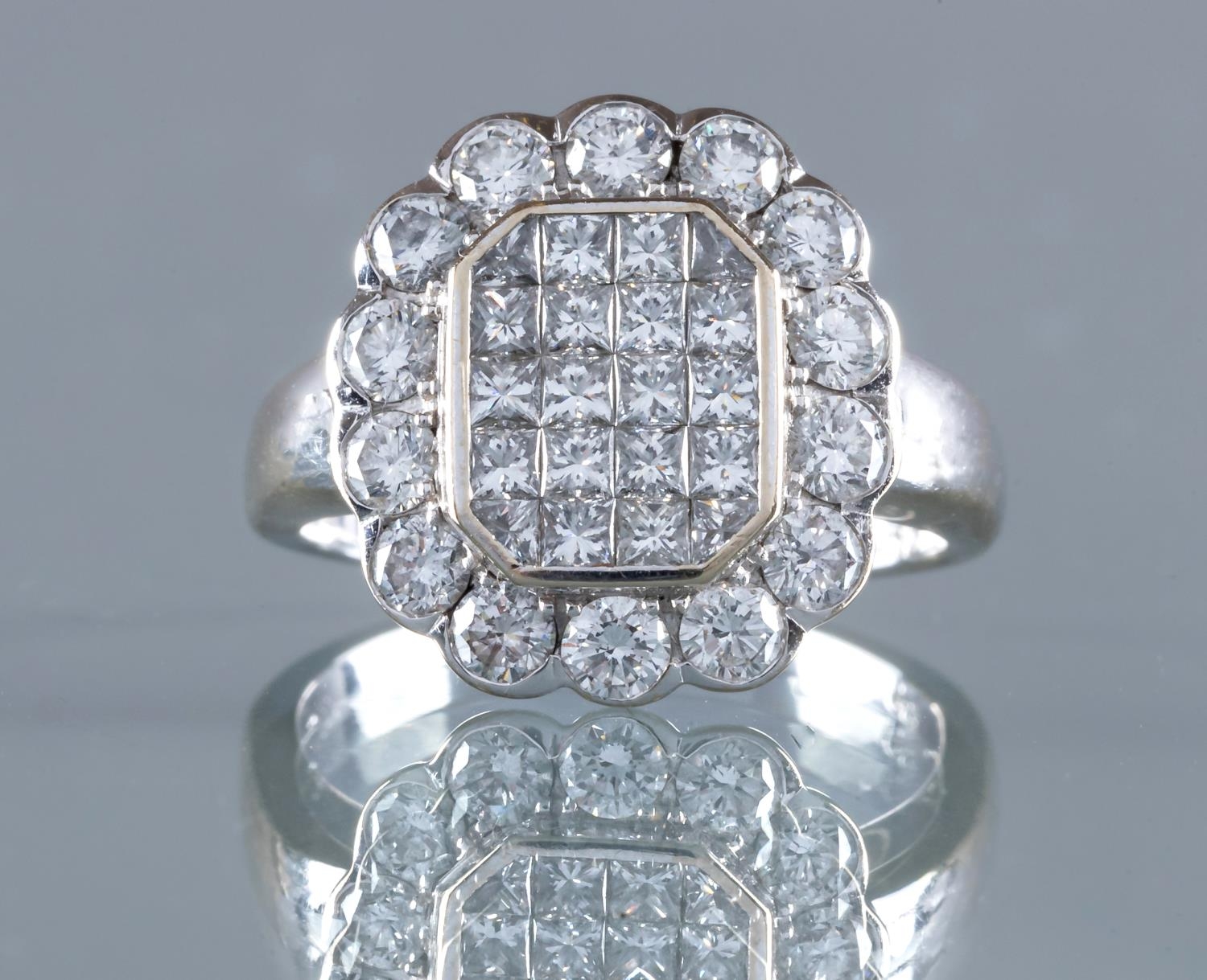 A DIAMOND CLUSTER PLAQUE RING, the central oblong panel channel set with sixteen Princess cut stones with a triangular stone to each corner, in a plain bezel, the outer border set with fourteen round brilliants to a plain wide white shank stamped 18ct, size Q (Illustrated) (Est. plus 24% premium inc. VAT)