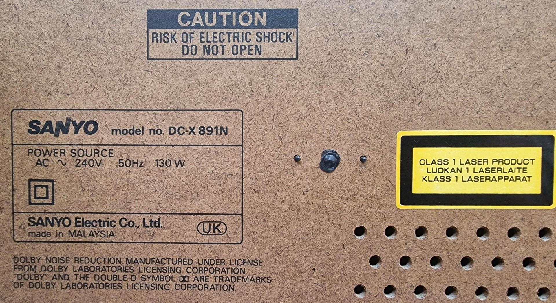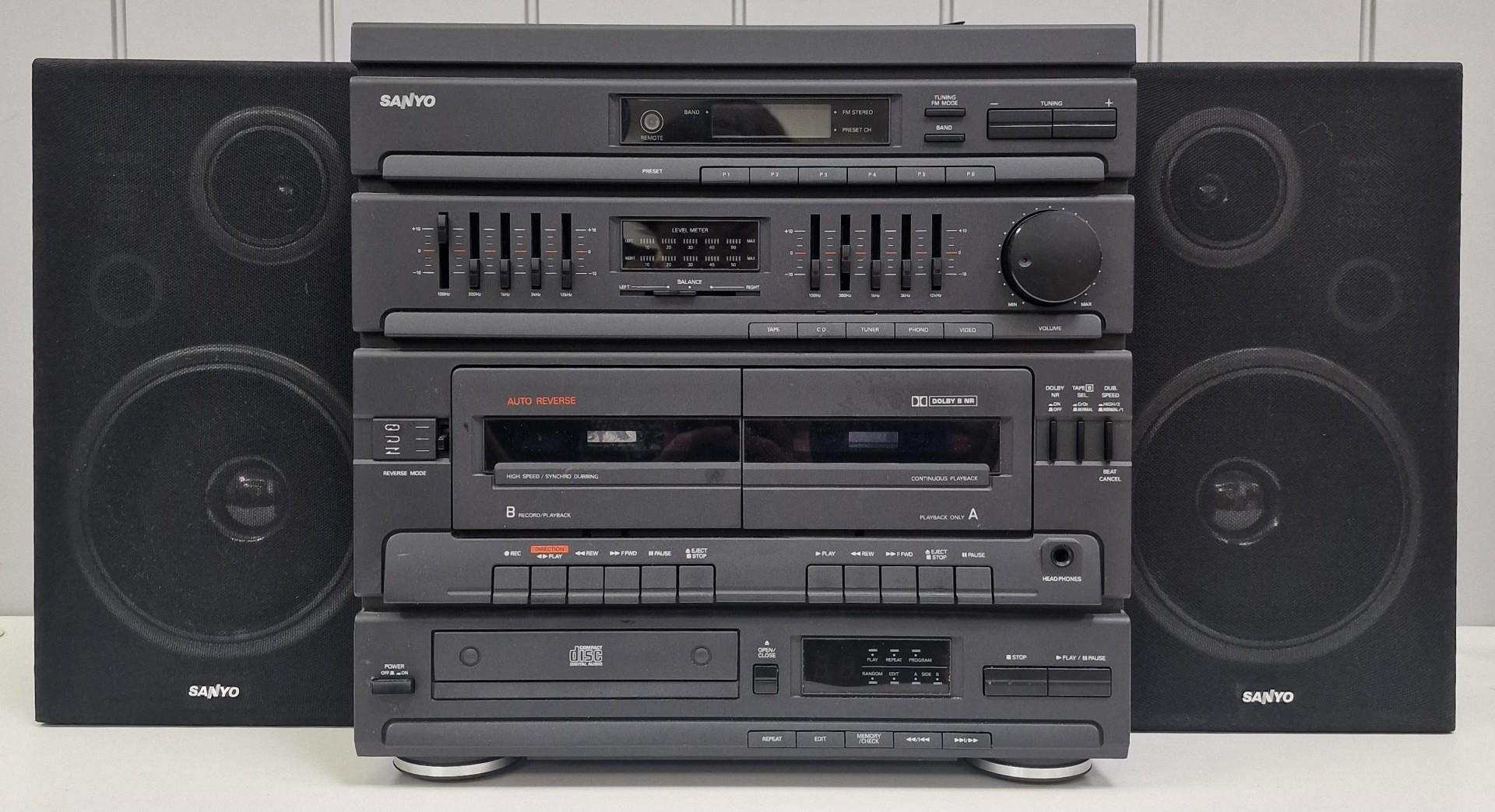 A Sanyo Hi-Fi system, model no. SX-892. Turntable (cover present but damaged hinge), amp, twin cassettes, CD player & speakers. PAT test pass & functionality test indicates in working order.