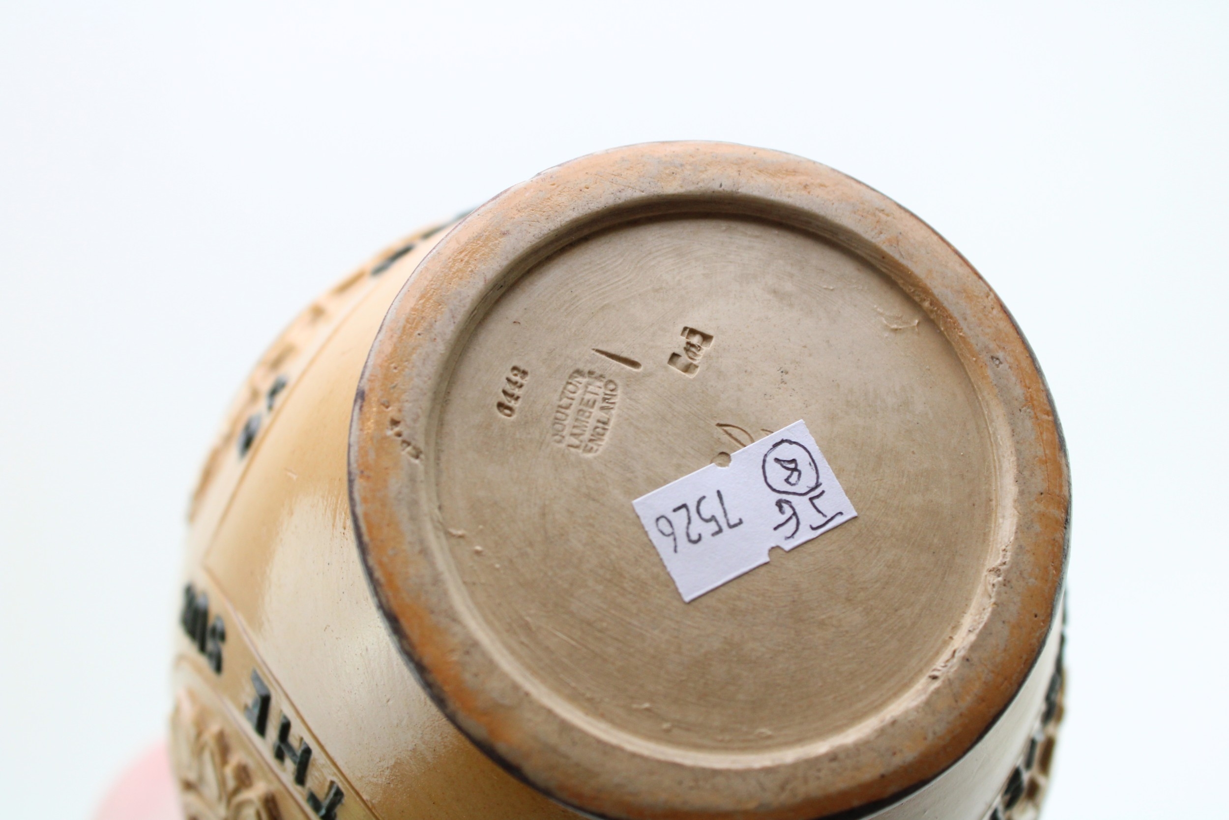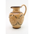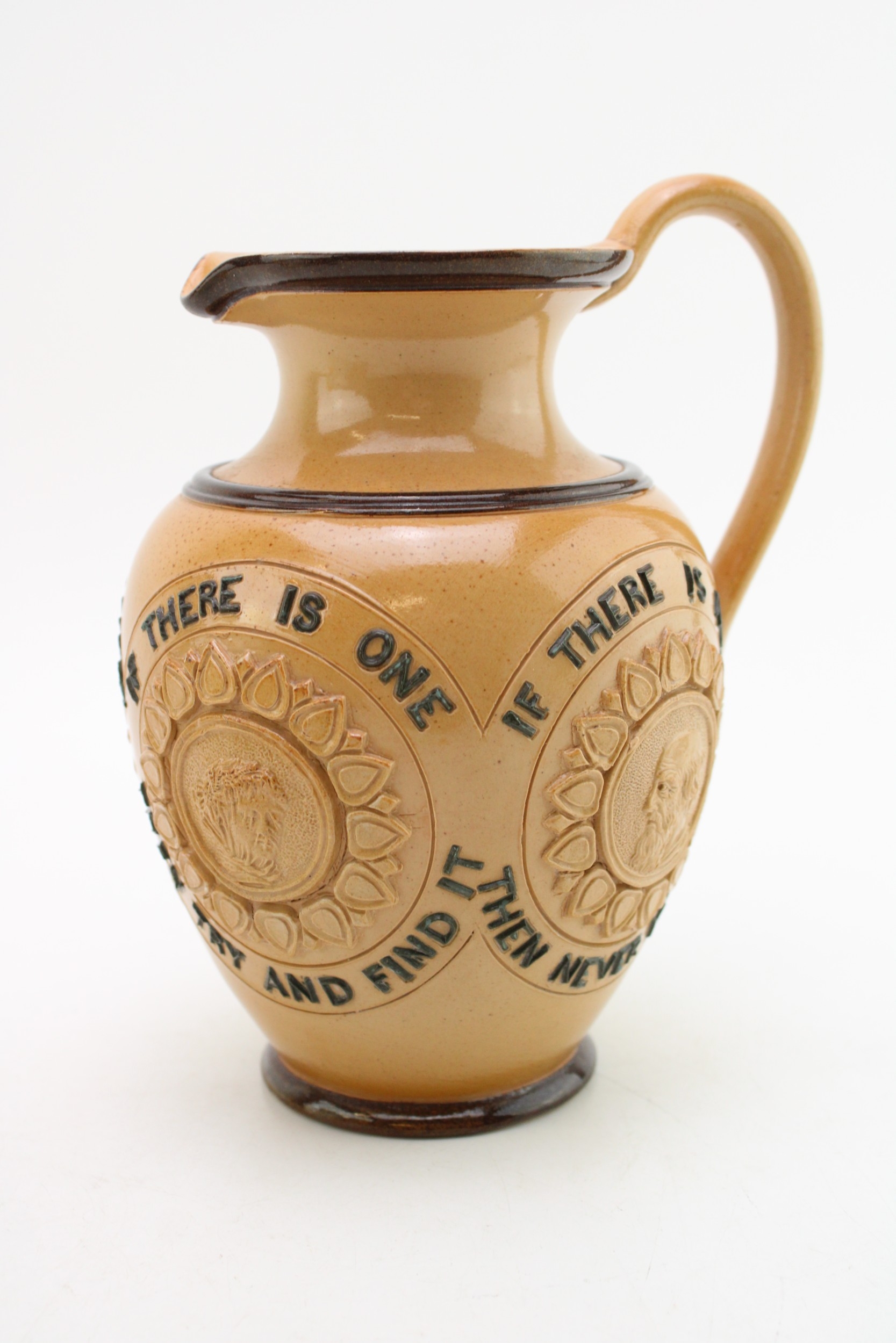 Doulton Lambeth stoneware moto jug, 'For Every Ill Beneath the Sun...', 19cm tall.