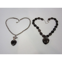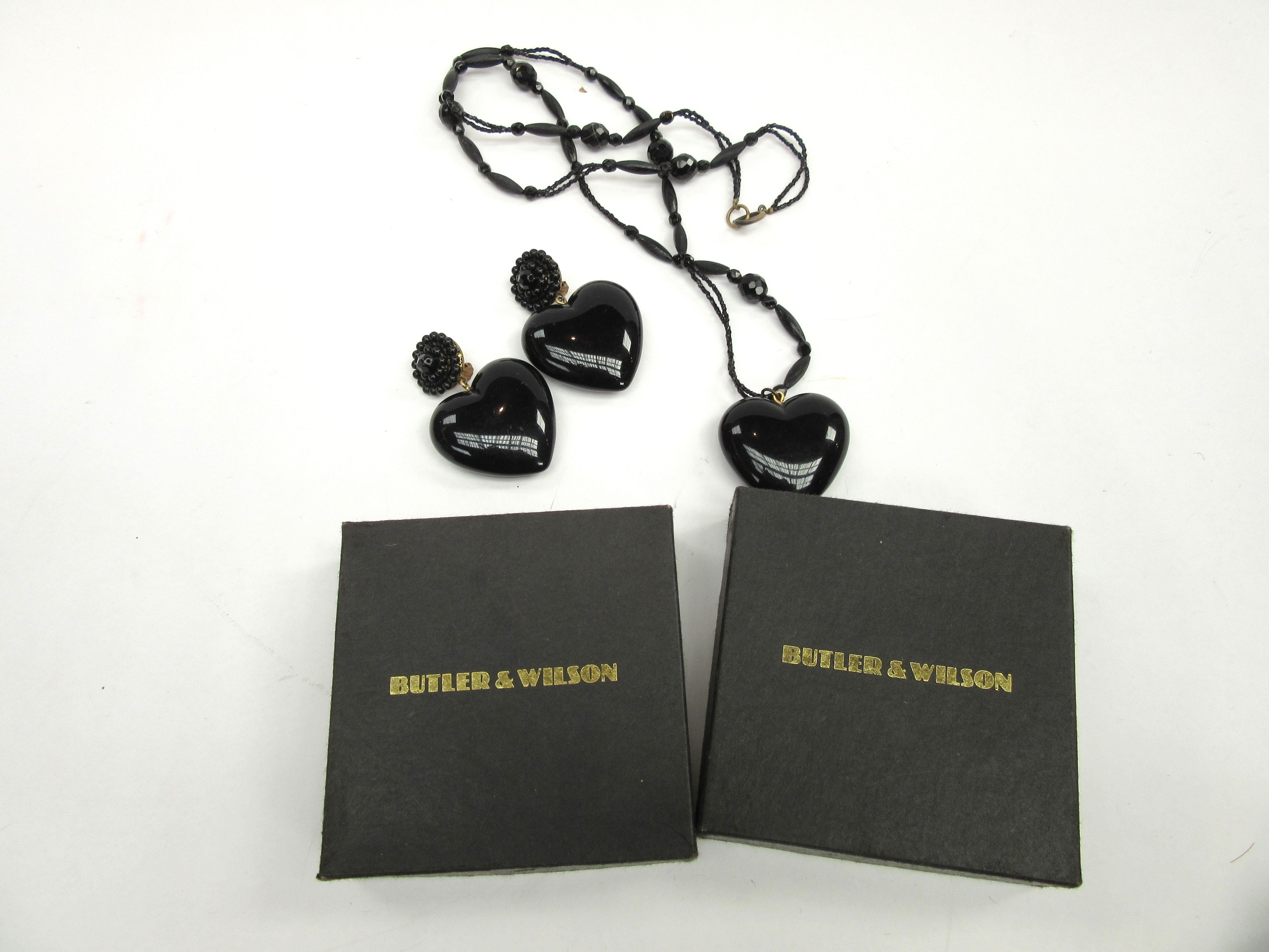 A Butler and Wilson black bead necklace with large black heart shaped pendant and a pair of matching clip-on earrings, both boxed