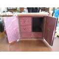 An oak smokers cabinet, the twin doors enclosing three drawers, 31 cm wide, 32.5 cm high