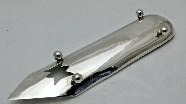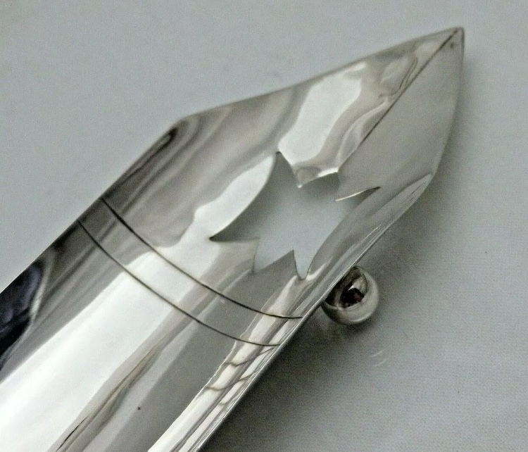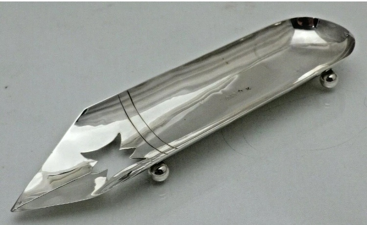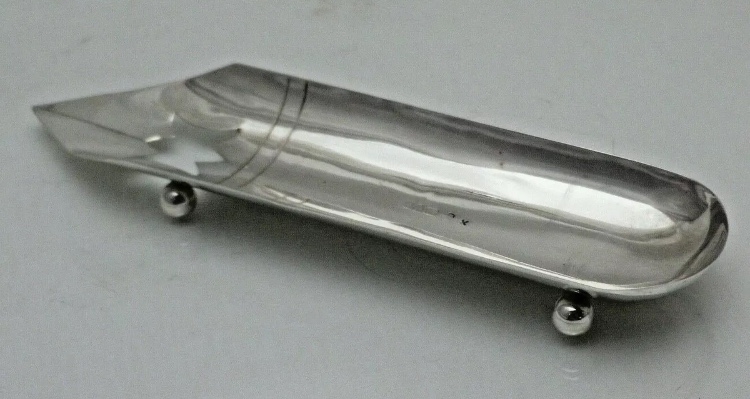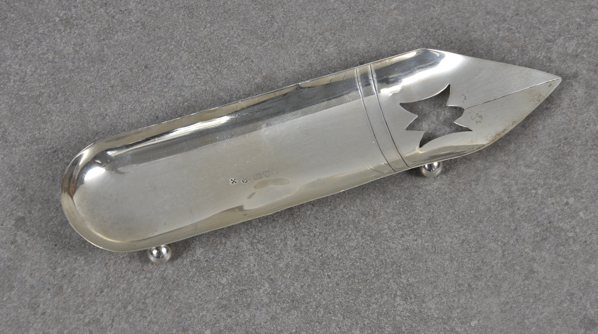 A rare novelty Victorian pen tray modelled as a nib James Deakin & Sons, Chester, 1890, of typical form but larger, raised on four ball feet, 7in. (17.8cm.) long, 1.05 tr.oz. Scarce *Hallmarks rubbed, otherwise good.