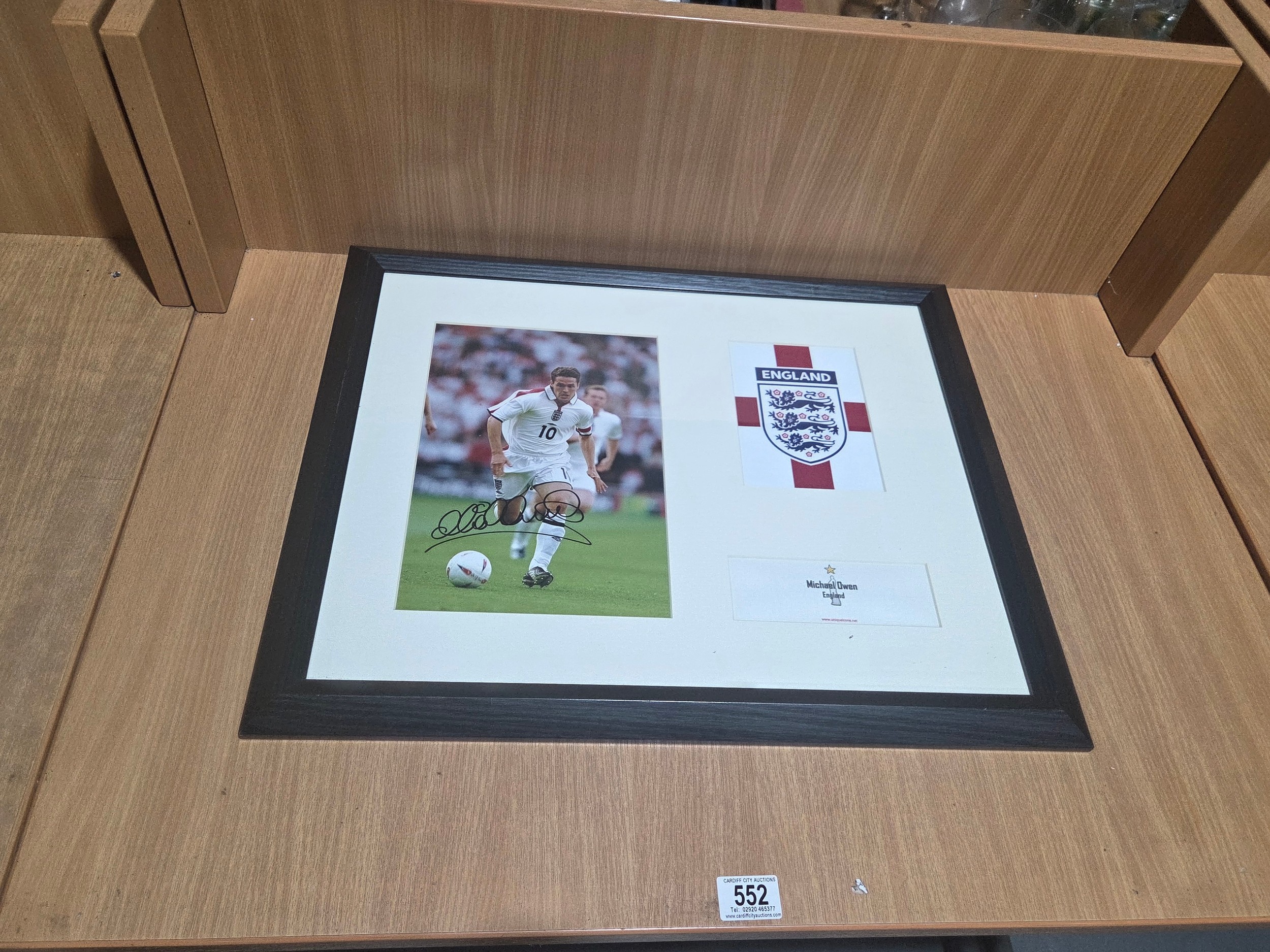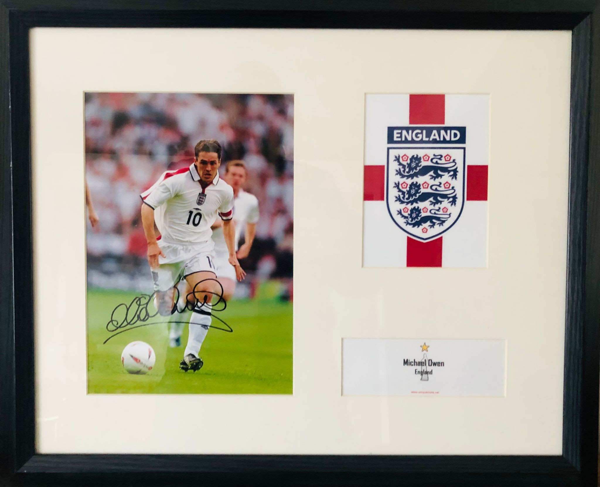 A framed signed photograph of English footballer Michael Owen with certificate of authenticity