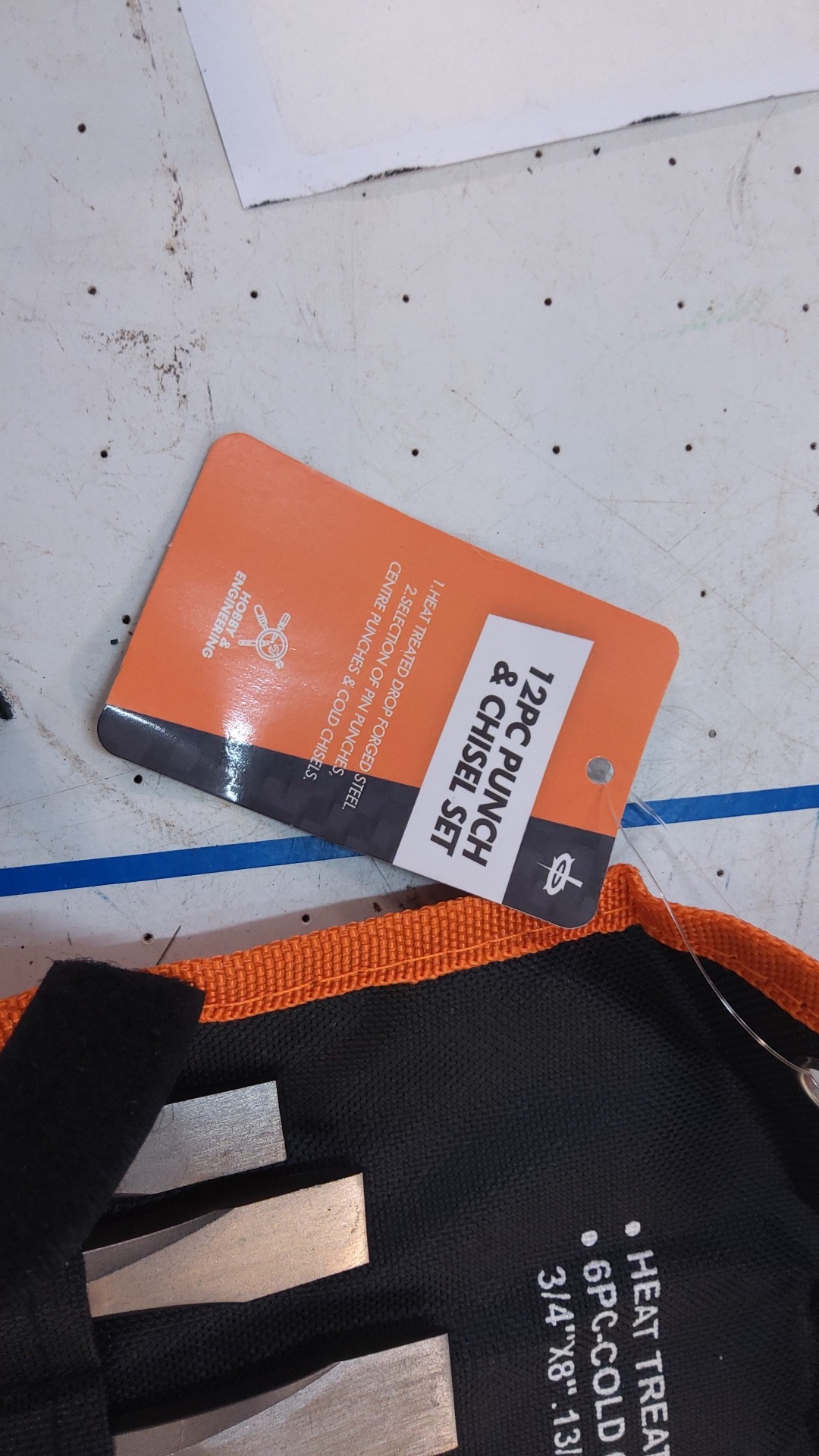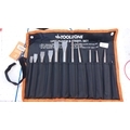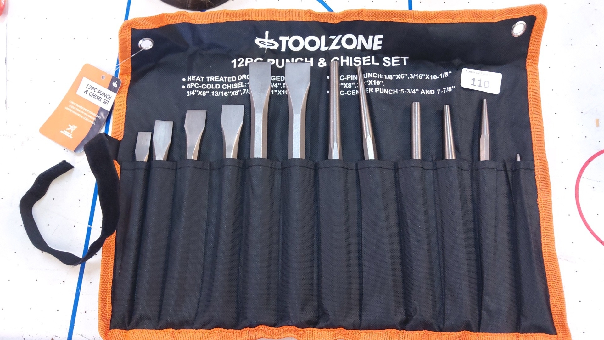 Toolzone 12-piece punch and chisel set—heat-treated drop-forged steel comprising various cold chisels, pin punches and a centre punch—housed in a black nylon roll with orange binding and carry strap.