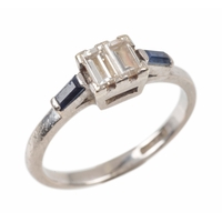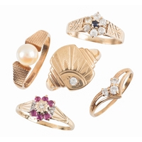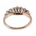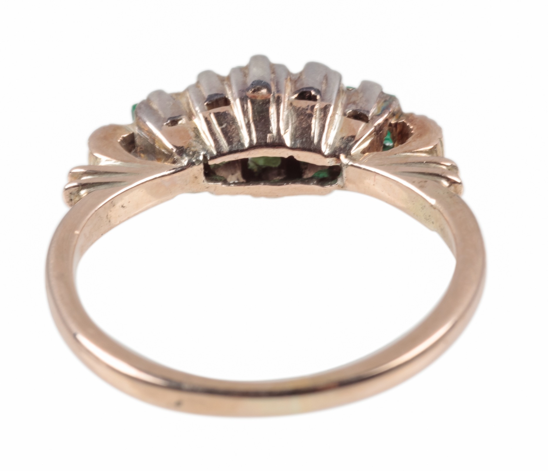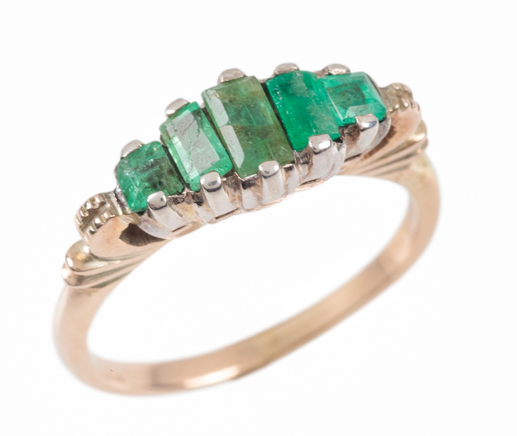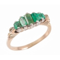 AN EMERALD FIVE STONE RINGset with graduated rectangular and square cut emerald, unmarked, surface testing as 9ct, ring size L 1/2, c. 2.8 grams