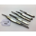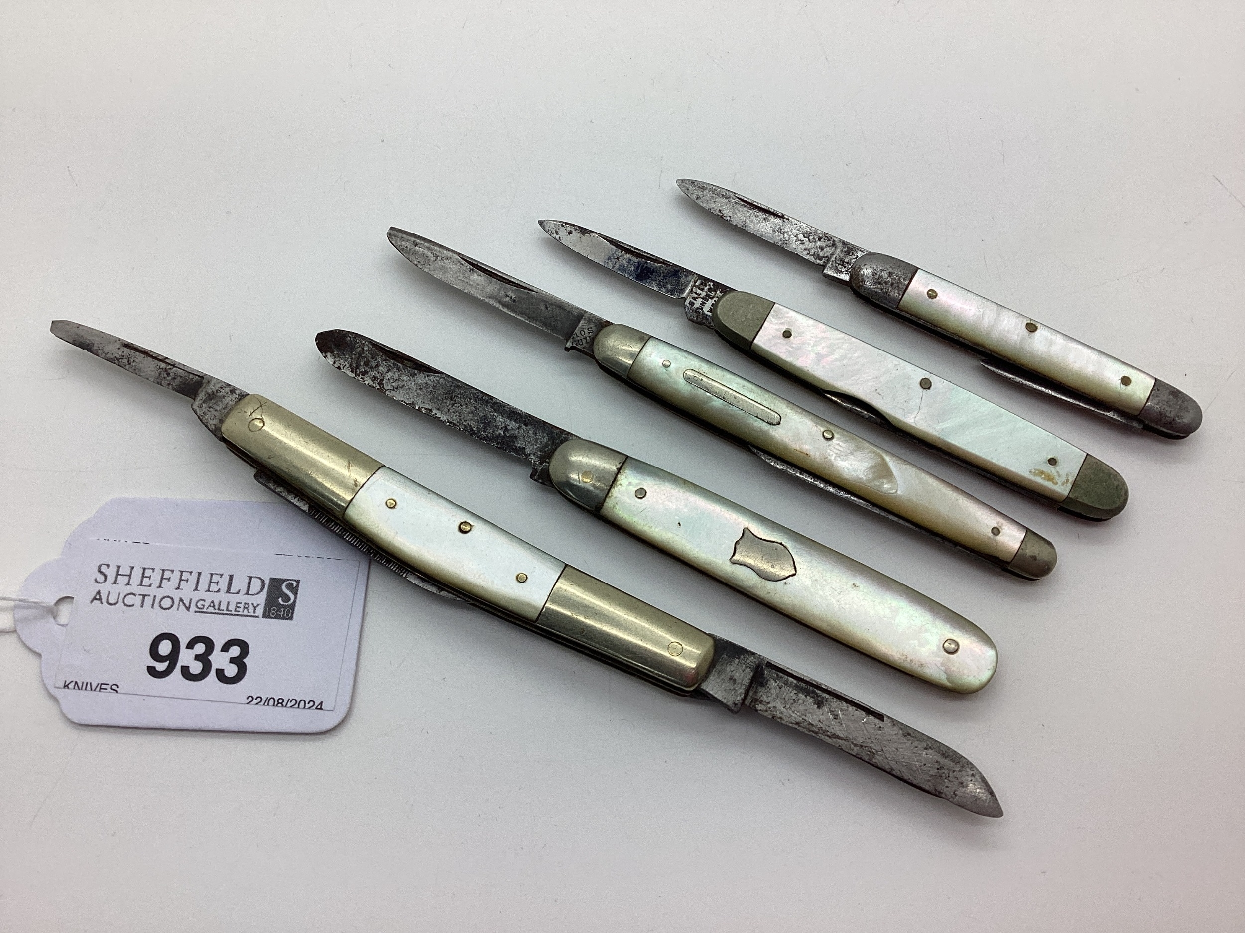 A Collection of Assorted Folding Pocket Knives, mother of pearl scales, nickel bolsters (4.8cm-7.2cm closed). (5)