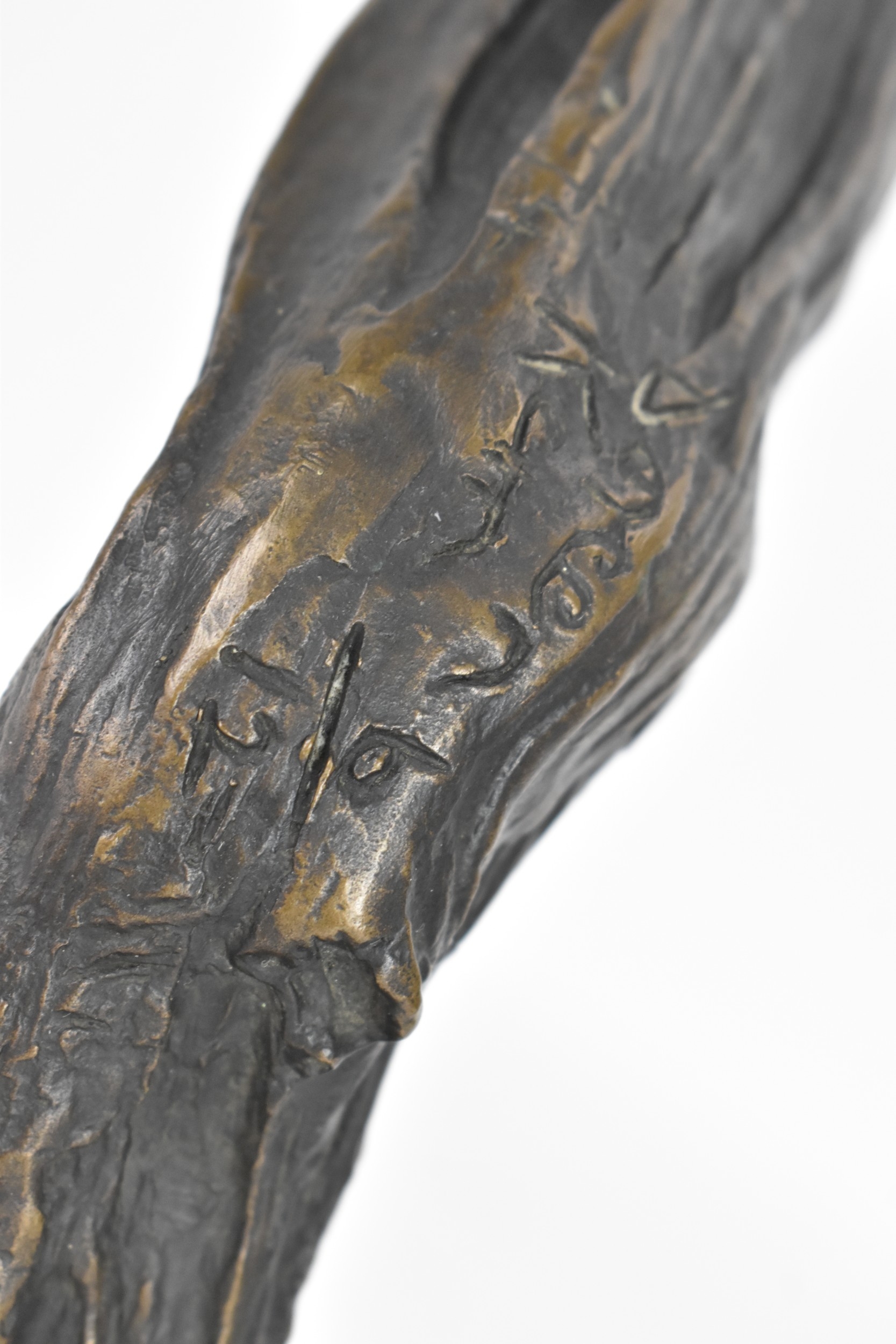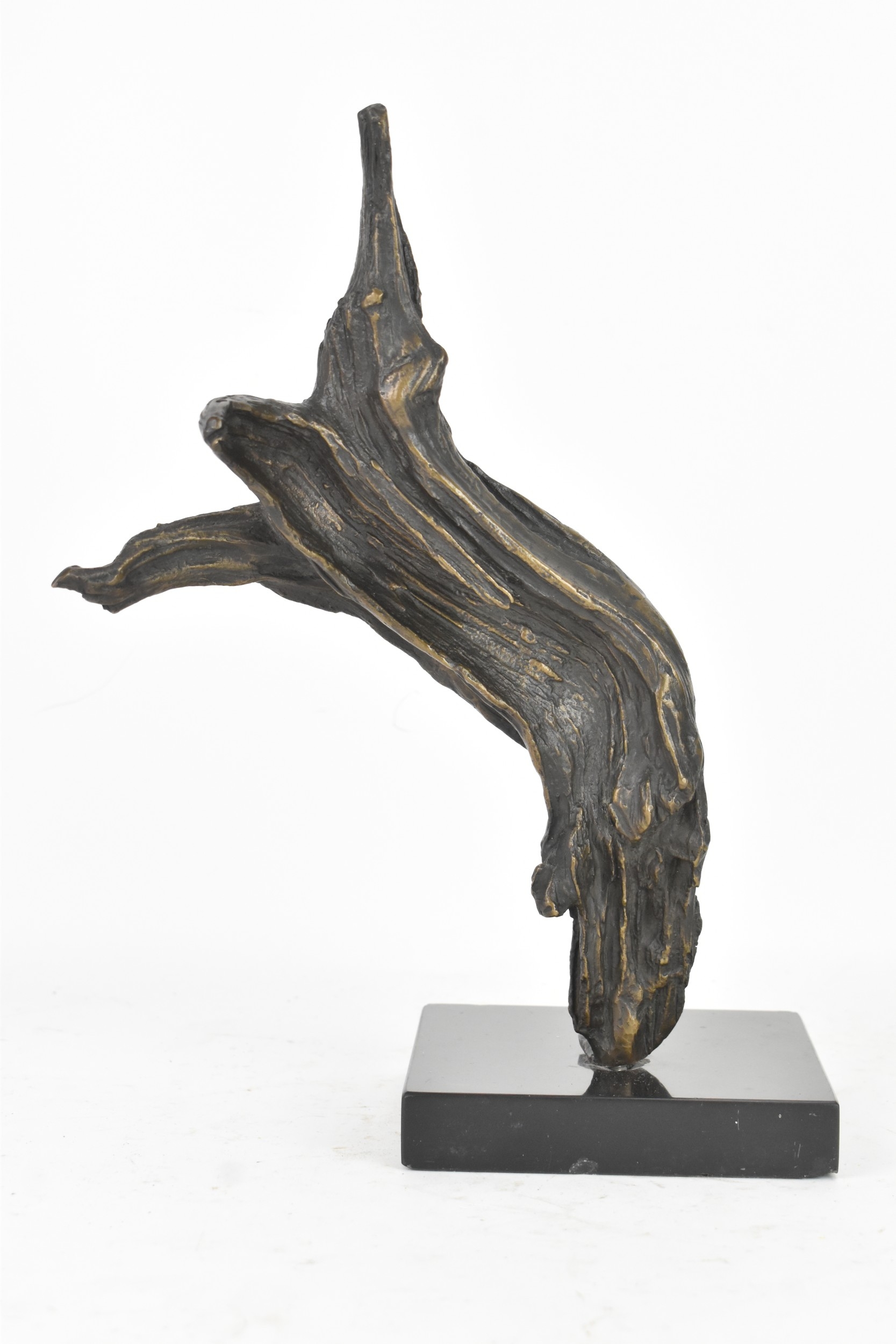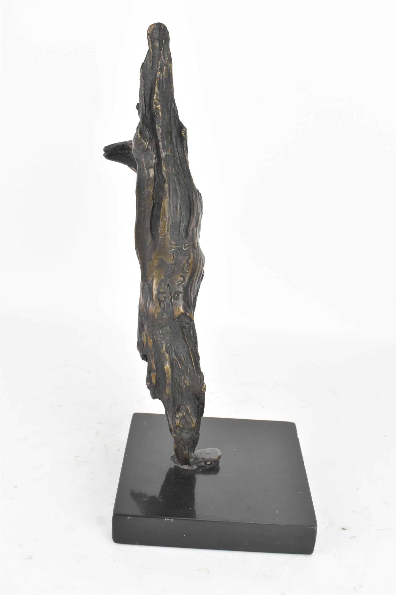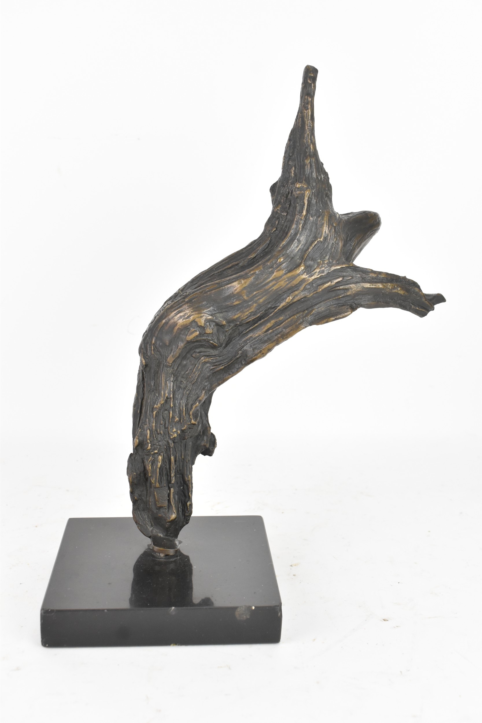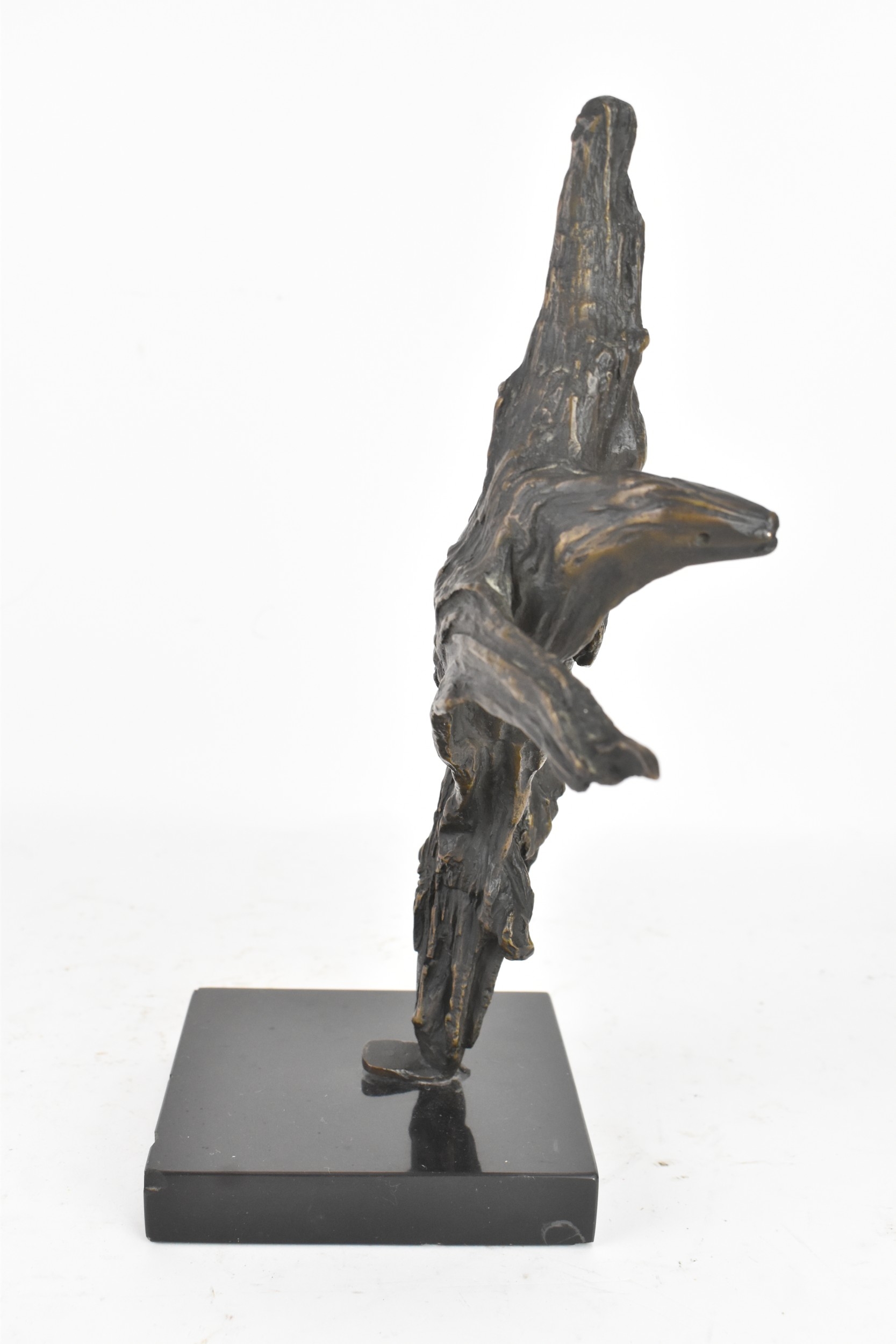 Doreen Kern (British 1931-2021) a limited edition bronze sculpture of a bird with outstretched wings modelled as a piece of gnarled driftwood, 1974, incised signate and date, numbered 6/12, mounted on a marble base, 31cm high
