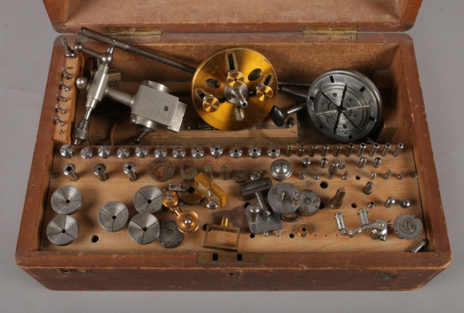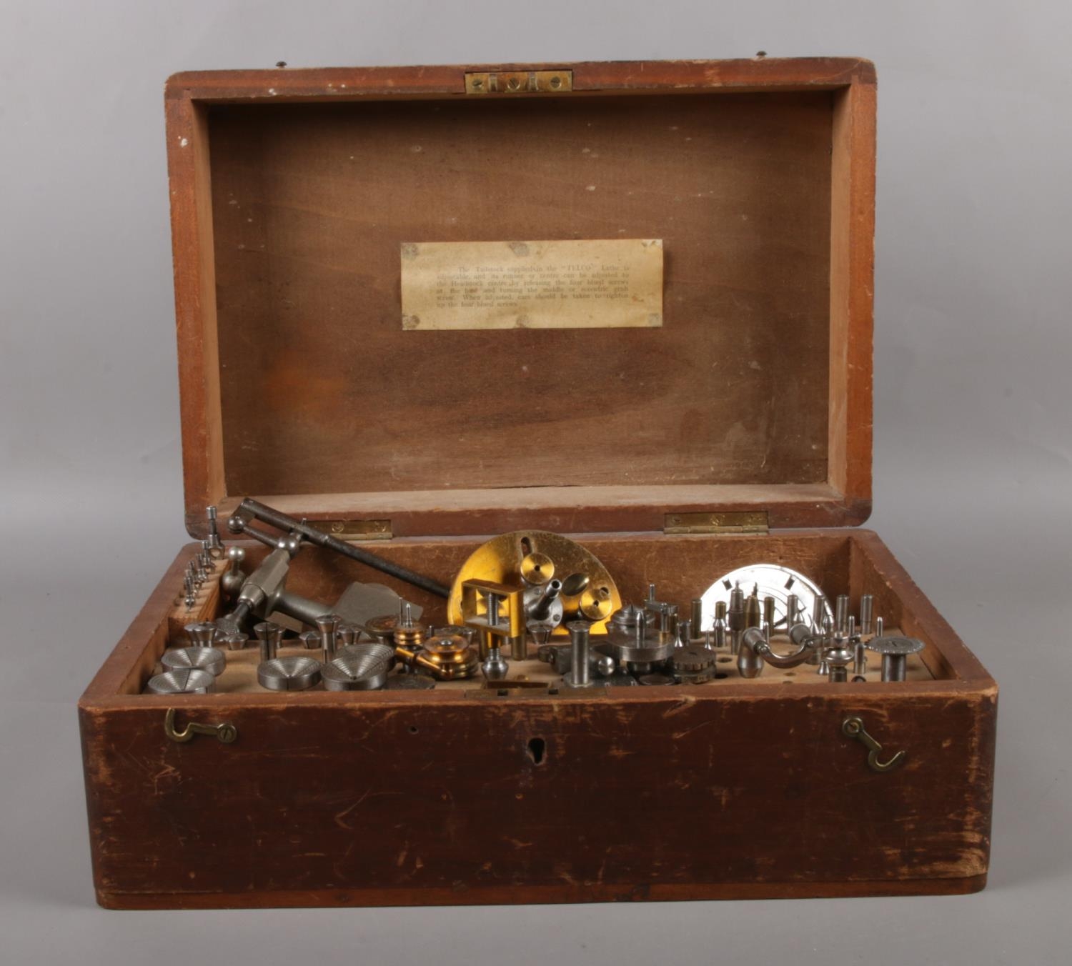 A Telco Ltd Tailstock & other watchmaker's accessories. In Oak case 33.5cm W