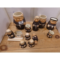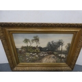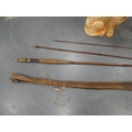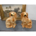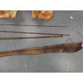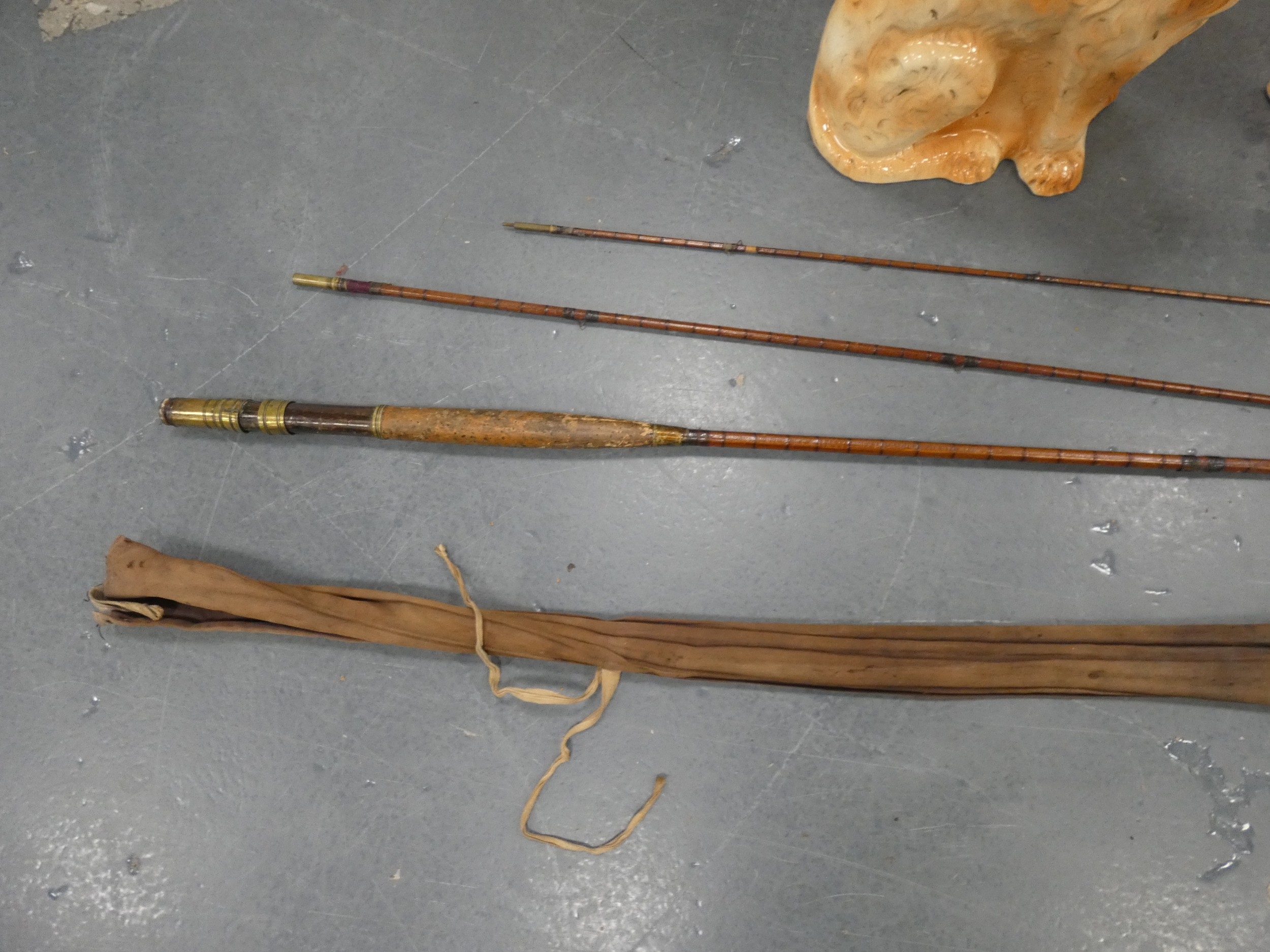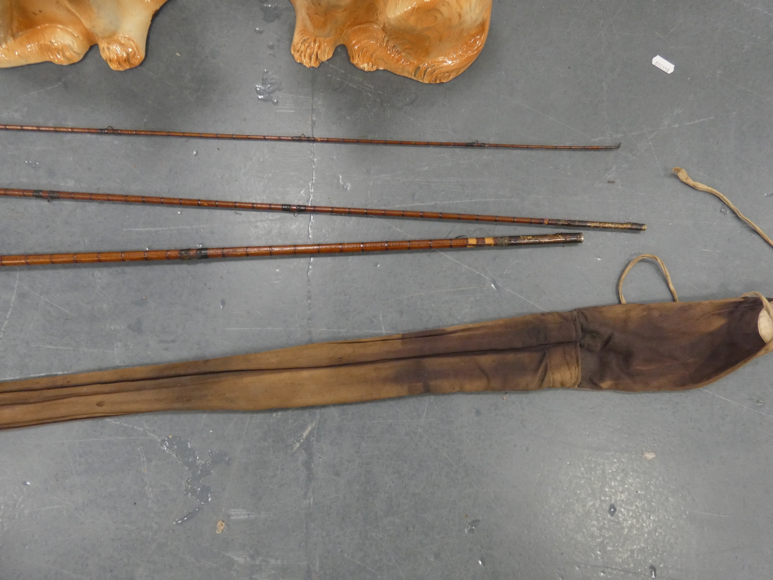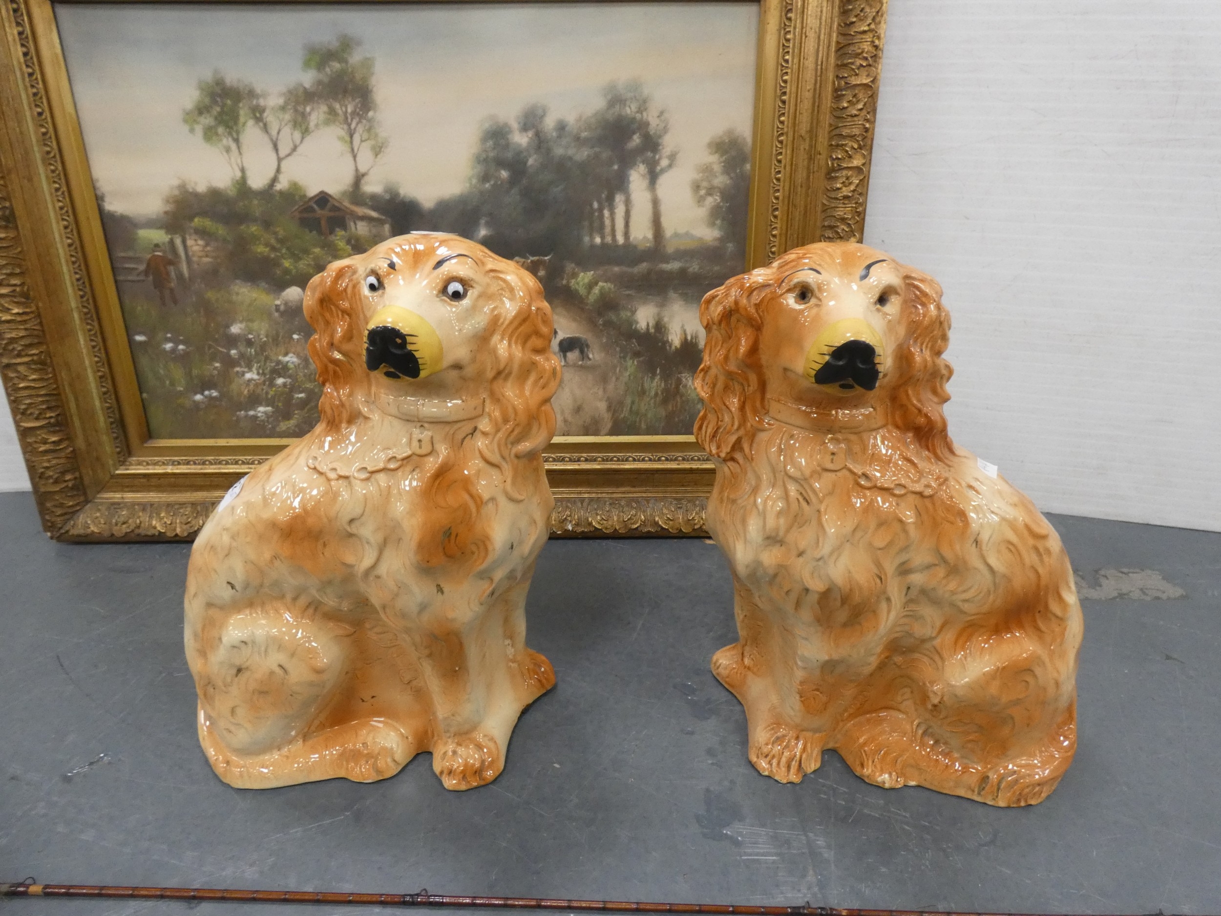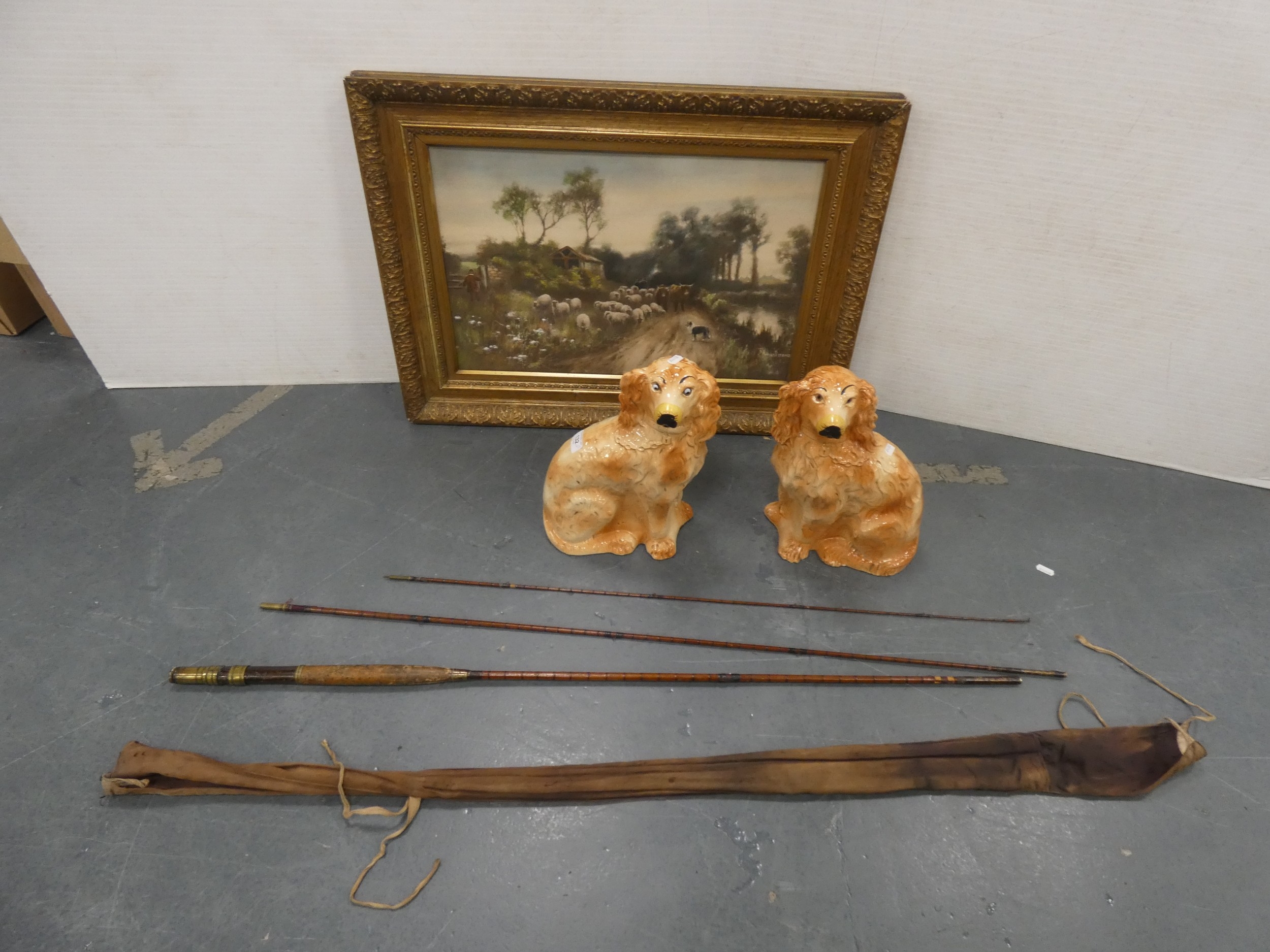 Pair of vintage ceramic wally dogs, gilt framed print and a three-piece split cane fishing rod in canvas carry bag.