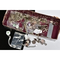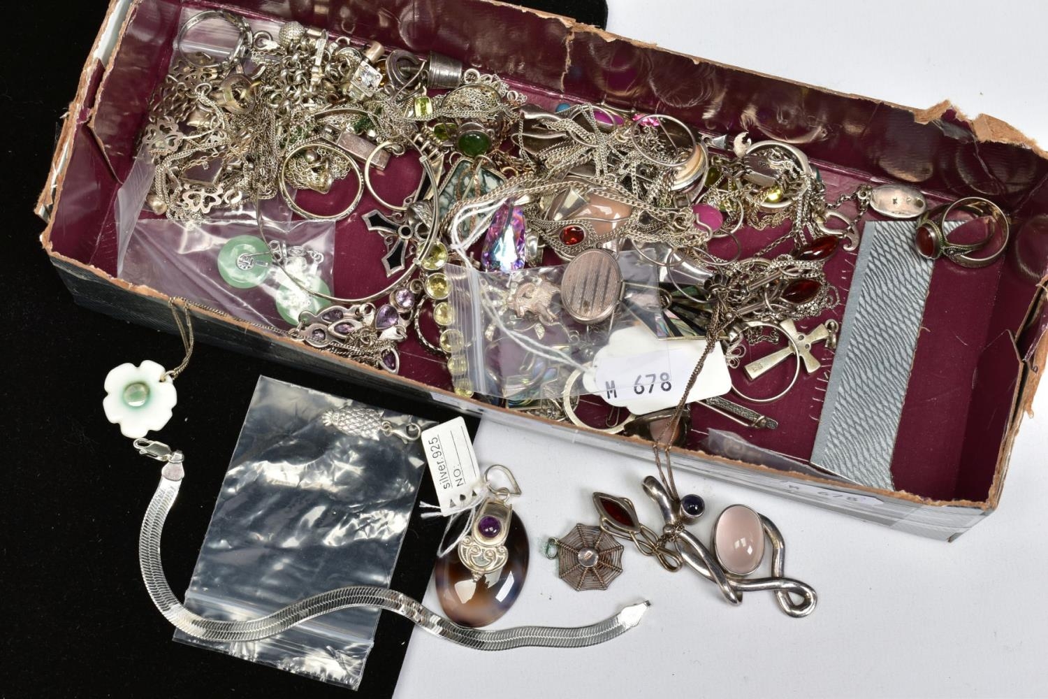 A SELECTION OF SILVER AND WHITE METAL JEWELLERY, to include a Wedgwood ring, a Siam tie clip, an amethyst pendant, further gem set jewellery, charms, necklaces, chains, brooches, pendants etc, most with marks to indicate silver, approximate total weight 284 grams, together with a 9ct gold chain bracelet, with 9ct import mark, length 200mm, approximate weight 1.2 grams