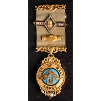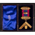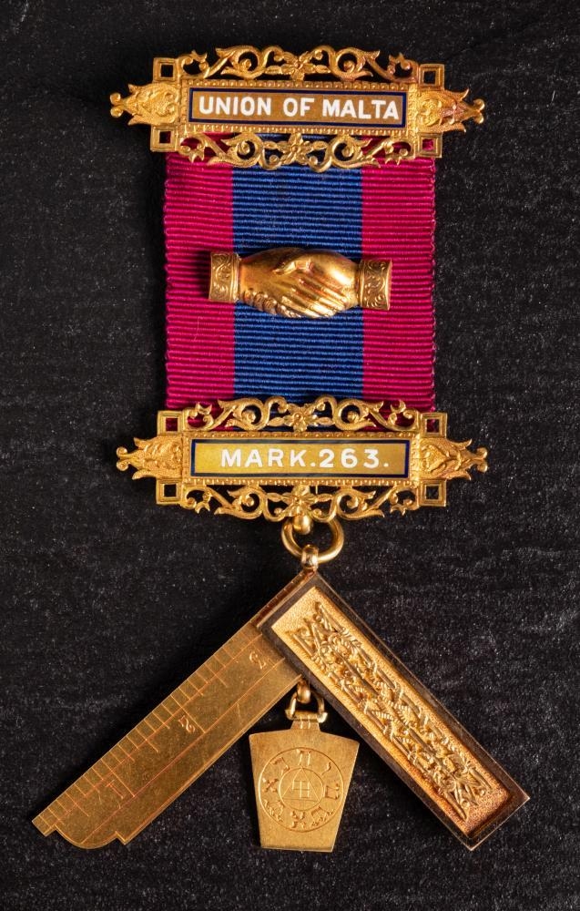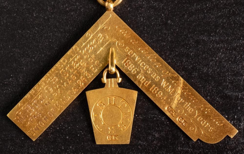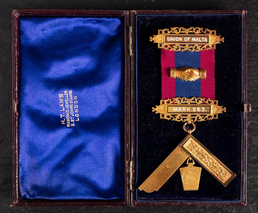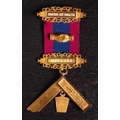 A Victorian 18ct gold 'Union of Malta' Masonic jewel: with blue and burgundy ribbon, gold and enamel bars and square suspension, inscribed and dated to reverse 1894 & 1896, in a leather case with retailer's mark for H T Lamb, London, 38.1g