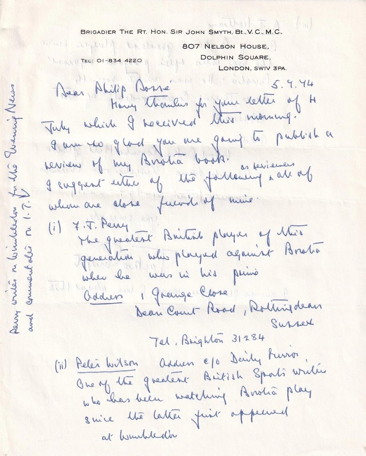 Letter Signed by Sir John 'Jackie' Smyth VC. Awarded Victoria Cross in WW1. 2 Page handwritten Letter Dated 5 7 74 Personally Signed by Brigadier Sir John George Smyth, 1st Baronet, VC, MC. (24 October 1893 - 26 April 1983), often known as Jackie Smyth, was a British Indian Army officer and a Conservative member of Parliament. During WWII, he led a unit in France and during the evacuation of Dunkirk, and in the Burma campaign. Although a recipient of the Victoria Cross. After passing out from Sandhurst, Smyth was Commissioned as a 2nd Lieutenant with the British Indian Army on 24 August 1912, [ and was commissioned into the 15th Ludhiana Sikhs on 5 November 1913. He was promoted to lieutenant on 24 November 1914, three months after the outbreak of the WW1. I the 15th Ludhiana Sikhs, 3rd (Lahore ) Division, Indian Army during the First World War, when his actions earned him the Victoria Cross (VC). In June 1915, The citation for this award, published in the London Gazette read: For most conspicuous bravery near Richebourg L'Avoue on 18 May 1915. With a bombing party of 10 men, who voluntarily undertook this duty, he conveyed a supply of 96 bombs to within 20 yards of the enemy's position over exceptionally dangerous ground, after the attempts of two other parties had failed. Lieutenant Smyth succeeded in taking the bombs to the desired position with the aid of two of his men (the other eight having been killed or wounded), and to affect his purpose he had to swim a stream, being exposed the whole time to howitzer, Shrapnel, Machine Gun and rifle fire. As well as Smyth's VC, the Indian Distinguished Service Medal was posthumously awarded to the men killed during this incident. Smyth was also awarded the Russian Order of St George, Fourth Class, in 1915, and was promoted to Captain on 24 August 1916. Smyth continued his war service in Egypt and on the North-West Frontier. Good condition. All autographs come with a Certificate of Authenticity. We combine postage on multiple winning lots and can ship worldwide. UK postage from £5.99, EU from £7.99, Rest of World from £9.99