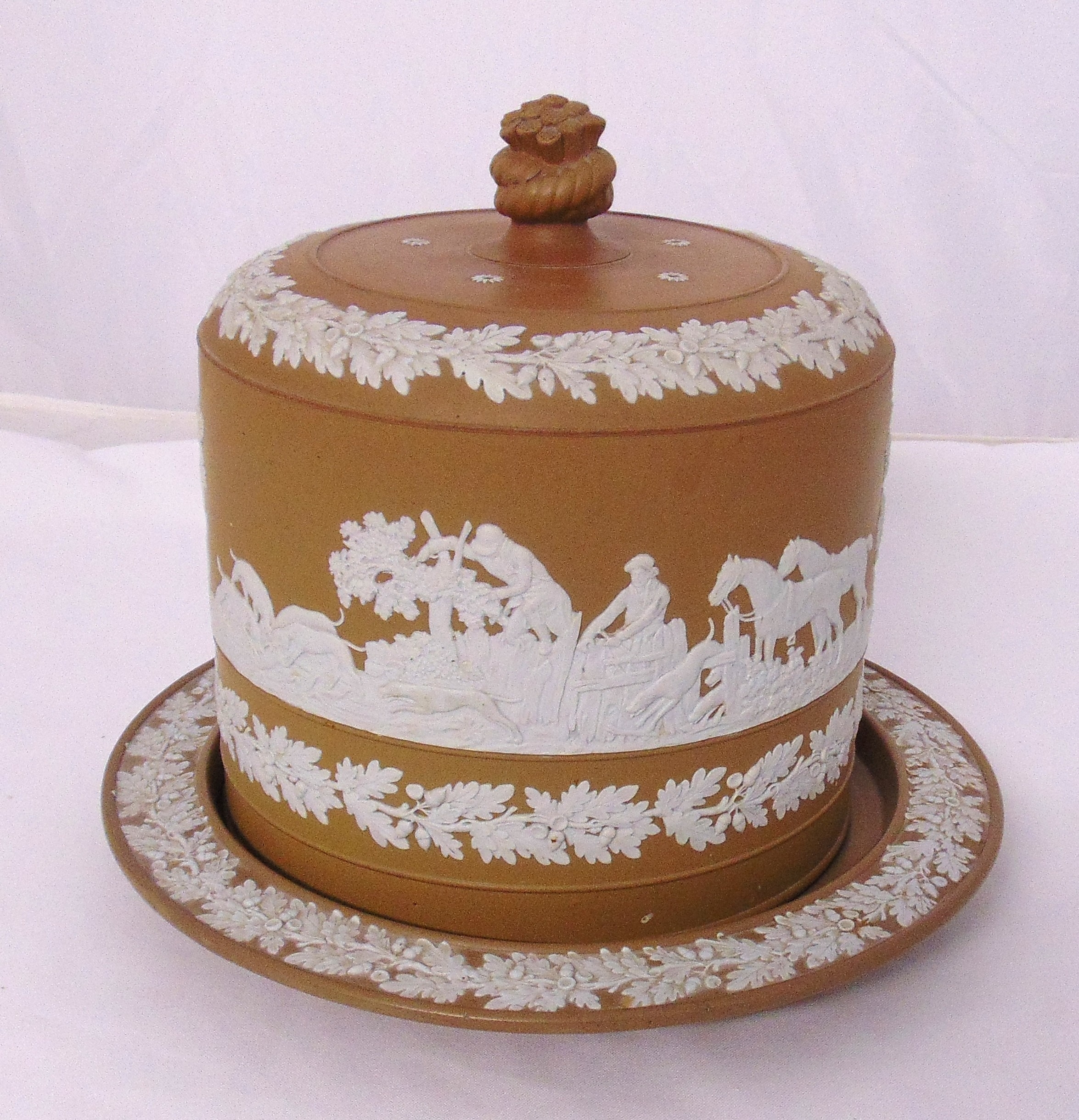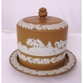 A 19th century Wedgwood Jasperware light brown colourway cheese board and cover decorated with hunting scenes and flowers, the pull off cover with floral finial, 25.5 x 31.5cm