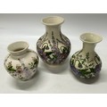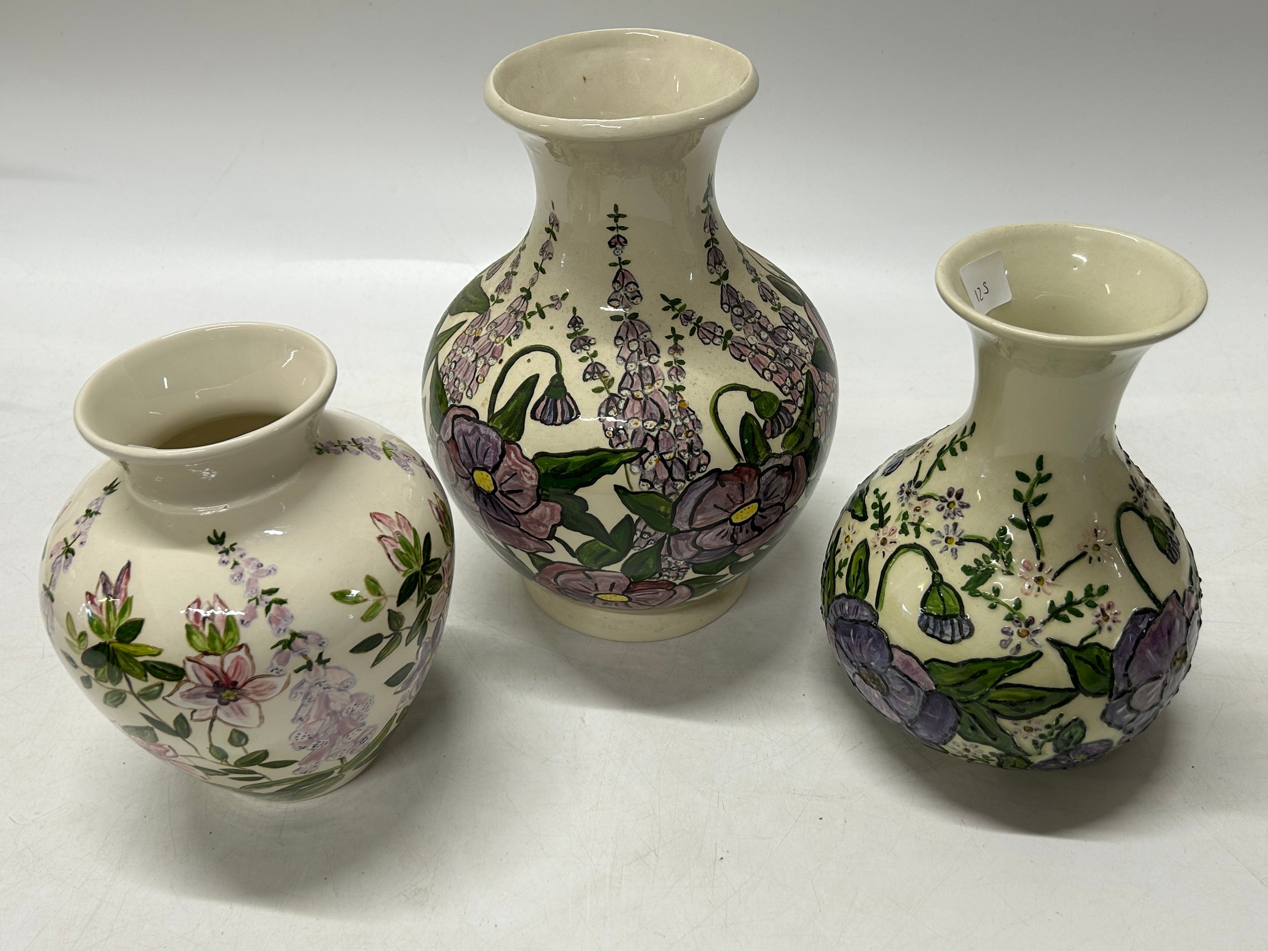 Three Tupton style vases, cream ground decorated flowers in lilac - 10in. x 8in. and 7in. high