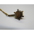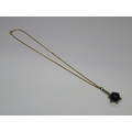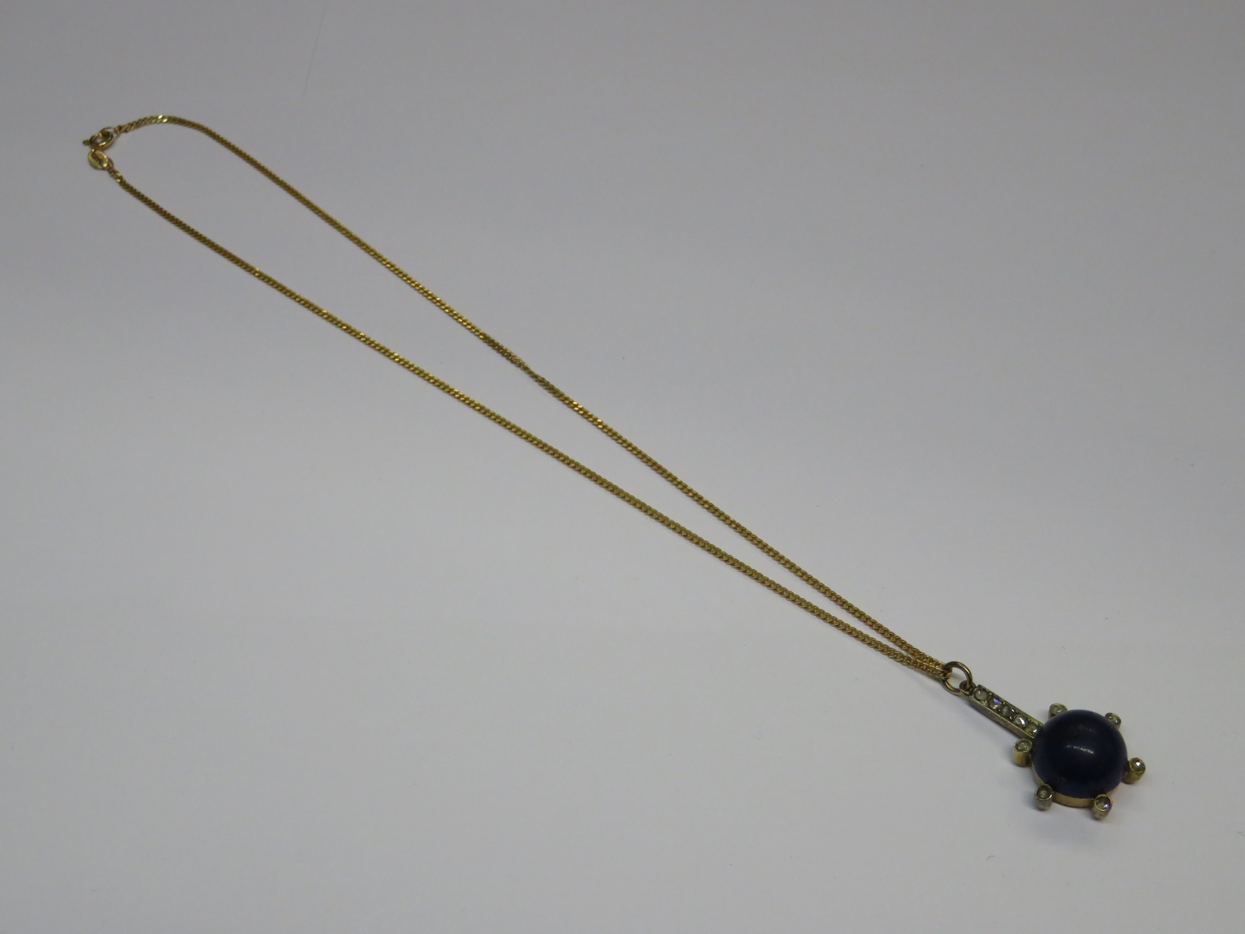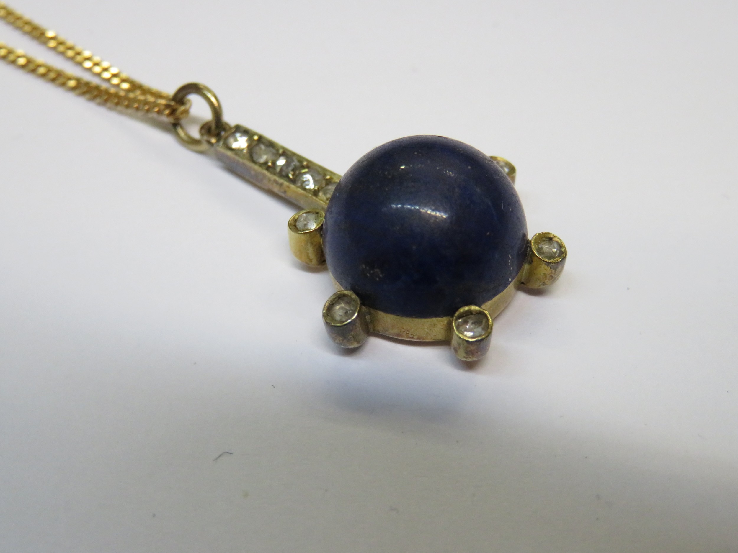 Unmarked yellow metal lapis lazuli and rose cut diamond set pendant on 9ct Gold chain, the chain 2.5g