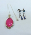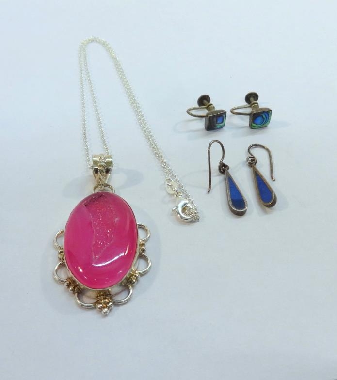 Silver/White Metal Jewellery marked 925: pink crystal pendant, pair shell screw-on earrings & pair drop earrings
