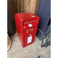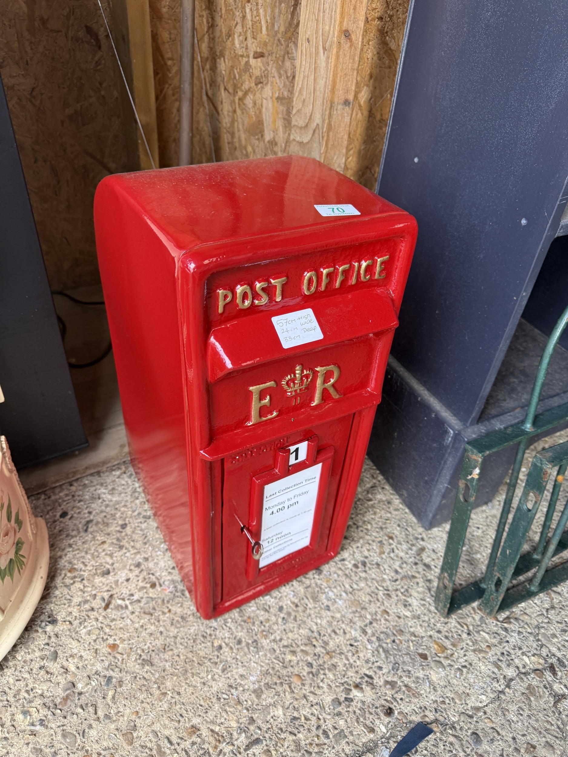 new with key red metal post box, measures 57cm high, 24cm wide, 33cm deep