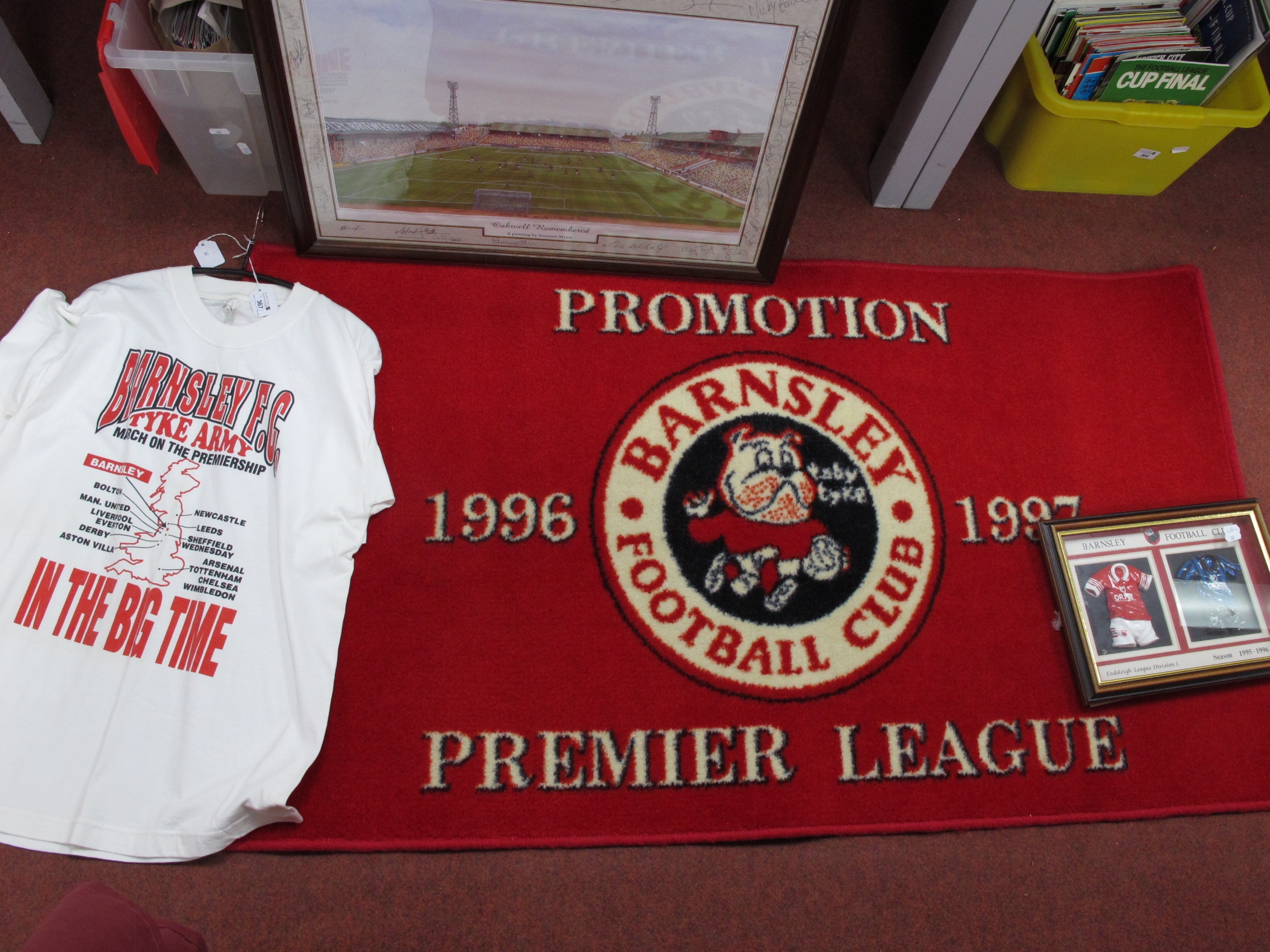 Barnsley F.C Oakwell Remembered, Ltd Edition Colour Print of 500, by Suzanne Myers, signed by Artist and approximately twenty seven players, including Danny Wilson, Eric Winstanley, Nicky Eaden, Neil Redfearn, Darren Sheridan, framed, overall 51 x 66cm, Premier League Promotion Rug, 95-6 Strip Montage, March on The Premiership T-Shirt. (4)