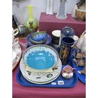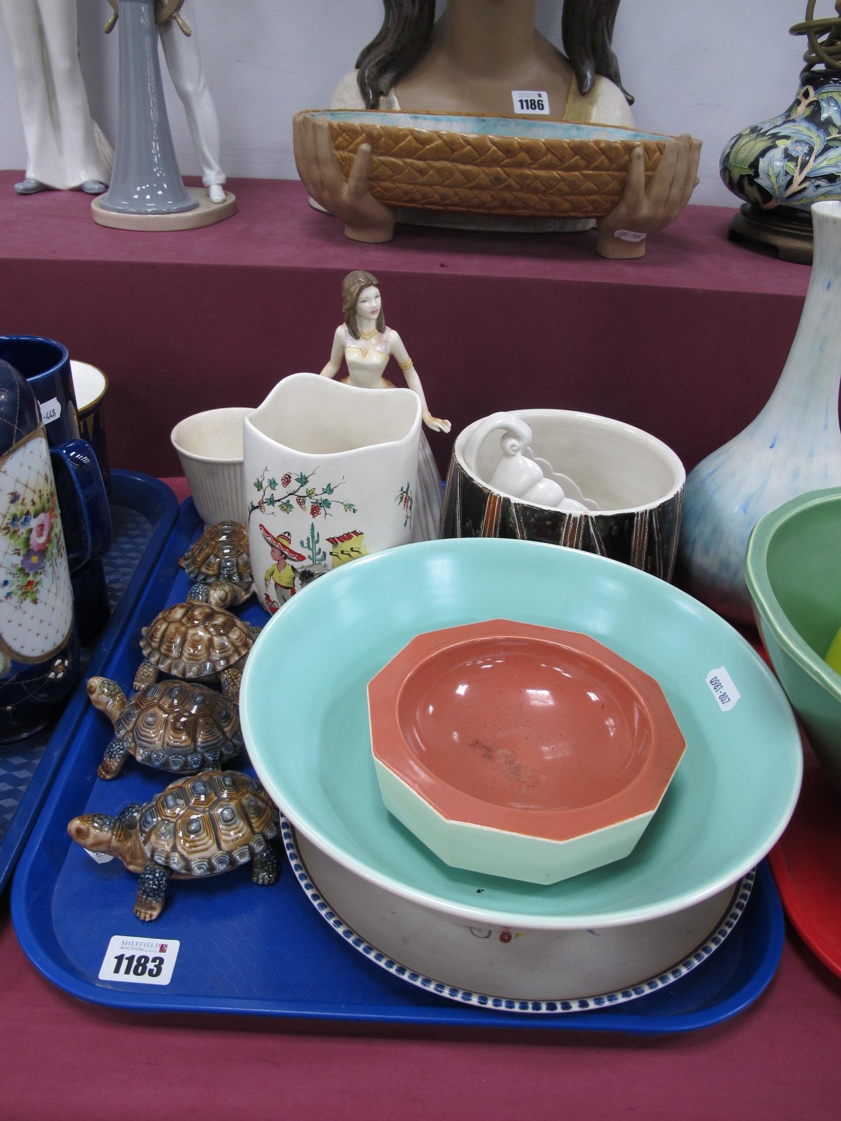 Poole Pottery, to include plate with hand painted flower design, 2.3cm, large pink bowl with blue interior, dish and pot, four Wade tortoises and Royal Doulton Happy Birthday 2003 figurine etc:- One Tray.