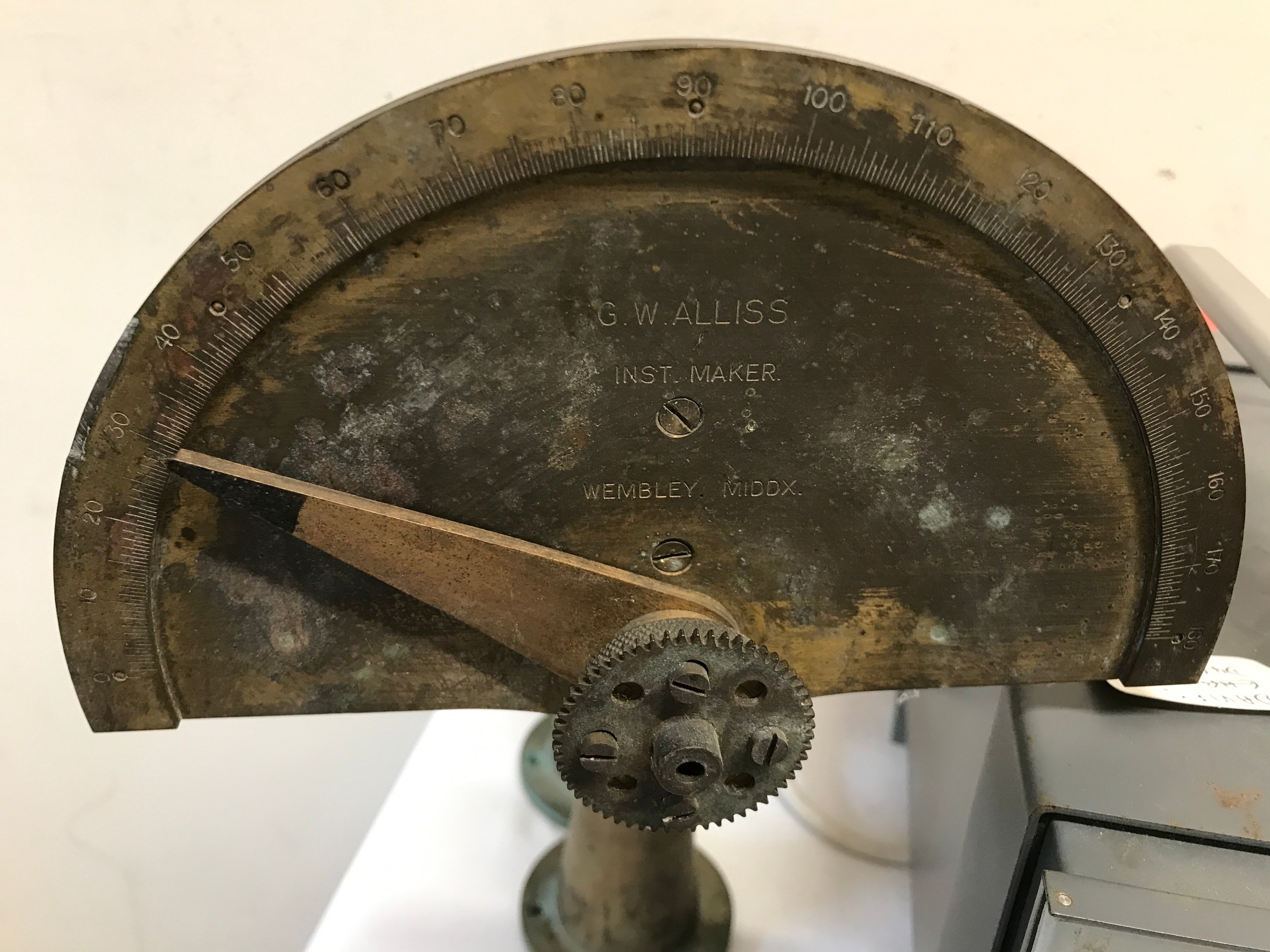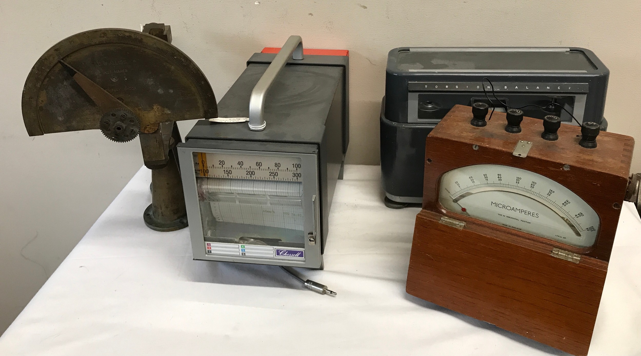 Scientific instruments to include Microamperes meter, Chessell recorder, Torsion balance scales and unknown instrument by G.W. Alliss, Inst maker, Wembley Middlesex.