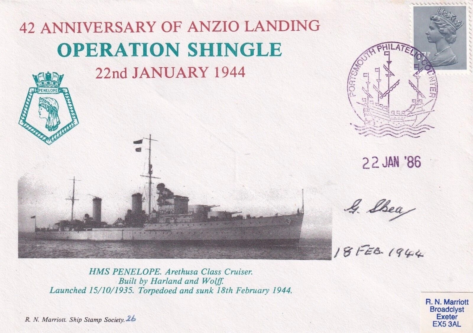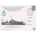 HMS Penelope 42nd Anniversary of Anzio Landing Signed by G. Skea crew member. 22 Jan 86 - Portsmouth - 42nd Anniversary of Anzio Landing Operation Shingle. Personally Signed by G. Skea crew member during this action. And on board when HMS Penelope was Torpedoed and Sunk 18th February 1944. 60 ISSUED. Single Vendor RAF cover collection. Good condition. All autographs come with a Certificate of Authenticity. We combine postage on multiple winning lots and can ship worldwide. UK postage from £5.99, EU from £7.99, Rest of World from £9.99