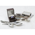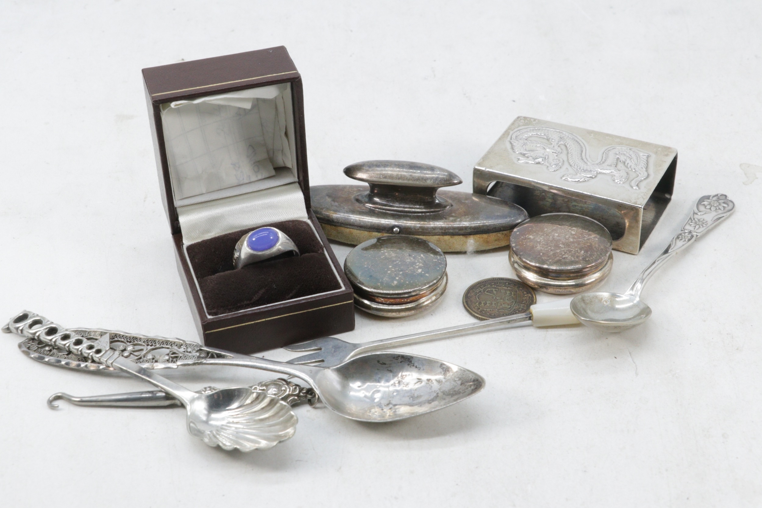 Two silver rings, a plated oriental matchbox holder, small silver pickle fork, 1816 coin, etc