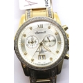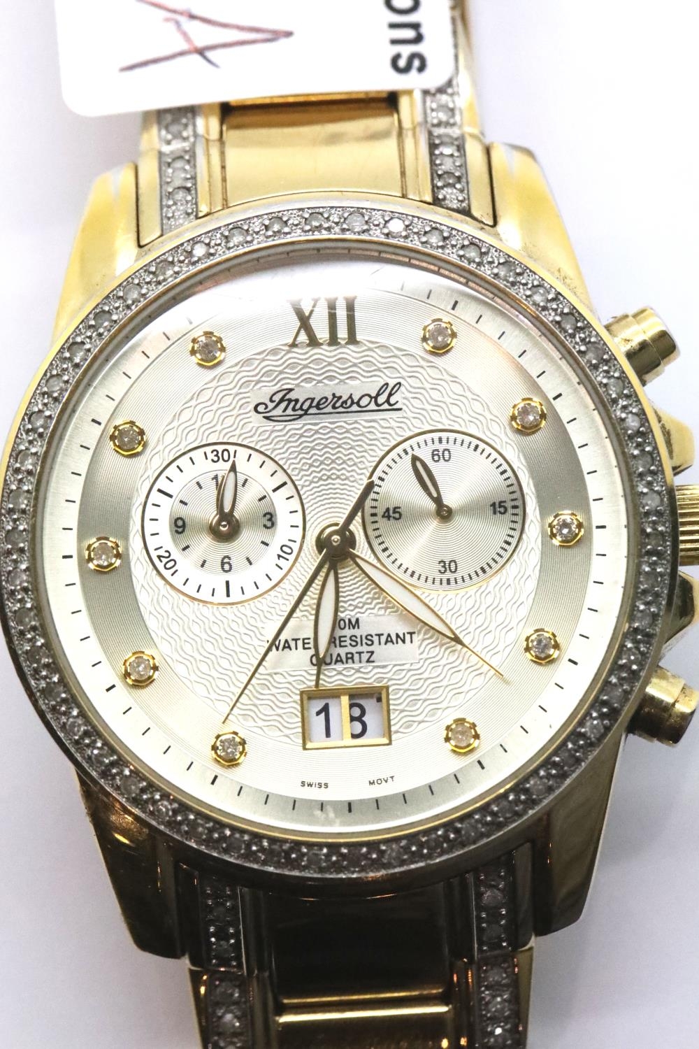 Ingersoll gents diamond set wristwatch on a gold plated bracelet. Not working at lotting. P&P Group 1 (£1+VAT for the first lot and £1+VAT for subsequent lots)